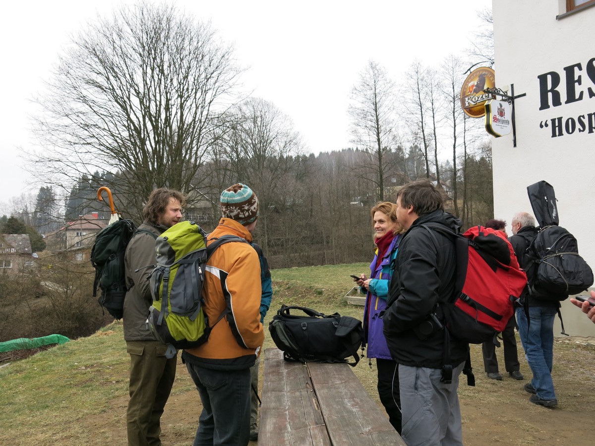 Kolem desáté nás autobus vyklopil na Pastvinách, kde jsme otevřeli hospodu a dali si první pivo. Volným krokem jsme pokračovali do Klášterce nad Orlicí, kde jsme si museli dát další pivo, protože na oběd do hospody U Rampušáka jsme měli povolený příchod až ve dvě odpoledne. Tam už na nás čekal Petr, který mezitím dojel vlakem.