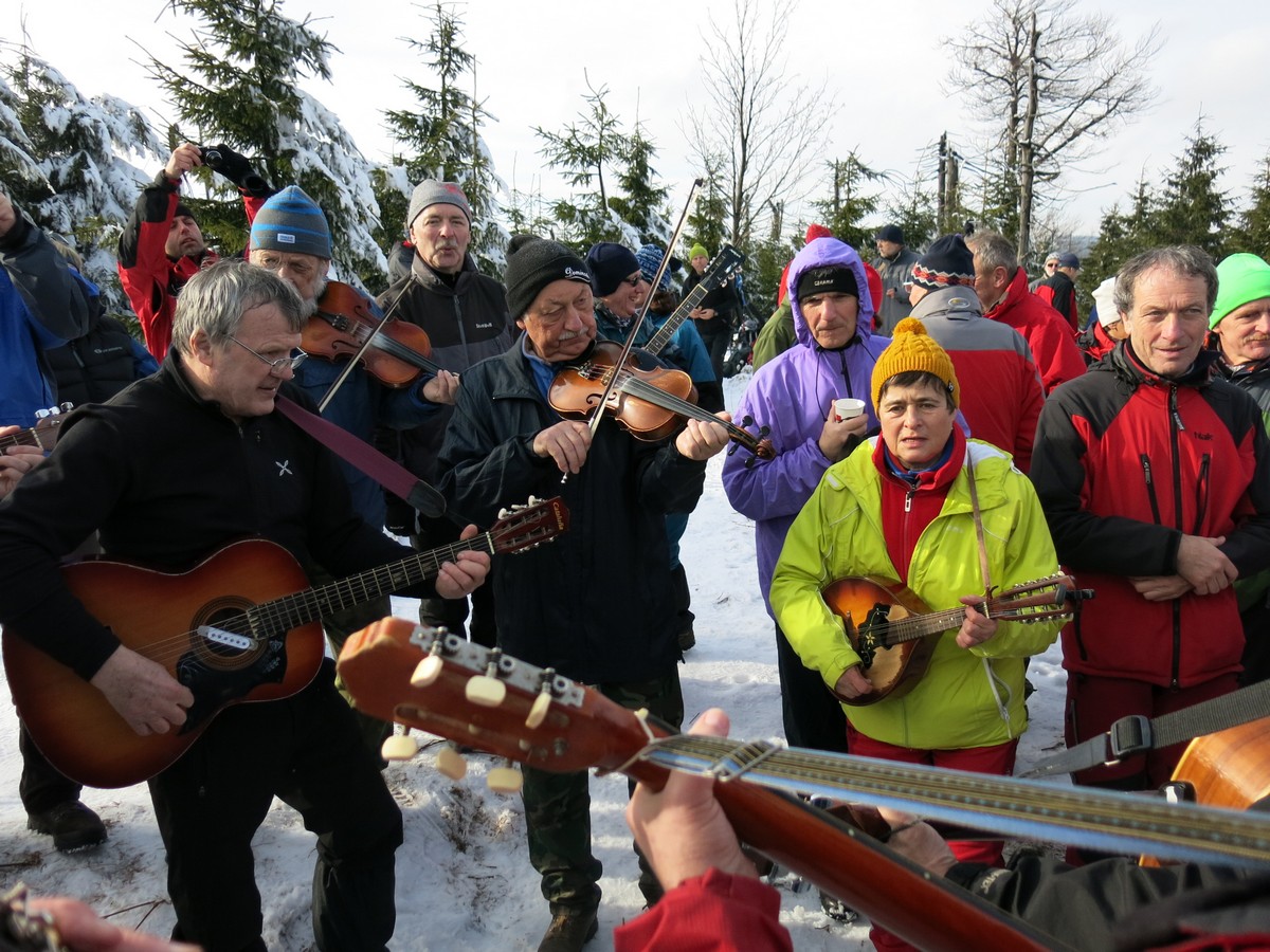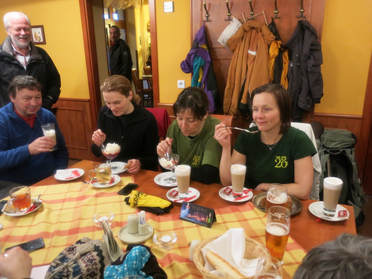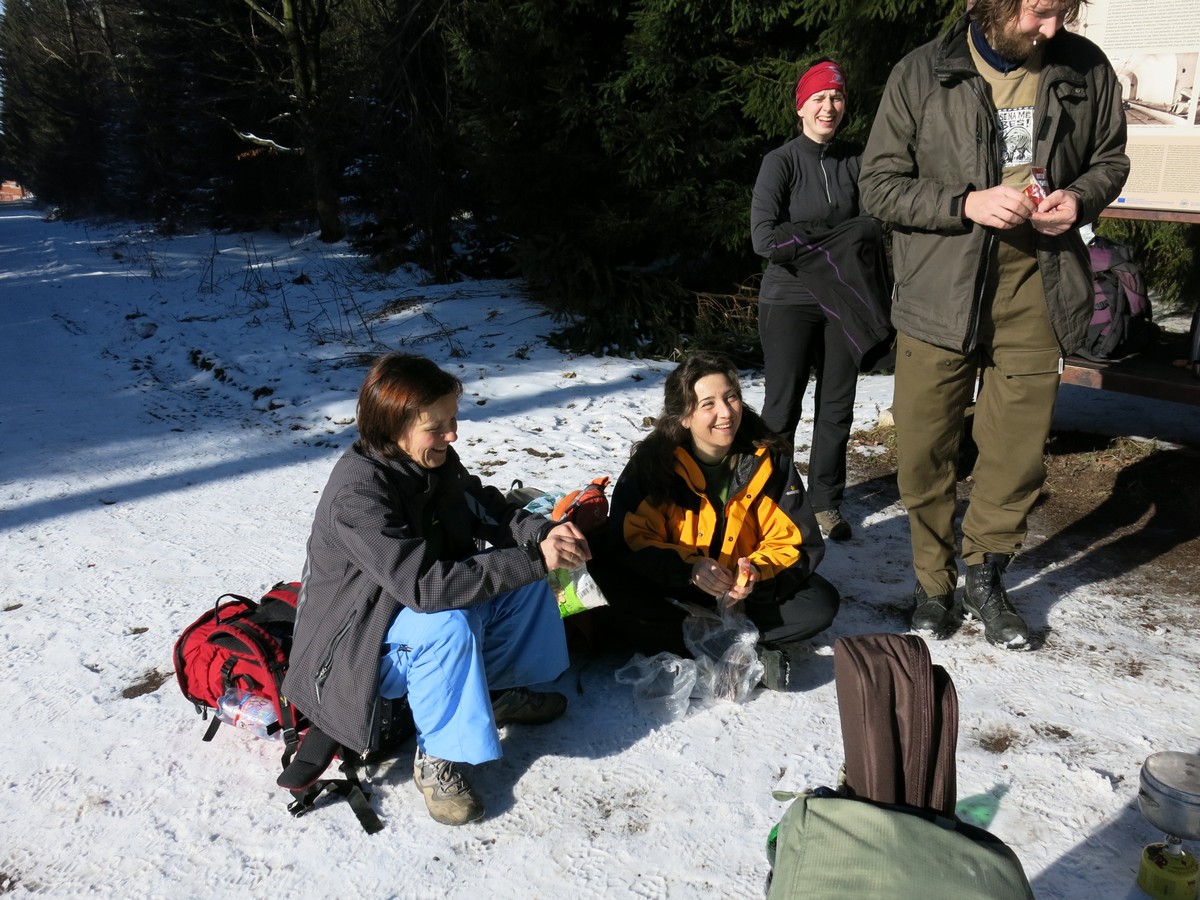 Ráno bohatá snídaně s čerstvou bábovkou a mohli jsme vyrazit do jarního slunečného dne. U pevnosti Hanička jsme provedli generálku Ustřednění a degustaci svařáku a kolem druhé jsme se na Mezivrší ustřednili s ostatními trasami. Tančilo se, zpívalo se, jedlo se, pilo. Od rána indisponovaný Profesor vyrazil stopem na nocleh a my jsme se do Orlického Záhoří spustili po svých. V hotelu nastala humorná scénka "kdo mi to spí v postýlce", aneb se nás hospodský snažil přesvědčit, že klíč od našho manželského hnízdečka si již vyzvedl pan Šimůnek. Byly jsme s Erikou zmateny, neb já žádný klíč neměla. Ukázalo se, že poté, co jméno Hlavatý nefigurovalo na seznamu a Láďovi se nepodařilo hospodského přesvědčit, že je Jiravová, prohlásil se za Šimůnka, což už hostinský akceptoval a klíč vydal. Churavějícího profesora jsme ošetřily a přestěhovaly do jeho pokoje.