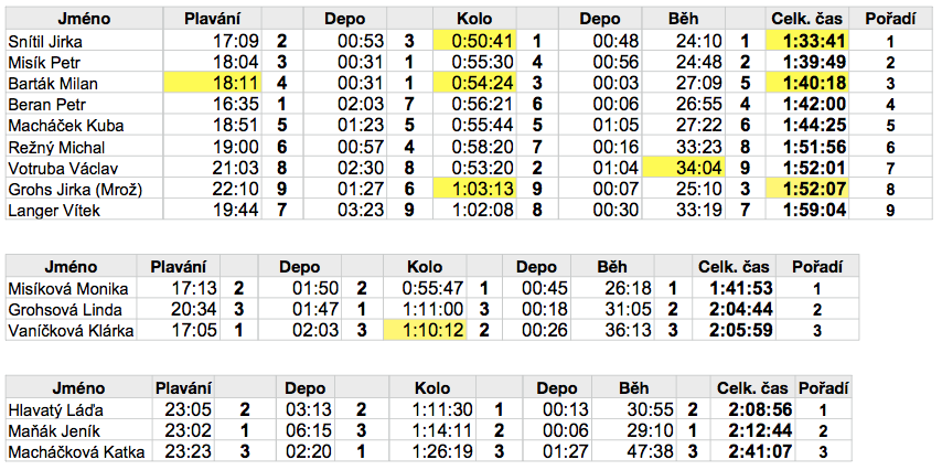 Takže stručně: účastníci - viz tabulka výsledků plus jejich povzbuzovači, maséři, trenéři. Nějaké ta časomíra v podobě Kamči a Budžiho navrch. Kategorie byly pro letošek čtyři. Muži, ženy, senioři a děti. Strategie si závodníci volili individuálně, dle zkušeností a naturelu. Od pravidelné celoroční sportovní aktivity různého druhu, investice do nového vybavení, přes zaměření na problémovou část závodu, po cílenou několikaměsíční přípravu triatlonových disciplín s pobytovým kempem v místě konání závodu, až po oblíbené nedělám celý rok nic, navíc mám sedavé zaměstnání u počítače a kristova léta, takže to dám bez přípravy.