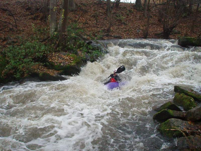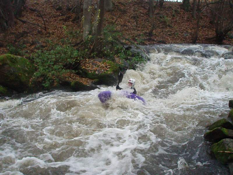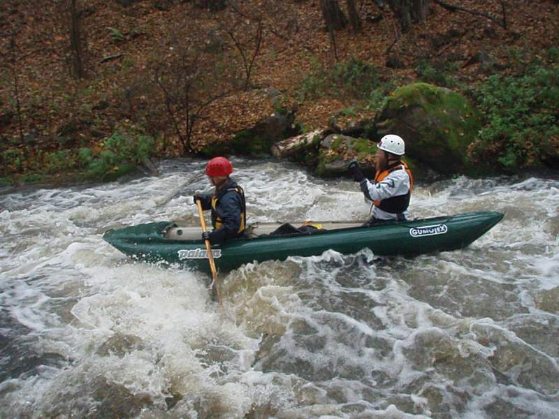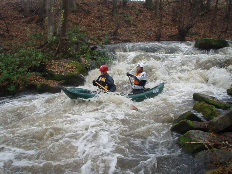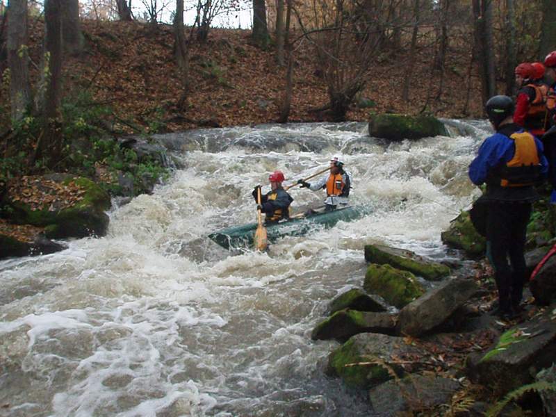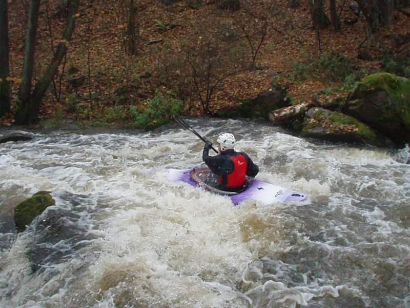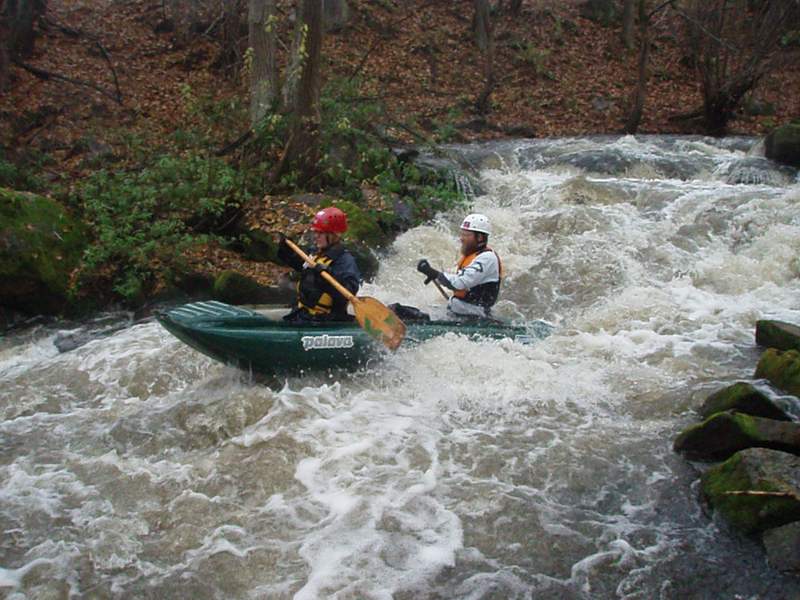 V sobotu jsme snadno našli hráz Ratmírovského rybníku, kde se začíná. A byli jsme tam dokonce ještě před tím, než v ½ 10-té začli pouštět vodu. Stihly jsme si tudíž prohlédnout první dvě kaskádky jak za stavu bez vody, tak i s potřebným průtokem. Vzhledem k tomu, že organisátoři zajistili autobusovou kyvadlovou dopravu vodáků zpět k místu startu, tak jsme neměli ani jinak obvyklé logistické problémy a mohli jsme hned vyrazit na vodu. Stihli jsme to dokonce dvakrát. Poprvé jen nejlepší úsek Malý Ratmírov – Dvoreček a podruhé i s malebným úsekem až do Jindřiše. Musím zde přiznat, že já jsem v obou případech poslední kaskádu před Dvorečkem přenesl, ale ostatní se do vln a válců kataraktu obtížnosti cca. WW3+ s nadšením vrhli a v obou případech všichni úspěšně. Inu mládí :-))) .