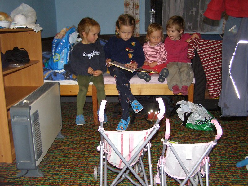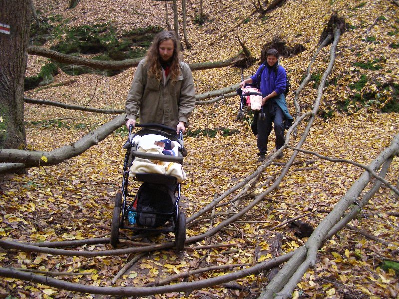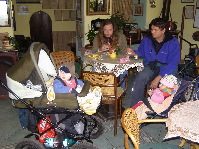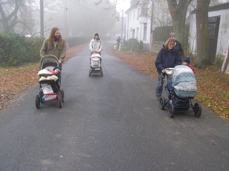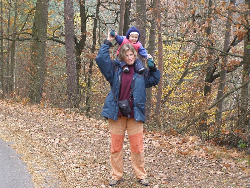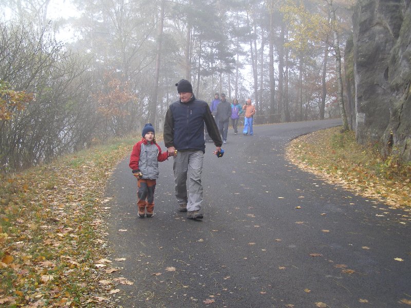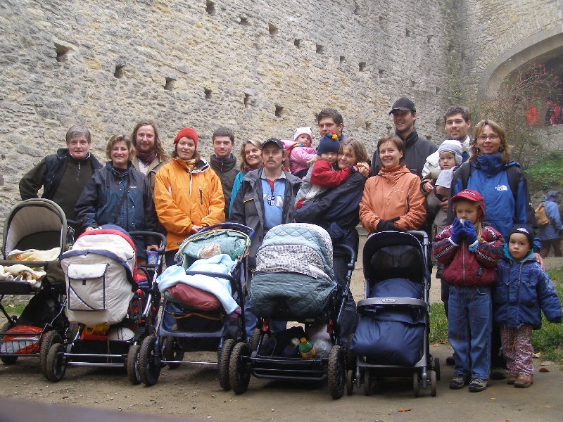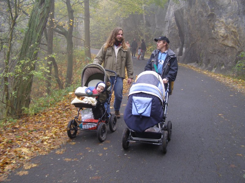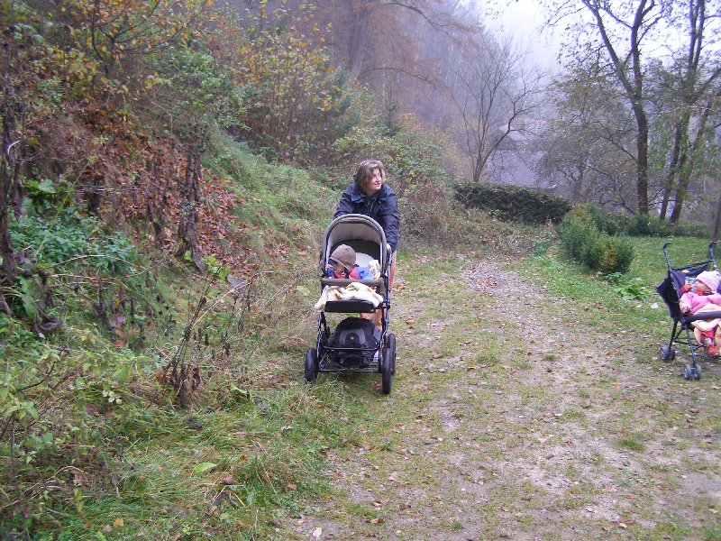 Díky Alče jsme si užili prodloužený víkend v Kanině na Kokořínsku. Krajinu sice halila hustá mlha, ale to nás neodradilo od hromadného výletu na Kokořín ani od terénního výletu přes klády a kamení do Mšena s příjemným posezením v restauraci s dětským koutkem a v báječné cukrárně tamtéž. Také už víme, že ne všechna kolečka kočárků jsou stavěna na náročnější terén...