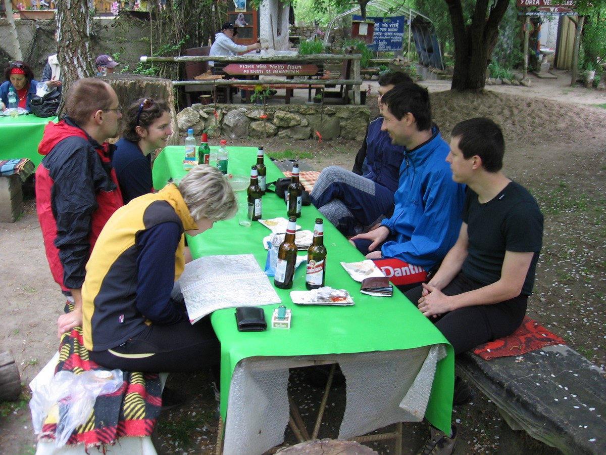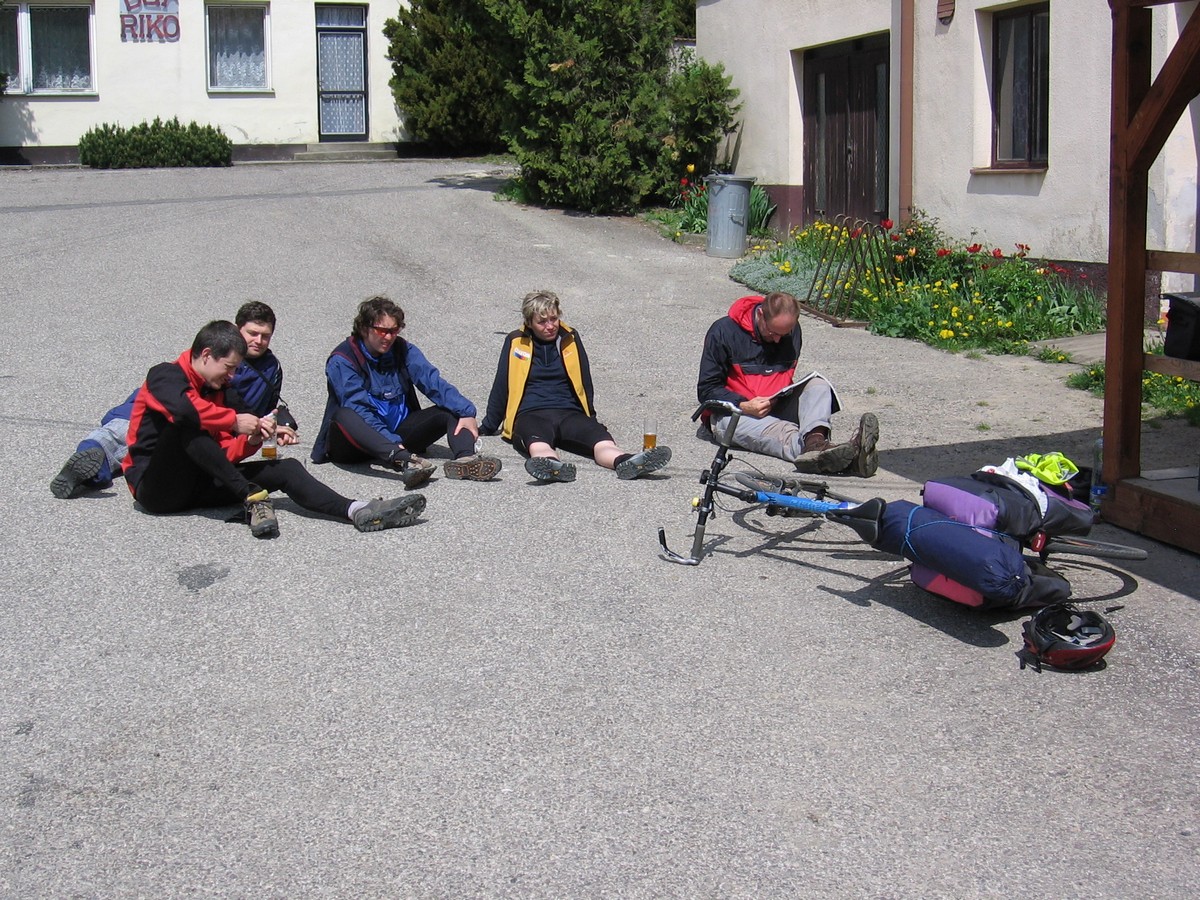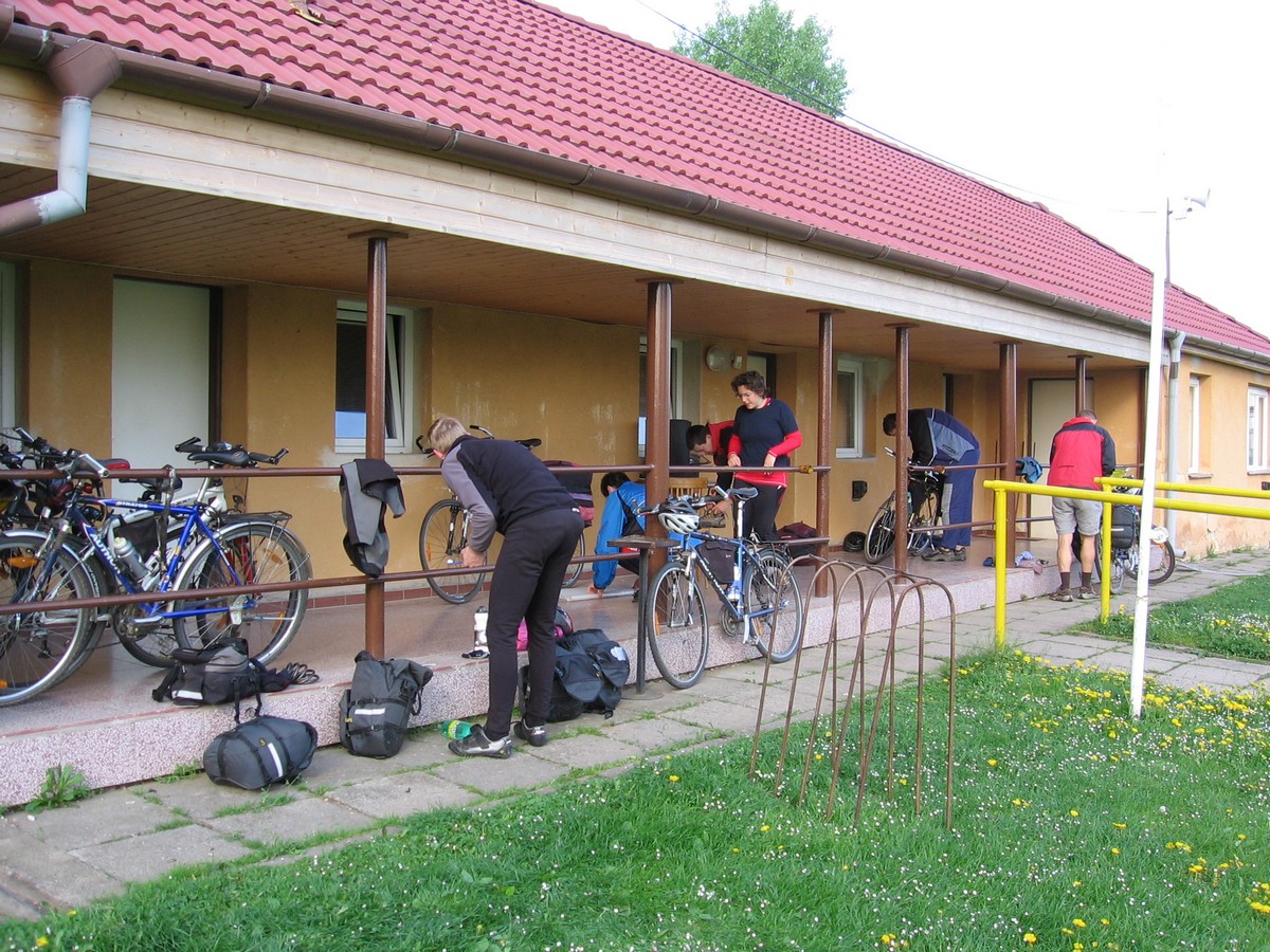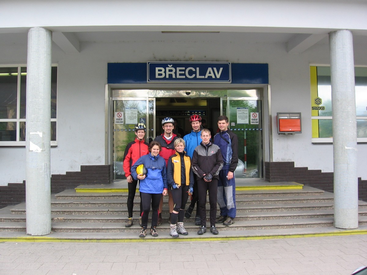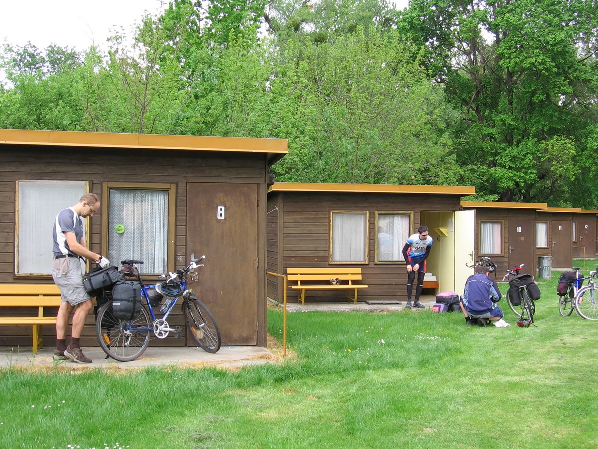 Bylo to asi takto. Protože bychom se nevešli do vlaku v 18:23 všichni s koly, rozdělili jsme se na dvě skupinky: odjezd v 15:33 - Monika, Káča, Petr, (Milan přistoupil v Olomouci) a skupina v 18:23 - Miisha, Tomáš, Vašek. Jenže nosič lístků Miisha se jaksi opozdil, tuším, že se vracel pro ty lístky, a tak tento superspoj odjel bez bezmála poloviny naší výpravy. Šikovní inženýři však nelenili a našli si spoj pozdější. Tedy zdárně dorazili, jen je to stálo o trochu víc. Po pivku na spaní jsme se ubytovali v útulných chatičkách břeclavského kempu.