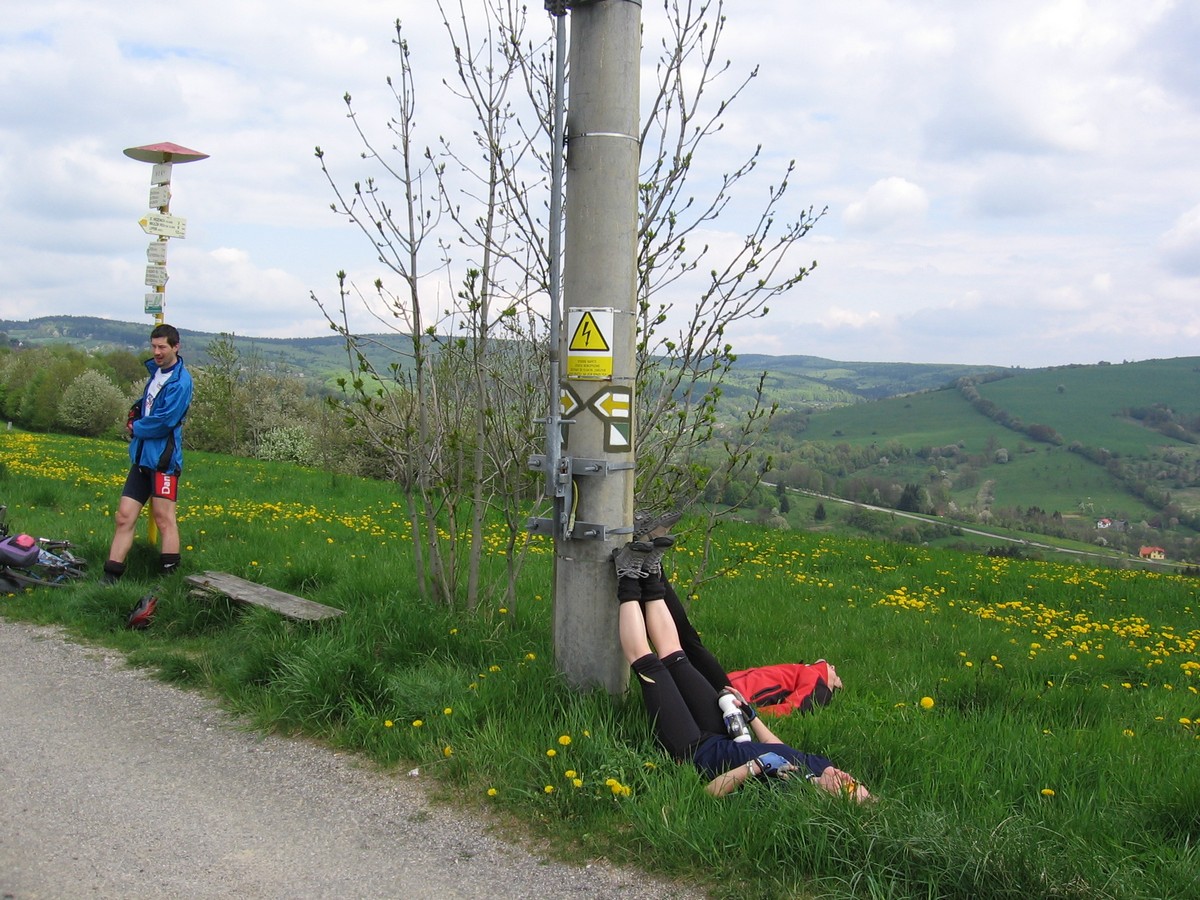 Projeli jsme Radějovem (tam je mimo jiné jedno velké rekreační středisko, které využívá ČC pro své eventy, pozn.red.), Petr s Tomášem si ještě udělali zajížďku, která vedla blíže ku hranicím, a krajina se pomalu začínala vlnit a pak zvedat k Bílým Karpatům. Projeli jsme vesničkami Hrubá Vrbka, Malá Vrbka, Kuželov (větrný mlýn), kolem Velké nad Veličkou, Strání a Březové do údolí Lopeník a nahoru na Mikulčin vrch. Oproti ránu to byla úplně jiná krajina, všude opuštěné sjezdovky a lana vleků, ryze horské prostředí. Trochu nám trvalo, než jsme se rozkoukali, ale pak kluci našli super chatku u hotelu Arnika, kde jsme na ten večer spočinuli. Tedy předtím jsme se ještě pořádně zkofolovali. :-)