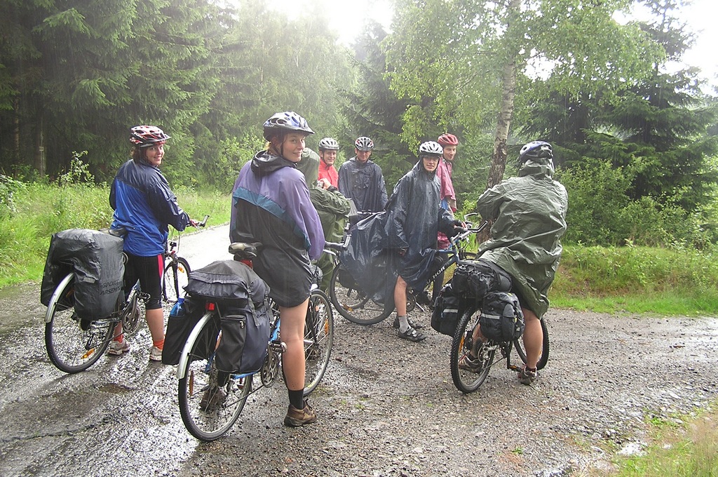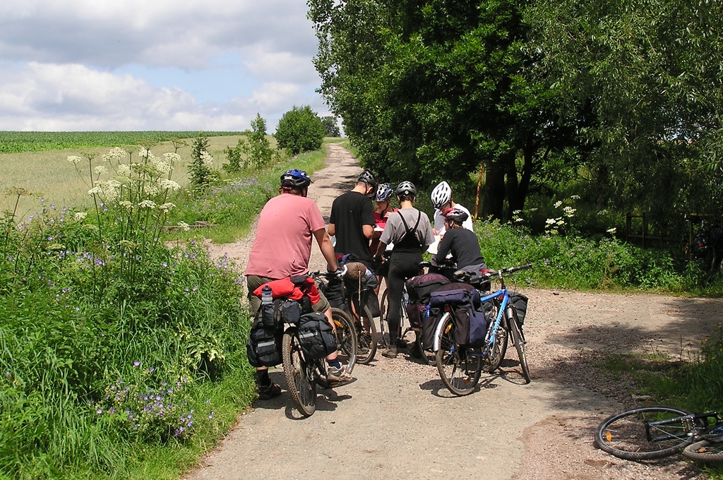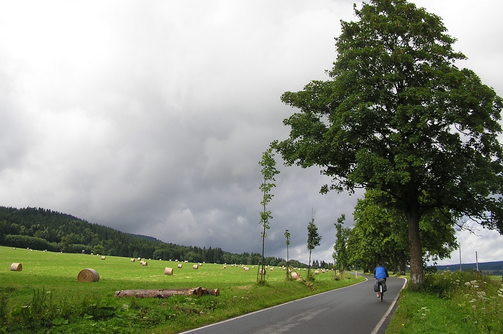 A pak už zase jedeme. A jedeme PODLE TĚCH VAŠICH PRAVIDEL. Pro nezasvěcené: PODLE TĚCH VAŠICH PRAVIDEL se jezdí tak, že když někam vede přímá cesta, třeba po silnici a po rovině a měří třeba 2km, tak se odbočí a jede se 10 km do kopce polňačkou a pak se dva km sjíždí brutálním srázem dolů, ale výsledek je, přátelé, opravdu nesrovnatelný. Dojedete o dvě hodiny později, naprosto strhaný do toho samého bodu. Ale najednou…. nebe se rozestoupilo, slunce, teplo, sundávání nandaných pláštěnek, štěstí, radost. Jen chvíli - jedeme dál. Náchod – turistická ubytovna, poloteplá sprcha, mučení slimáků, daleká hospoda, jídlo, pití, spacák, spánek, spánek. Při této hrůzné etapě nikdo nakonec nezemřel, nepočítáme-li slimáky, vosy a komáry- ujeli jsme 82 km.