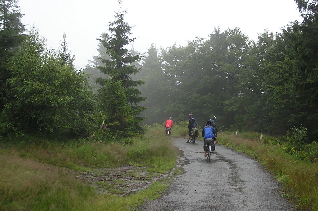 Hned ráno se vydáváme na snídani do místní sámošky, čímž si o hezké čtyři kilometry prodlužujeme naši denní trasu (která je i bez toho pološílená), protože samoobsluha leží zcela proti směru naší další cesty. Všichni snídáme – já suché rohlíky. Jen co zvolna vyjíždíme, začíná zvolna pršet. Poté co ještě volněji začínáme stoupat do dnešního prvního zabijáku, už neprší zvolna, ale docela slušně chčije. A do toho všeho Jéňa Petřík blije. Doslovně. Pak ještě jednou cestou do toho kopce a pak ještě cestou dolů. Opravdu vrcholný zážitek na kole. A chrti furt jedou. Staví se akorát na polívce a zas jedou dál. Už jsem říkal že pořád chčije?? Tak. Teď už i chrty déšť srazil ze sedel, takže pod nějakým přístřeškem čekáme, než to nejhorší přejde. Přístřešek je u hospody s penziónem, takže ………… Hned, jak déšť jen o trochu povolí, nasedají chrti na kola a vyráží. Na chvíli se se utišuje i déšť a … hned potom se před námi otvírá Zabiják II, tedy jen podle pořadí jinak je to čistá za jedna. Stoupání na Masarykovu boudu ve mně opravdu budí čirou nenávist k tomu stroji, kterému dupu do..., tedy šlapu do..., nee tak tedy zlehka našlapuji do pedálů. Výhoda mého posledního umístění v peletonu je to, že ti přede mnou už tu sprchu nestihli, neb seděli na obědě v Masarykově boudě. Tam docházím se značnou ztrátou v oblečení, které už ani nemá cenu ždímat.