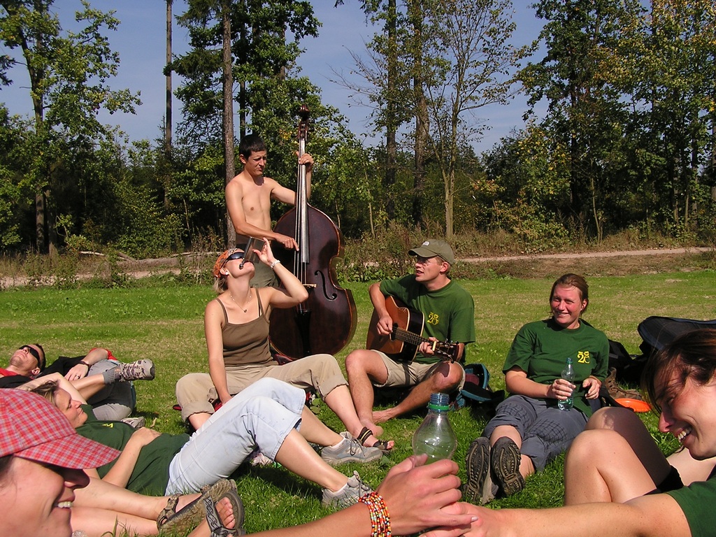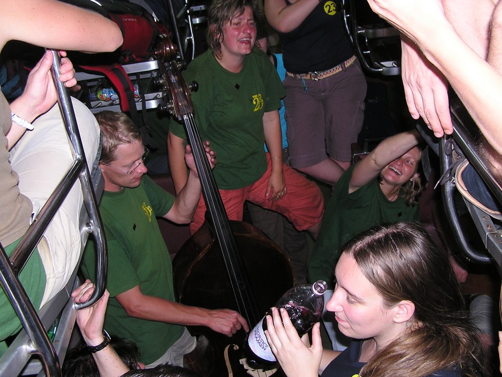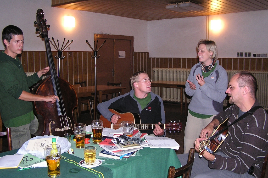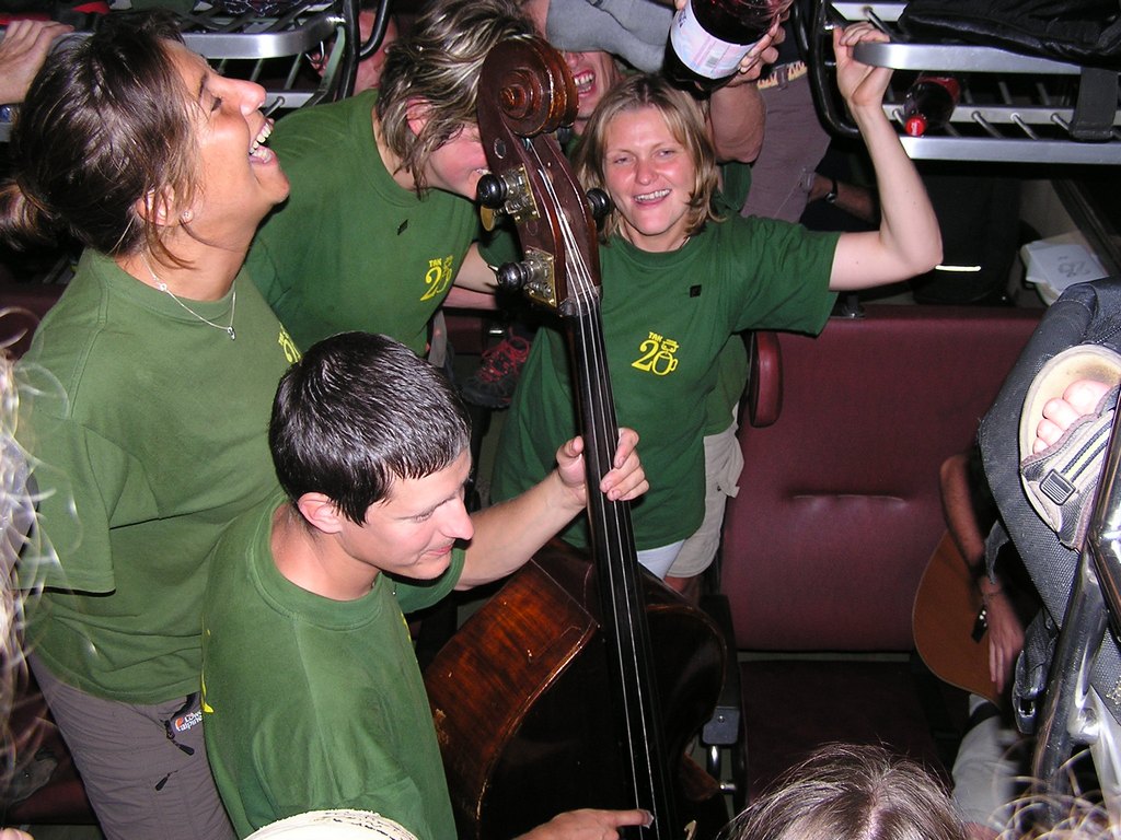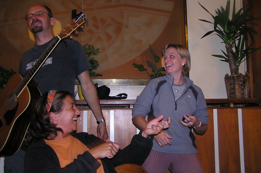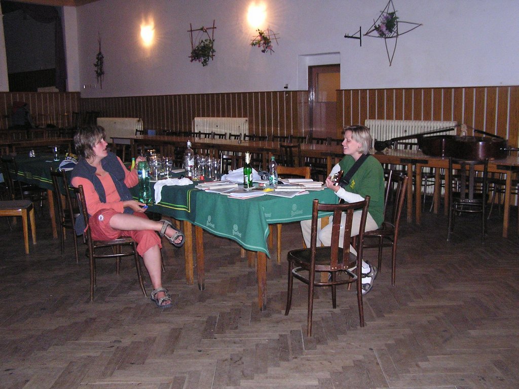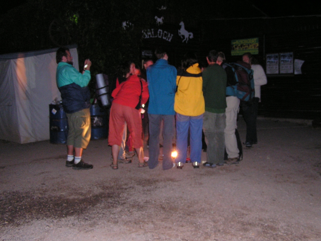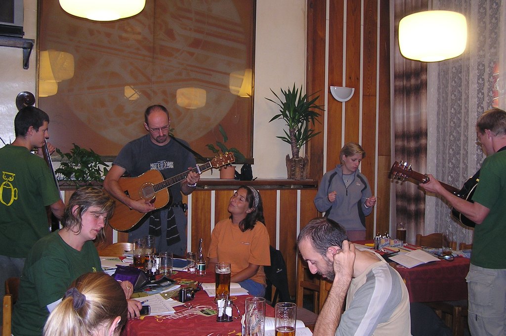 Po organizačních záležitostech zbyl čas i na několik písní, ale, jak už zaznělo, personál saloonu nám nebyl nakloněn, a tak jsme museli v poměrně časných hodinách lokál opustit. Ale protože jsme si chtěli pana kuchaře udobřit a přece jen mu udělat radost, zazpívali jsme mu přede dveřmi několik písní táborových ohňů. My všichni kamarádi jsme se semkli do těsného kroužku, rameno na rameno, uprostřed jsme zažehli čelovkový oheň, který utěšeně plápolal bílým a červeným světlem, a svorně jsme zapěli takové hity jako Igelit, Generační, Přátelé Zeleného údolí a mnohé jiné. Adresát našeho snažení byl tímto vším zřejmě velmi dojat, ale jako správný chlap nechtěl svou slabost před námi ukázat, a tak i nadále vůči nám vystupoval poměrně hrubě a navíc slzy dojetí zřejmě zaháněl i něčím silnějším k pití. Když jsme seznali, že je úplně mimo a že by nám v návalu pozitivních emocí nakonec mohl i ublížit, táborák jsme uhasili a šli jsme spát.
