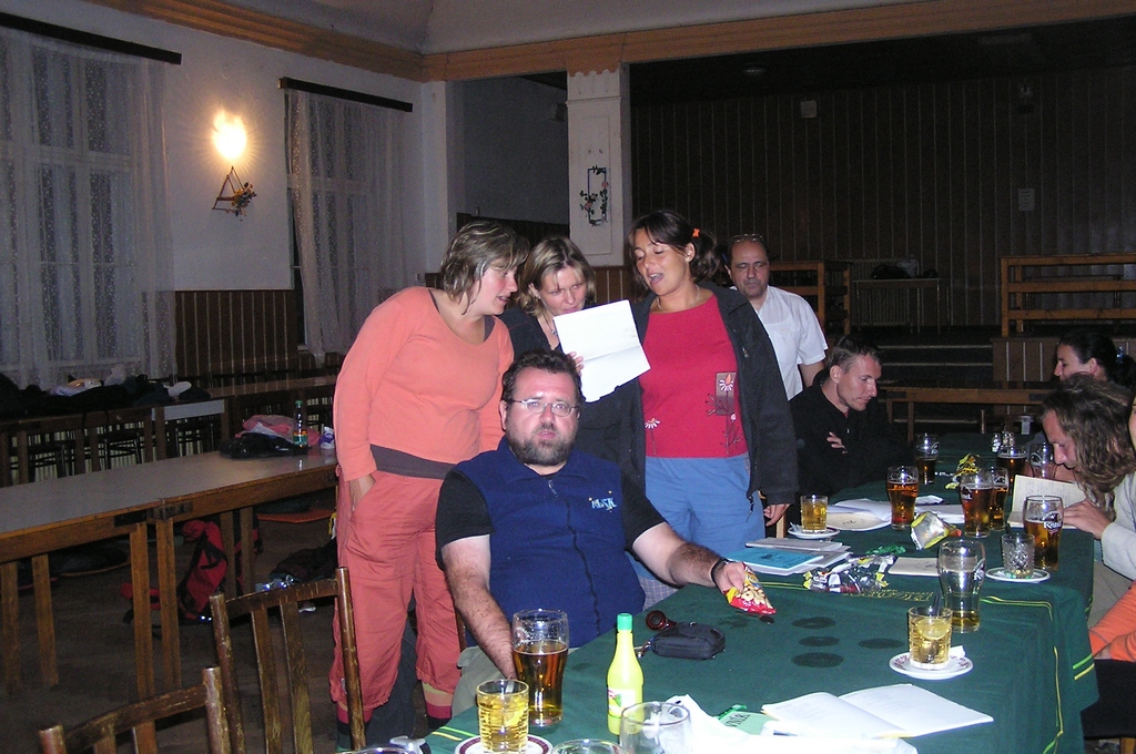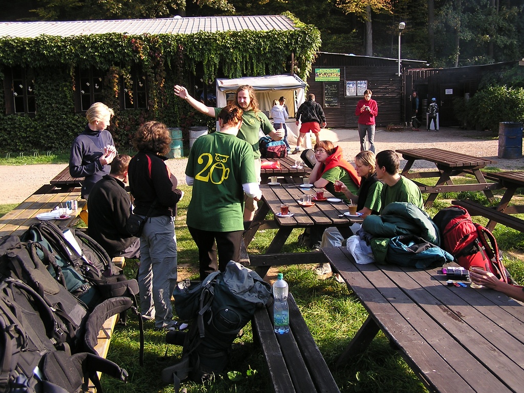 Ráno jsme dostali vynadáno, že snídaně byla od osmi, a my jsme se začali trousit až v devět. A taky nejspíš proto jsme na ty párky čekali do půl desáté. Ale tato drobnost nám po vydařeném večeru (a celé Stezce) nemohla zkazit náladu. Ostatně bylo dost práce s připravováním stezkového zakončení. A o něm si ráda nechám vyprávět od někoho, kdo se ho zúčastnil...