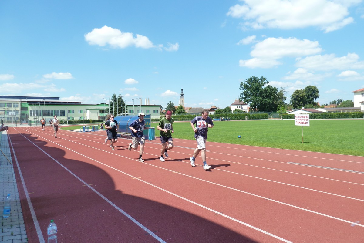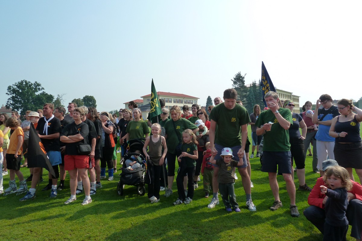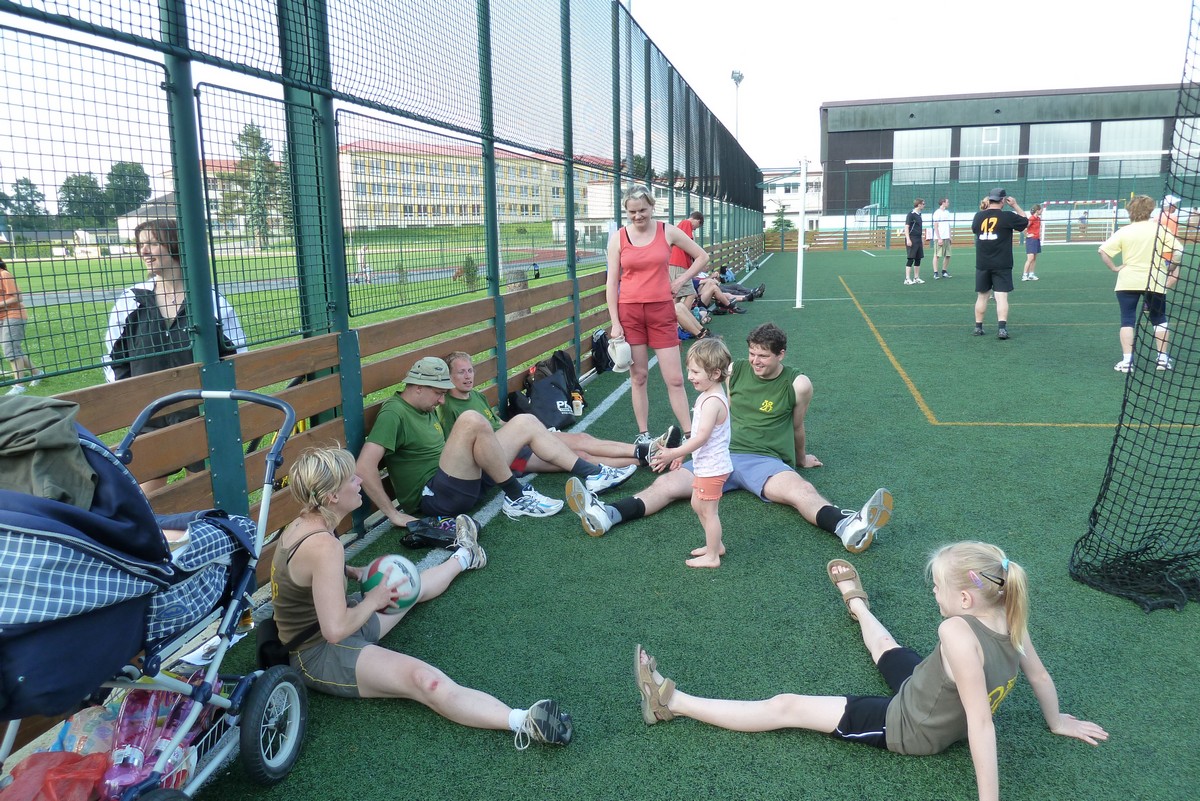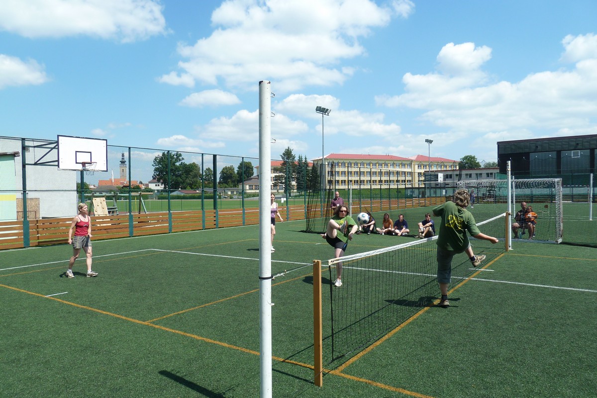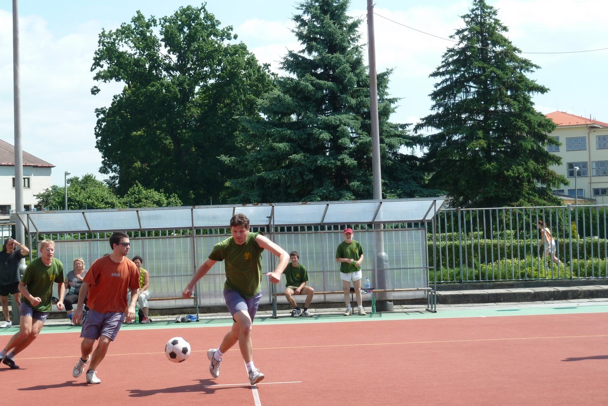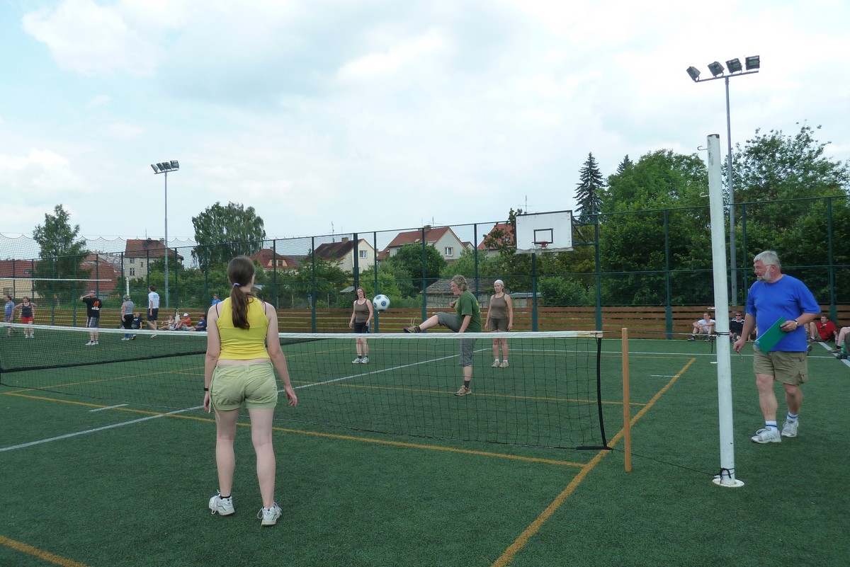 atraktivní vlajkovou četou. Po nezbytných instrukcích se rozjely soutěže – pro víceboj byly opět vyčleněny časové bloky, což se velmi osvědčilo, mezitím postupovaly jednotlivé sporty – volejbal, nohejbal, fotbal, ping pong, pétanque, kuželky a nezapomnělo se ani na dětské soutěže. Zvláštní pozornost si zaslouží fotbal, kde se naše děvčata ukázala být důstojnými soupeřkami leckterých mužských týmů a v každém zápase dala alespoň jeden gól. Sedmá disciplína víceboje byla letos obzvláště vypečená – jízda na invalidním vozíku.