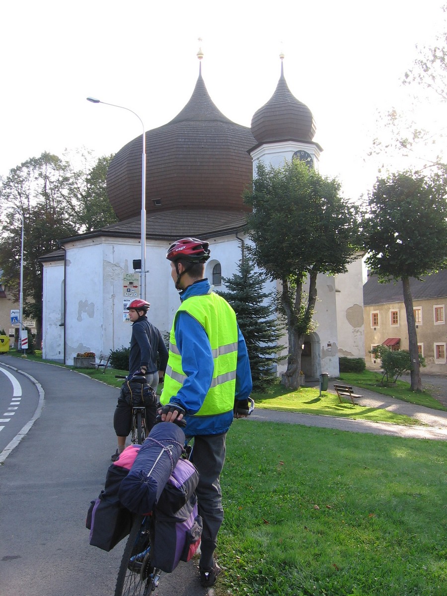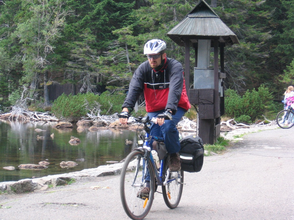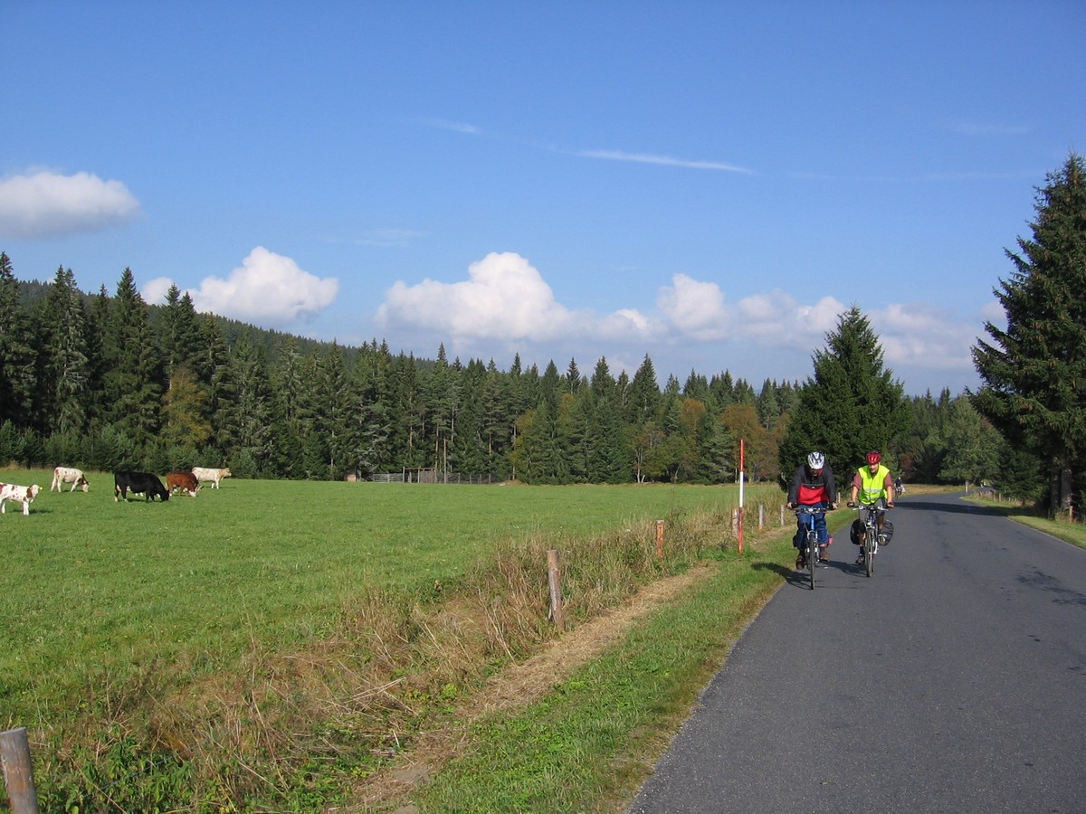 Ve středu večer jsme se vydali vlakem směrem západním. Rychlíkem do Plzně a odtud motorákem do Domažlic. Dál to vlakem nešlo, takže jsme v nočních hodinách nasedli na kola a vydali se tmou směrem ke kempu Babylon, kde jsme nám Milan rezervoval dvě chatky. Ráno jsme vstali do nepříliš vlídného počasí (soudíc dle fotek) a vydali jsme se k oficiálnímu začátku této etapy – na nádraží Česká Kubice. Sychravým počasím jsme pokračovali po silnicích přes vesnice Maxov, Všeruby, Uhliště k nýrské přehradě a odtud už se po cyklostezkách noříme do Šumavských hvozdů. Zadní Chalupy, Lovečná, Černé a Čertovo jezero, Železná Ruda. Prý jsme tam všude byli... Železná Ruda nás uvítala turistickým mumrajem, samozřejmě nechyběli nezbytní Vietnamci a trpaslíci, ale to už nás nemohlo rozhodit. Našli jsme si ubytování ve vietnamské ubytovně - pětilůžkový pokoj jsme sdíleli i s našimi koly, bylo tu poněkud těsno, ale hlavně, že máme kde spát. Ve sprše jsme měli dost obavy, zda nás něco nesežere, ale i to jsme přežili. Kde jsme večeřeli si nepamatuju, ale dobře si pamatuju večírek v cukrárně Charlotta, kde jsme ochutnali snad vše, co měli v nabídce, vč. barevných koktejlů.