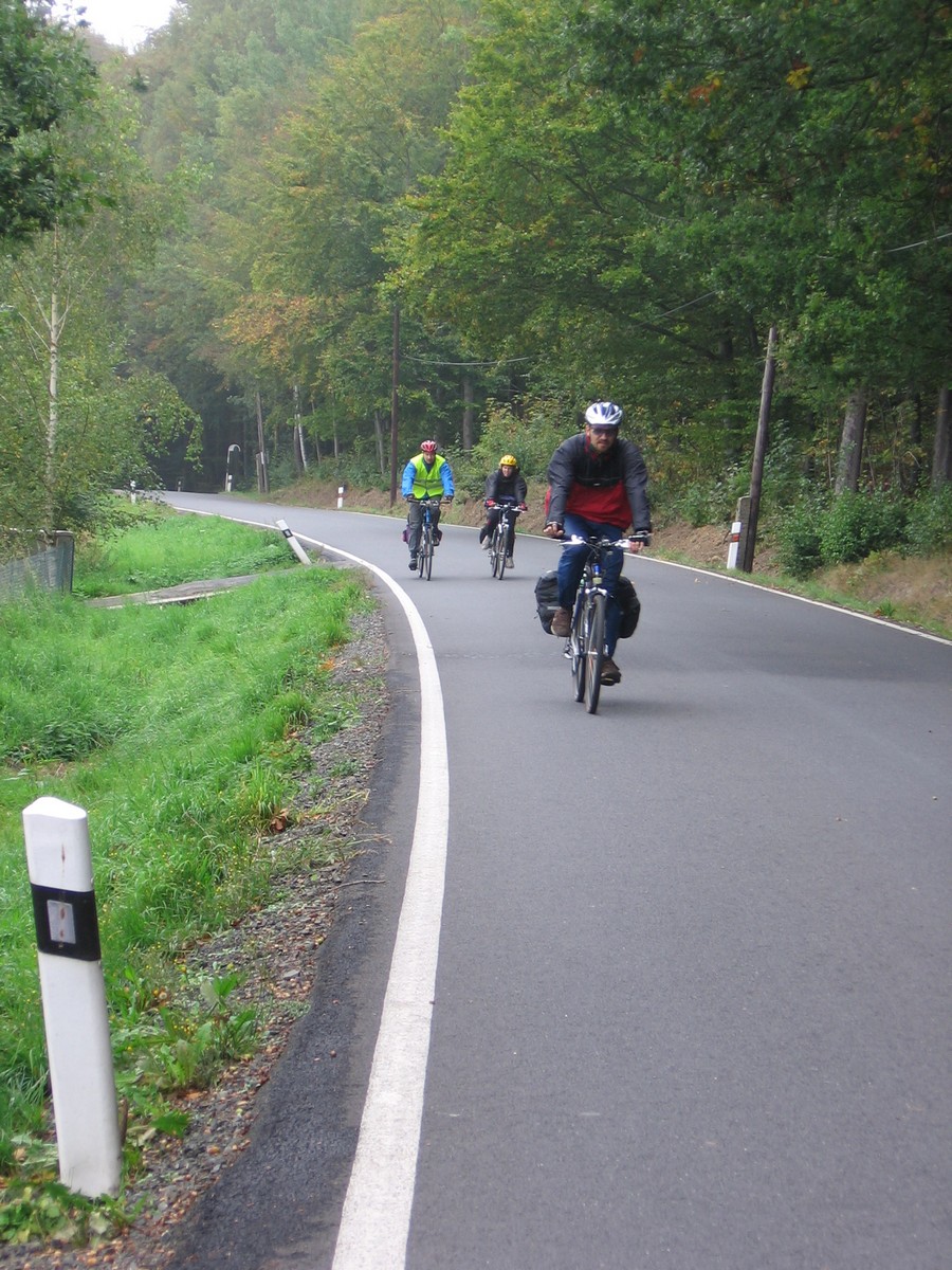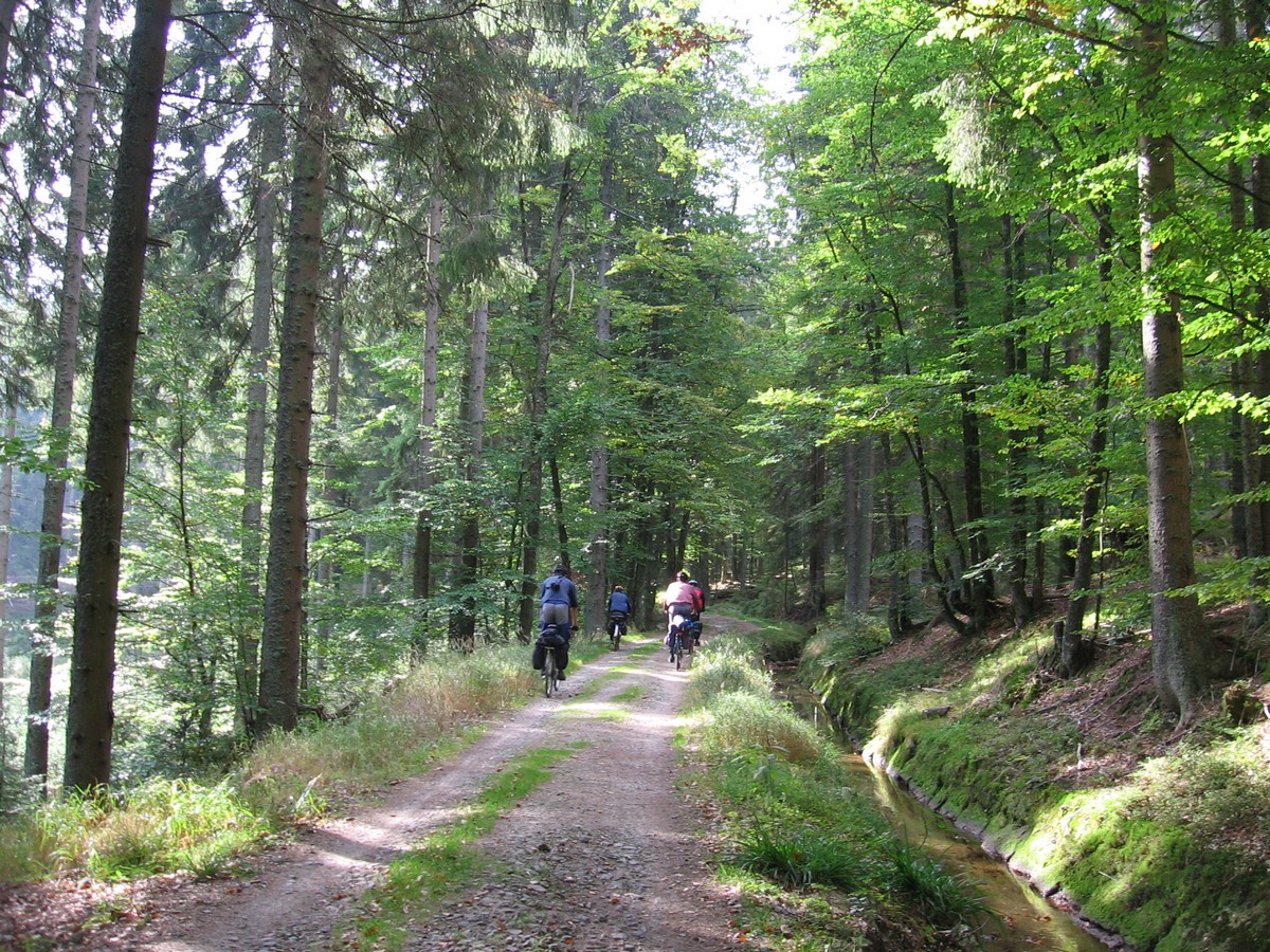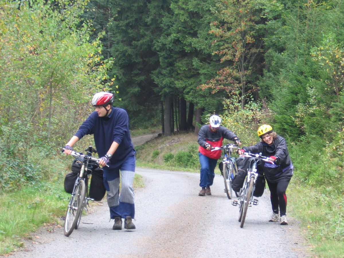 Ve středu večer jsme se vydali vlakem směrem západním. Rychlíkem do Plzně a odtud motorákem do Domažlic. Dál to vlakem nešlo, takže jsme v nočních hodinách nasedli na kola a vydali se tmou směrem ke kempu Babylon, kde jsme nám Milan rezervoval dvě chatky. Ráno jsme vstali do nepříliš vlídného počasí (soudíc dle fotek) a vydali jsme se k oficiálnímu začátku této etapy – na nádraží Česká Kubice. Sychravým počasím jsme pokračovali po silnicích přes vesnice Maxov, Všeruby, Uhliště k nýrské přehradě a odtud už se po cyklostezkách noříme do Šumavských hvozdů. Zadní Chalupy, Lovečná, Černé a Čertovo jezero, Železná Ruda. Prý jsme tam všude byli... Železná Ruda nás uvítala turistickým mumrajem, samozřejmě nechyběli nezbytní Vietnamci a trpaslíci, ale to už nás nemohlo rozhodit. Našli jsme si ubytování ve vietnamské ubytovně - pětilůžkový pokoj jsme sdíleli i s našimi koly, bylo tu poněkud těsno, ale hlavně, že máme kde spát. Ve sprše jsme měli dost obavy, zda nás něco nesežere, ale i to jsme přežili. Kde jsme večeřeli si nepamatuju, ale dobře si pamatuju večírek v cukrárně Charlotta, kde jsme ochutnali snad vše, co měli v nabídce, vč. barevných koktejlů.