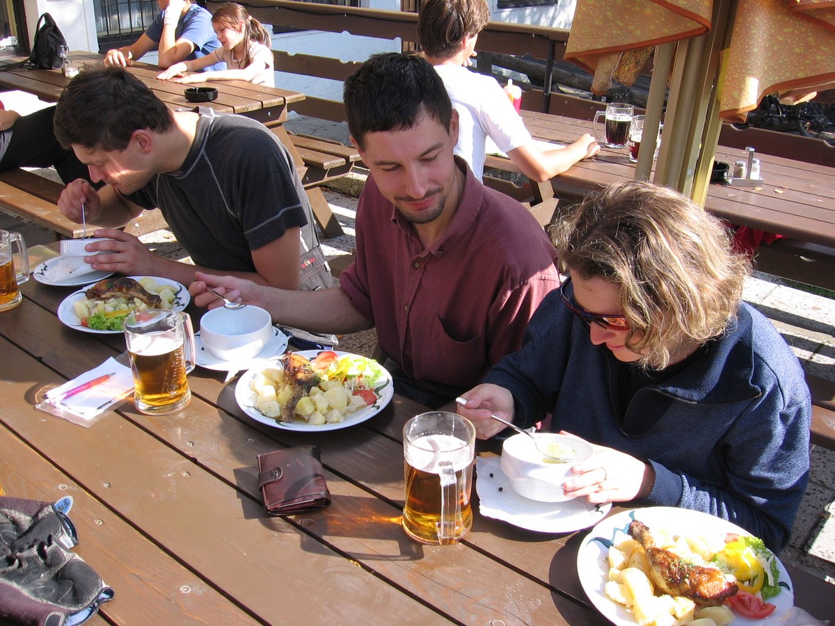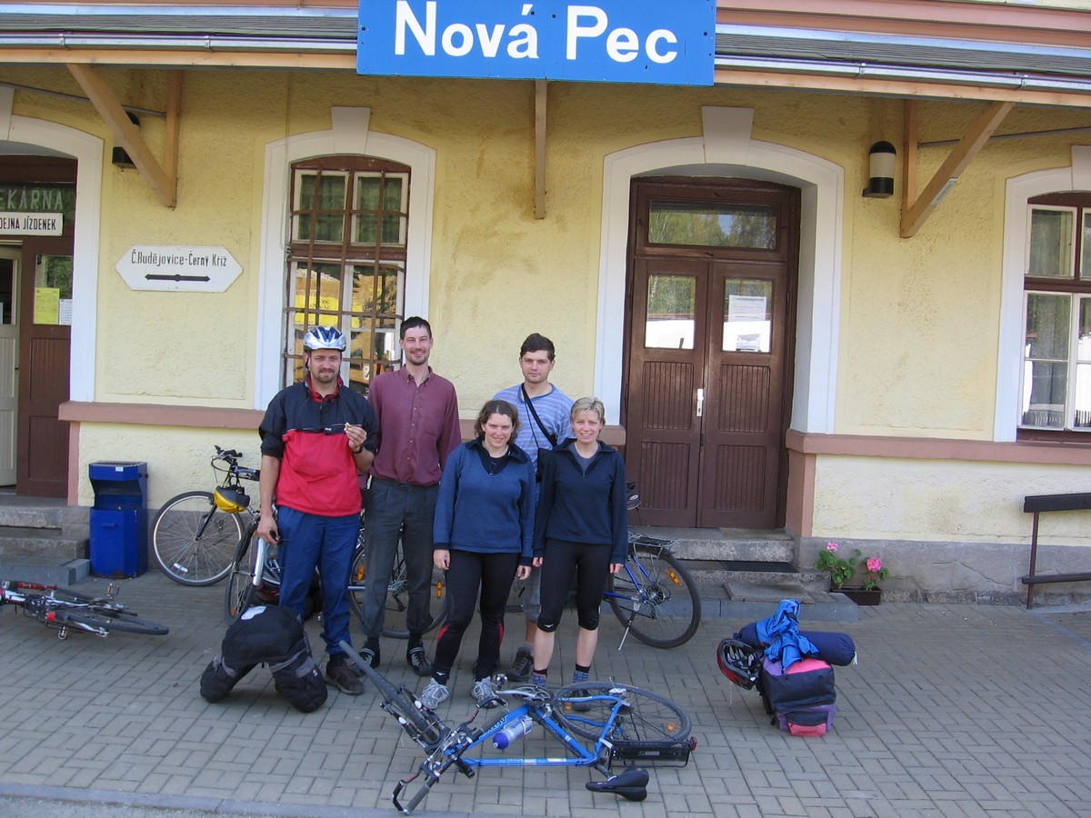 Ráno jsme vyrazili po cyklo přes Nové údolí a Rosenaerův památních směrem na Hlučinu, kde jsme se napojili na Schwarzenberský kanál, který nás dovedl až do Nové pece. Tady jsme sotva stihli pivo a někteří i oběd, narychlo fotku před nádražím (to, co má Míša na fotce v ruce, je smažák od oběda) a už nám jel vlak. Cesta motorákem do Budějovic byla velmi romantická – rozuměj dlooouhá, z Budějovic už standardní.