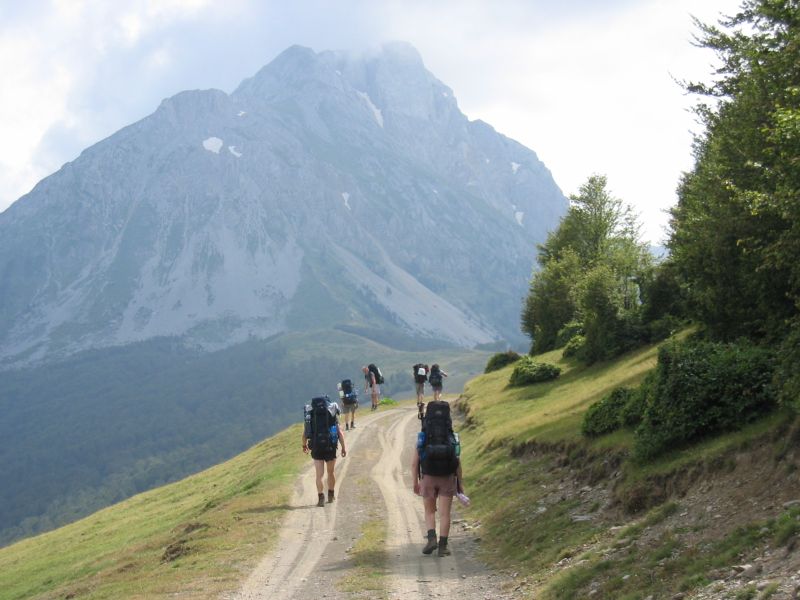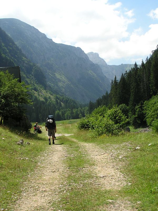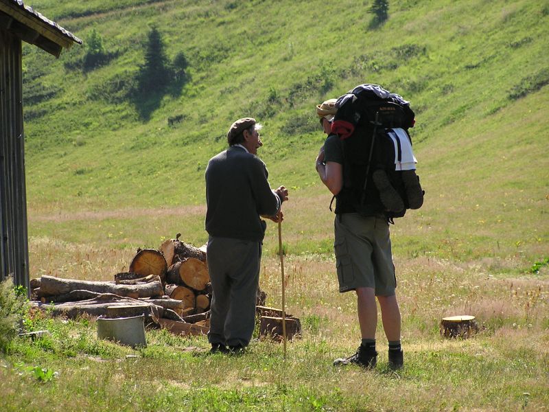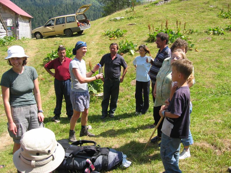 S těžšími žaludky a lehčími batohy pokračujeme kolem katunů, kde opět probíhá družba s místní velkou rodinou, pijeme jejich pivo, kyselé mléko, naši slivovici a po této zničující smršti pokračujeme v pražícím slunci do kopce směrem k jezeru Ursulovačko, kde hodláme přenocovat. Cestou nás doprovází asi dvanáctiletý kluk Štefan. Mluví dobře anglicky a jeho výřečnost nás v odpoledním žáru a prudkém stoupání ničí. Při loučení nás ještě varuje před nebezpečím hor (medvědi, rysi, lišky, zmije, myši,...) a nechává nás svému osudu. Jezero Ursulovačko se nám najít nepodařilo (podle stopařů jednoznačná chyba v mapě), ale místo na spaní je luxusní: palouk s výhledem u ledového potůčku, který vytéká ze sněhového splazu nad námi. Večer si opakujeme zásady chování při setkání s medvědem a usínáme pod širým nebem.