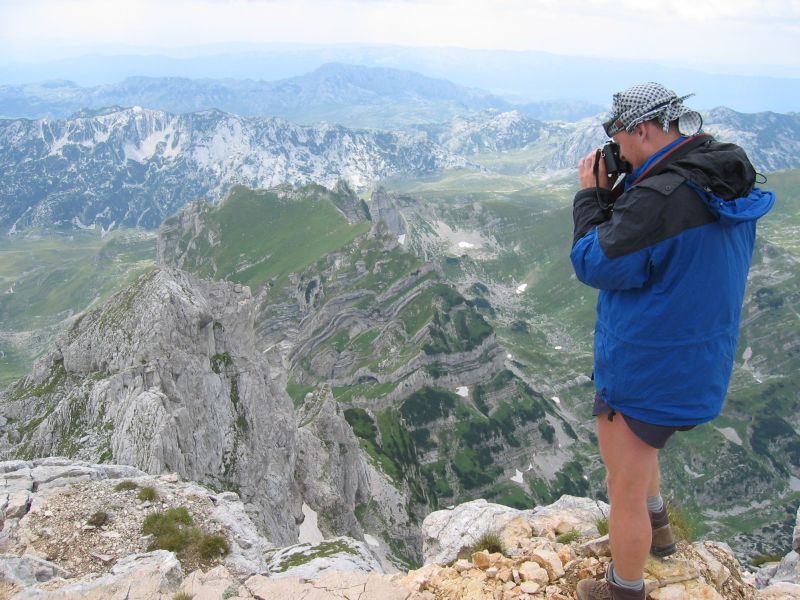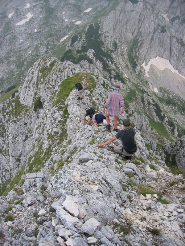 U stanů nás zastihuje opět déšť, takže další program opět nezbývá než vyřešit ze spacáku. Ve tři hodiny odpoledne přece jenom vyrážíme do sedla Velka Previja, kde se těšíme na výhled na opravdový ledovec s opravdu půvabným názvem Debeli namet. Cesta je příjemná, zejména se dobře stoupá s tím čokoládovým pudingem v břiše. Za necelou hodinku jsme opravdu v sedle a koukáme na druhou stranu do kotle s ledovcem (špinavý sněhový flek) a na masiv vrchu Šljeme a Savina kuku. Chvíli jsme zvažovali, zda jít na skalnatý a nevlídný Terzin bogaz nebo na zelený Južny Medvěd. Pouhým pohledem jsme zhodnotili, že lepší se nám zdá Medvěd, ovšem zdání klame a po chvíli chůze po ostrém ale zatravněném hřebeni jsme se prodírali kosodřevinou, abychom se octli na ostrém ale skalnatém hřebeni. Medvěda jsme ale udolali, odměnou nám byl pohled na Sinjajevinu a ploché údolí po Durmitorem a čekal nás poslední velký sestup letošní výpravy. Šli jsme dlouho. Hory se nám ještě předváděly ve večerním sluníčku a dotírala na nás melancholie zítřejšího sestupu z hor. Večer jsme měli žranici - likvidovali jsme poslední železné zásoby, druhý den už nás čekal jen dvouhodinový sestup do civilizace. I Pajdovi jsme všelijak podstrojovali, abychom mu alespoň nějak vynahradili tu chystanou zradu psí duše.