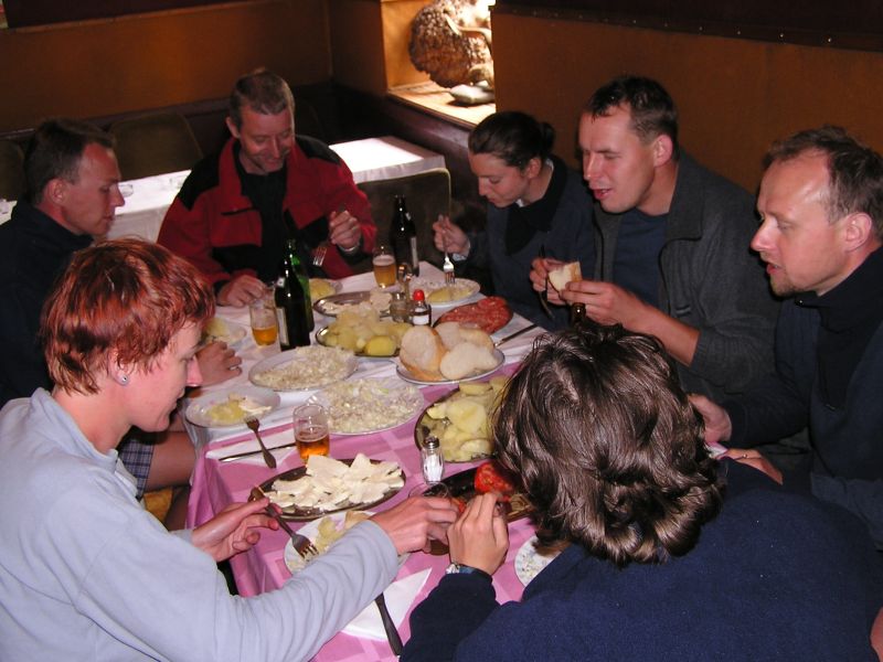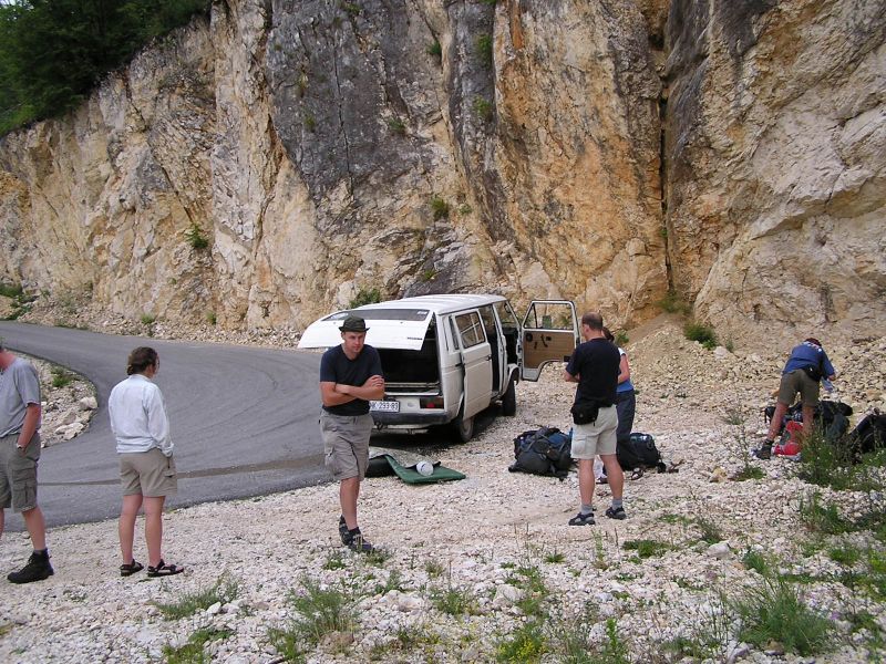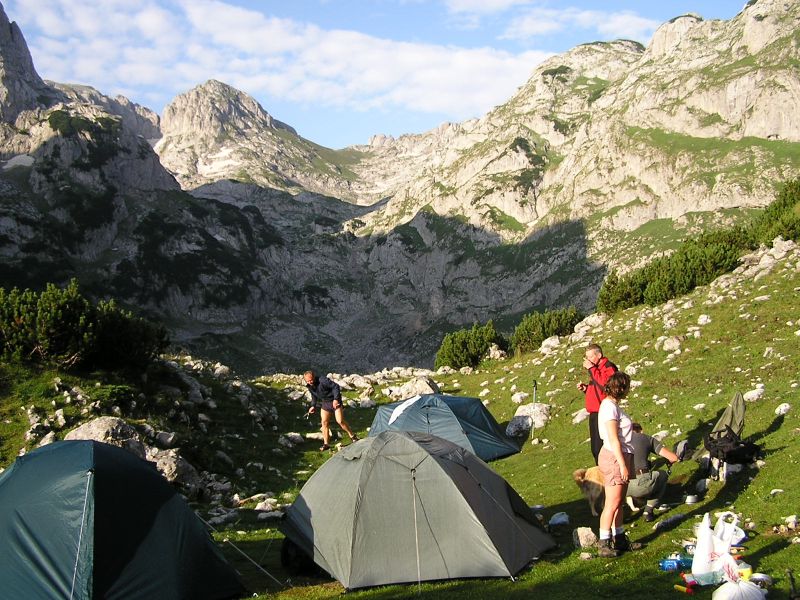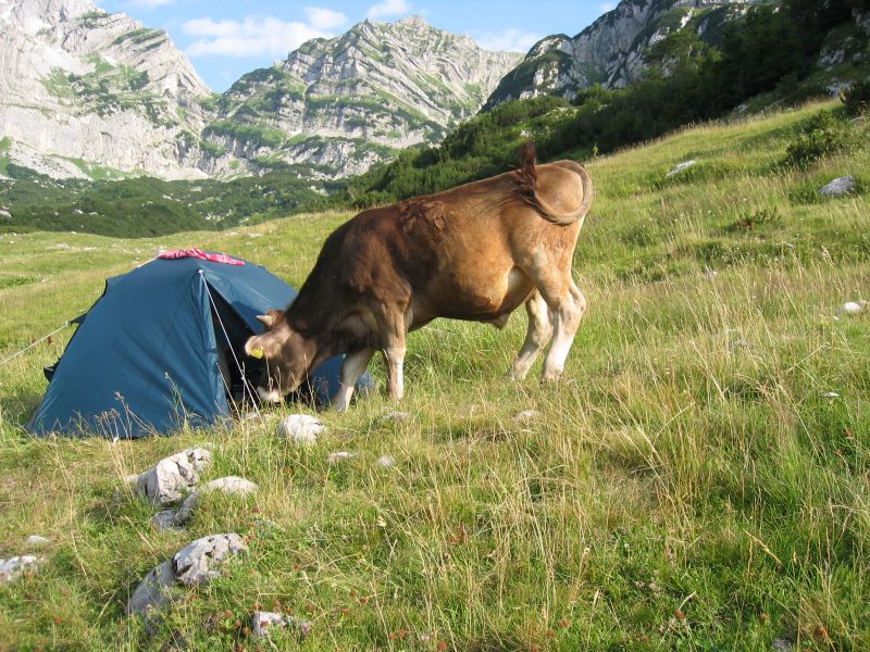 Místní čuvar je nemluvný, sdělí nám jenom, že za stan se platí 3 Eura, s čímž v zásadě souhlasíme a jdeme hledat místa na stan. Louka je plná rigolů a vápencových šutrů, takže naše čtyři stany jsou rozprostřeny po celé louce. Hřeje nás myšlenka, že jsme obsadili jediná více méně rovná místa na stan, z omylu nás ale vyvádí přišedší zájezd CK Alpina, jehož čtyřicet účastníků k našemu údivu mezi šutry a kravinci také nalézá místa na své stany. Večerní brífink má i svůj kulturní program: Ondřej se tak dlouho bezvýsledně dohaduje s dvěma býky, kteří zvědavě nakukují do jejich stanu a přežvykují Petrušky ručník, až musí zasáhnout Petra s hůlkou, jejímž úderům býci rozumějí lépe než Ondřejovu vysvětlujícímu tónu.
