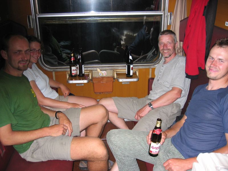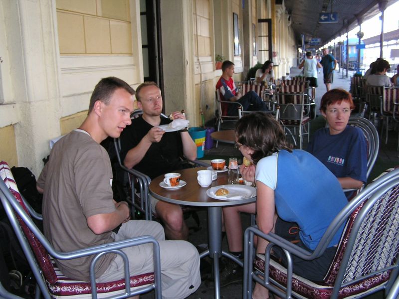 Zpoždění bylo standardní, takže na periferii Bělehradu přijíždíme naštěstí až v půl páté ráno. Městská doprava nás provezla bělehradským svítáním a na hlavním nádraží obsazujeme oblíbenou kavárnu a útokem bereme záchody, pekaře a potraviny. Po osmé hodině nám jede vlak do Budapešti, obsazujeme dvě rezervovaná kupé, kde okamžitě roztahujeme sedadla. Cestujeme jak pašové vleže, pospáváme, rovná krajina ubíhá a po třetí odpoledne přistáváme v Budapešti na nádraží Keleti. Nejbližší vlak do Prahy jede večer ve tři čtvrtě na osm, a tak trávíme příští tři hodiny v nádražní čekárně a výpady do okolí. Kolem sedmé hodiny se na peróně shromažďují nervózní backpackeři (ve vlaku nejsou místenkové vozy a lehátka lze urvat jedině u průvodčího), my vymýšlíme taktiku, která selhává, ale nakonec přeci jen k nelibosti cestujících doplňujeme poloprázdná kupé na plná. Ve chvíli, kdy už nám klesá hladina adrenalinu a my jsme rádi, že alespoň sedíme, přichází Káča s neuvěřitelným dotazem, zda chceme lehátka. Samozřejmě, že chceme a nastává další adrenalinový přesun podél vlaku do lehátkového vozu. Vlak se rozjíždí a šest z nás už sedí v lehátkovém voze. Naštěstí na peróně nikdo nezůstal, takže víme, že Luděk s Míšou jsou alespoň ve vlaku. Platíme za lehátka, za chvíli doráží i Míša s Luďkem, u stevarda si kupujeme vychlazený Budvar a připíjíme si na šťastný návrat. Pohodu zpáteční cesty naruší jenom maďarský průvodčí, kterému se nelíbí, že vlak jede jinou trasou, než na kterou máme lístky, takže po vzoru cesta byla sice delší, zato však méně pohodlná, doplácíme neskutečných 13 Euro na osobu za asi stokilometrovou zajížďku. Zdálo se nám to moc, ale průvodčí mluvil pouze maďarsky, bumážku nám vypsal taky maďarsky, tak s ním byla dost těžká domluva a nechat se vysadit na příští stanici se nám taky nechtělo. Radši jsme zvolili taktiku "nasraný nás nedostanou", průvodčího jsme vytrestali padesátieurovými a vyššími bankovkami a příjemně znaveni ustoupivším cestovatelským adrenalinem budějovickou dvanáctkou jsme šli na kutě.