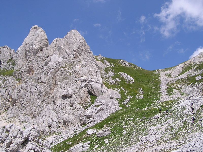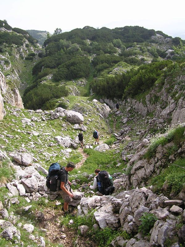 Obědváme u pramene v sedle Surutka a šplháme do širokého sedla Trojni prevoj mezi Minin Bogazem a Bandijernou, kde se nám otevírají nové pohledy na masiv Bobotova kuku a na druhou stranu do kotle pod Terzinym bogazem. Chvíli se kocháme výhledem, a pak už jen padáme do kotle. Cestu musíme hledat mezi vysokými vápencovými vrásami, ale s trochou štěstí se po asi dvou hodinách ocitáme na dně kotle. Kolem jezírka se ještě vyšvihneme do kopce a stojíme před několika katuny doliny Lokvice, která byla naším cílem.