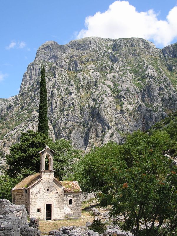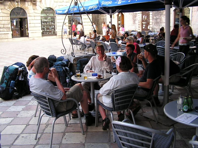 Serpentiny mastíme devadesát, předjíždíme do zatáčky na dvojité plné, atd. V Kotoru s ulehčením vystupujeme, řidič předvádí poslední exhibici (otočka na křižovatce na červenou) a my jsme rádi, že je pryč. Vydáváme se do centra města a u kávy dohadujeme další postup: strávíme tu dvě noci, odmítáme nabídku ubytování za deset Euro v Kotoru a za 8 Euro ve vsi u Kotoru a volíme kemp ve vesnici Stoliv, asi 10 km od města. Po hodině čekání na zastávce konečně přijíždí něco většího než minibus a my se cpeme dovnitř. Silnička je úzká, ani ne na dvě auta, často bez svodidel a přímo nad mořskou hladinou. Přežili jsme i tuto jízdu autobusem a díky místním vystupujeme správně ve Stolivu. Vítá nás opravdu příjemný malý rodinný kemp, majitel (dokonce mluví anglicky) nám vybírá moc pěkné místo na stany a dohadujeme se na ceně 20 Euro za čtyři stany a noc. Autobus jezdí paušálně za 1 Euro, 50 centů stojí batoh, takže režie na pobyt v Kotoru nás přišla na 5 Euro za osobu a den vč. dopravy.