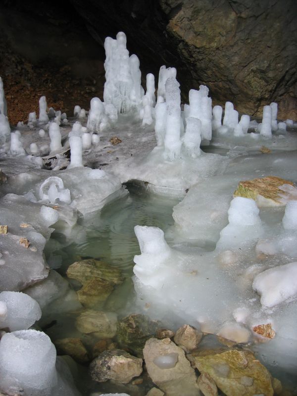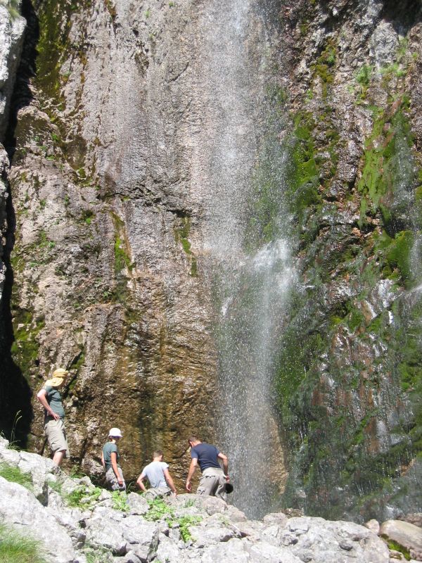 Včerejší dohady o programu rázně vyřešil ranní déšť: na přední místo se dostala včera ještě poslední Ledena pecina (jeskyně). Šplháme po klouzajícím bahně do sedla, kde opět křížíme cestu z Bobotova kuku na Crno jezero a po asi hodině a půl koukáme do jícnu Ledové jeskyně. Po kamenech a sněhových stupních se spouštíme dolů a obdivujeme třpytící se ledové krápníky a já se snažím nemyslet na to, že jeskyně v rohu ještě ústí do propasti, o které nikdo neví, jak je hluboká. Návrat víceméně stejnou cestou, Petra s Ondrášem jdou napřed, aby stihli ještě přechod Medvědů.
