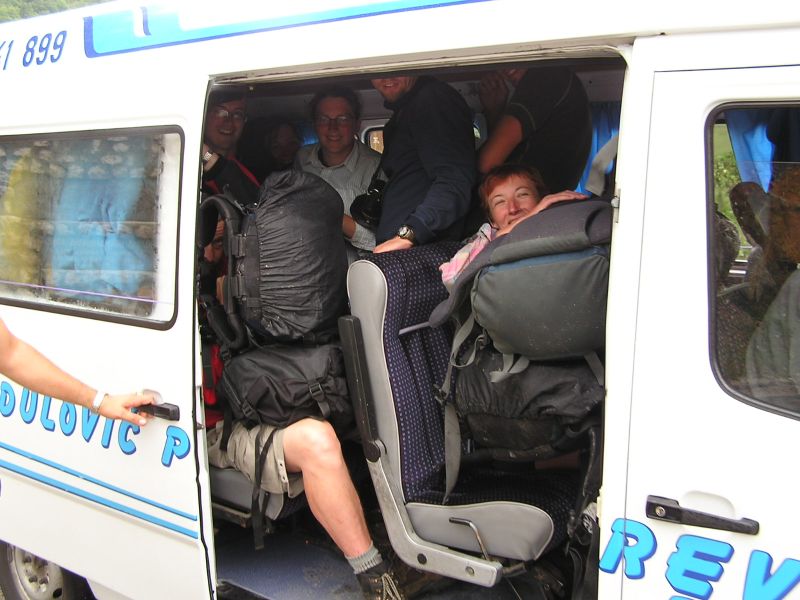 Se spolucestujícími se sbližujeme jak fyzicky tak duševně, vykládáme si zážitky a moc se těšíme, až vystoupíme. U mostu přes Taru přestupujeme (naštěstí ne všichni) na druhý už čekající minibus, do kterého se už celkem pohodlně vejdeme v pouhých dvou vrstvách. Začíná pršet, řidič to s námi hasí po černohorském způsobu a za necelou hodinku vystupujeme v Mojkovci. Po konzultaci se spolucestujícími měníme plán a cestu do Bělehradu přesouváme už na večer.
