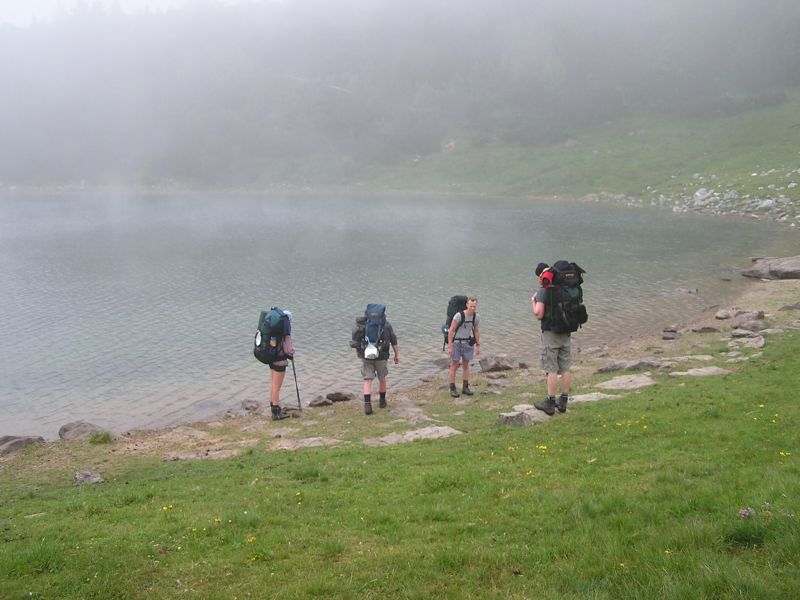 Příštích deset minut trávíme snahou odehnat velkého psa za přihlížení pohvizdujícího bači. Psa k velké Pajdově radosti nakonec zahání Zdeněk a my konečně můžeme pokračovat do sedla. Jdeme tajemnou krajinou plnou vápencových vrás, děr do pekel a kvetoucích luk a nakonec skutečně narážíme na vysněnou cestu do sedla. V botách už máme všichni bazén, ale přestává pršet, mlha se trhá a nahoře v sedle se nám otvírají krásné výhledy na mraky, údolí a pestrý kopec Šareni pasove. Sestup je úmorný a cesta dolinou ke stanům snad delší než včera. V kempu nás vítá mokrý zbytek výpravy (cesta prý byla pohodová, jenom se nemohli vymotat z kosodřeviny nad jezerem), čuvar, zvědaví bejci a v chatě roztopená kamna, na která rozmisťujeme naše smrduté boty a ponožky. Vaříme v chatě u stolu, čuvar nám upekl kulatý chleba a nám je dobře.