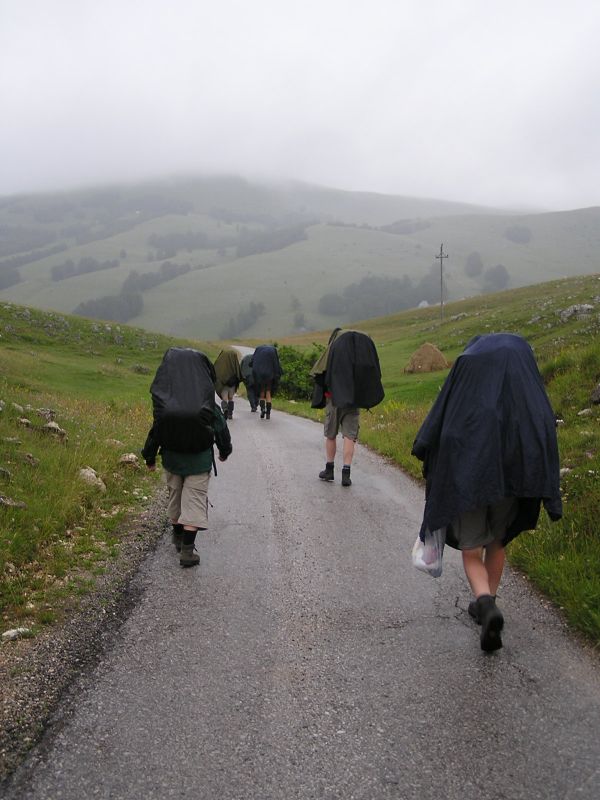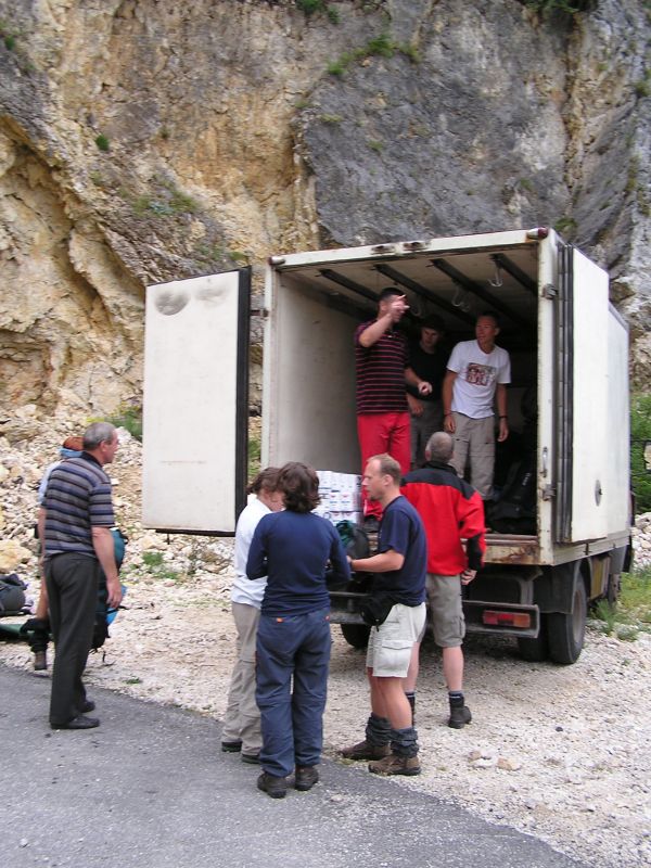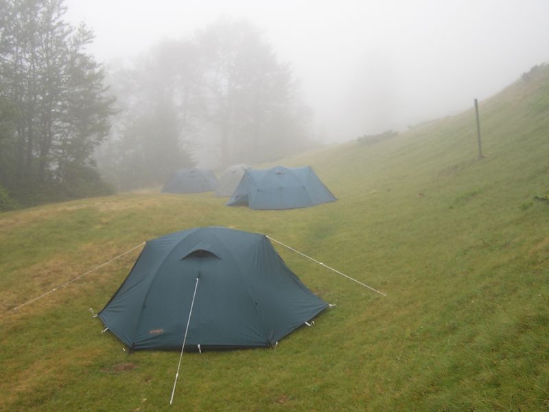 Domlouváme se s nimi, že kromě bagáže se dozadu za úplatu vejdeme i my, takže zbytek cesty do Trsy se vezeme s nimi. Ostatní se uvelebují na basách s pivem a na cukru, zatímco já a Luďek lezeme do kabiny. Řidič i závozník jsou moc příjemní, v rámci možností jsme si moc hezky popovídali. Nahoře ve vesnici ještě naši kluci pomáhají vyložit náklad a z dohodnutých 15 Euro (totiž, dohodl je předchozí řidič) je nám dokonce 5 Euro vráceno. S mírnými obavami nabíráme z jímky za obchodem dešťovku, která je ve vysoko položené vesnici jediným zdrojem vody a v dešti a mlze vyrážíme hledat nocleh. Po asi hodině chůze za doprovodu třínohého psa obsazujeme louku u silnice, soukáme se do stanů za bubnování kapek do plachty usínáme.