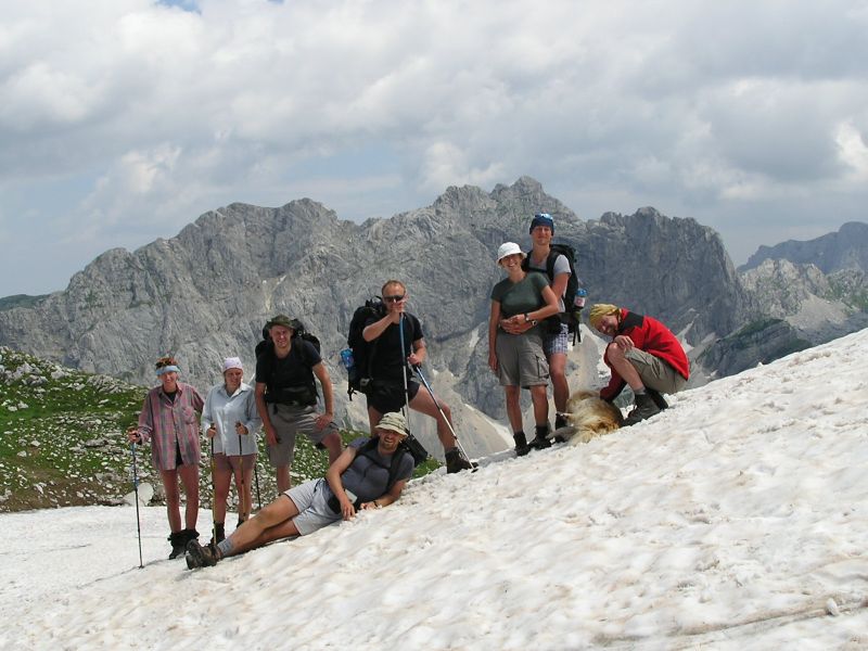 Vstáváme do jasného rána a naším cílem je Prutaš, geologický to skvost Durmitoru. Bezhlavě šplháme podél nádherně zvrásněného a barevného Šareni pasove až se ocitáme v sedle Samar, do kterého jsme se vůbec dostat nechtěli. Měníme tedy program a místo Prutaše volíme Bobotov kuk. V sedle ještě Míša testuje nový futrál na foťák - foťák se nečekaně dává do pohybu a skotačí asi 100 výškových metrů dolů, kde se na suti zastavuje. Futrál obstál, foťák je celý a funkční. Přelézáme několik vápencových vrás, jdeme po úbočí pod Bobotovým kukem, u jezírka Zeleny vir doplňujeme neskutečně ledovou vodu a šplháme do sedla. Psy máme dnes dokonce dva: Pajdu a Nevěstu. Nevěsta je zřejmě profi průvodcem na Bobotov kuk, protože tam odsud ji včera alpiňáci přivedli. Cesta je poměrně pohodlná, výškové metry přibývají, pod Kukem přecházíme několik sněhových polí. Závratný letecký pohled do doliny Škrčko jezera, kamenitý výstup po všech čtyřech a už sedíme nahoře. Podle mapy určujeme okolní hory, obědváme, usmíváme se na vrcholové foto, a protože už nahoře začíná být těsno, hajdy dolů. Na škrtnuté odbočce na Bezimeny vrch jsme se rozdělili. Úderná trojka Petra, Roman, Ondřej slibují, že se nebudou pouštět do ničeho šíleného a vyrážejí na ostrý hřeben, my ostatní se vracíme stejnou cestou. A jak řekli tak udělali, u Zeleneho viru nás dohánějí. Petře zůstal v ruce kámen, což jim samozřejmě jako varování stačilo. Přestože se vracíme stejnou cestou, při pohledu na zvrásněnou krajinu jsem se sama sebe několikrát ptala, zda jsme tudy dopoledne opravdu šli. Večer nás čekalo nemilé překvapení v podobě nového čuvara, který se z nás snažil vymámit asi třikrát tolik než včera, ale po dlouhém rozhovoru o místních poměrech, horách, jeho dětech, Luďkově vnoučkovi a několika hltech kořalky už mu zase stačila 3 Eura za stan (pravda, bez stvrzenky).