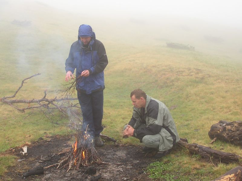 Zapalujeme oheň sušíme věci, sebe, opékáme lovečák a čekáme až se v jedenáct hodin změní počasí, vysvitne sluníčko a my budeme moct vyrazit na Komy. Počasí se ale změnilo až v jednu, a to k horšímu. Začíná lejt, my zalézáme do stanů a začíná nám být jasné, že z dnešního dne nic nebude. Večer jsme opět pozváni k Bobanovi a domlouváme odjezd na druhý den ráno.