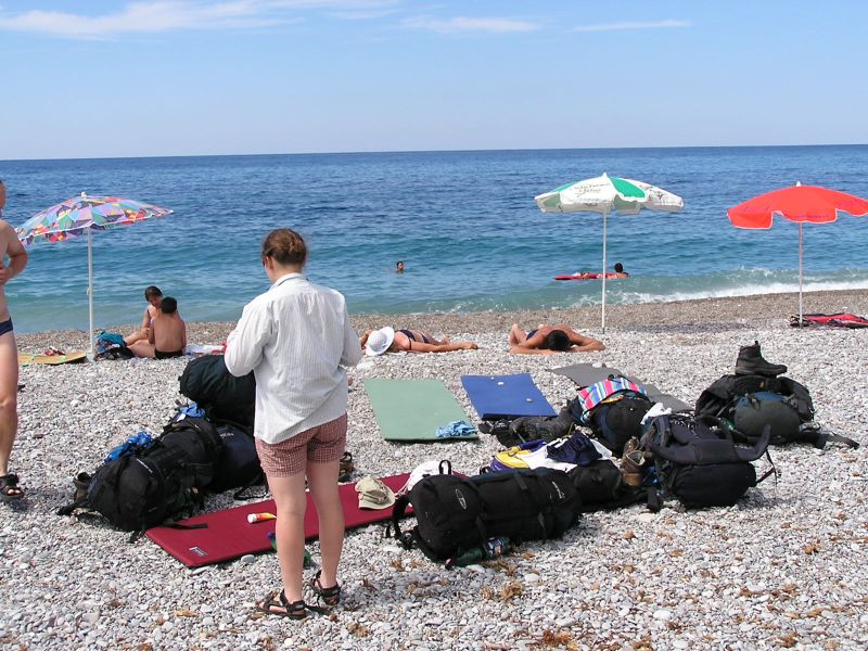 Nejdřív nás sprdnul za bombardování Bělehradu a za Havla a poté se rozhodl nás již v přátelském duchu vzdělat. Za dvě hodiny cesty jsme probrali bratrské slovanské národy a jazyky, politiku, historii, Descarta a kde co dalšího. S hlavami jak pátrací balón jsme s úlevou vystoupili v Sutomore. Přivítalo nás horko, sluníčko a první pohled na moře. Druhý pohled už byl poněkud slabší: pouliční prodavači, vyhrávající stánky, kolotoče, pláž plná rudých lidí a odpadků a zjištění, že na jednu noc nás nikdo neubytuje. Nakonec jsme se vrátili ke stanovišti taxíků a minibusem se nechali odvézt do nedaleké Buljarice, kde jsme se ubytovali v celkem příjemném kempu. Postavili jsme stany, rozvěsili zvlhlé a zatuchlé věci a poprvé se smočili v houpavém moři. Večer jsme si v samošce koupili víno a olivy a strávili krásný večer na pláži, moře šumělo a vonělo a ve vlnách se odrážel měsíc.