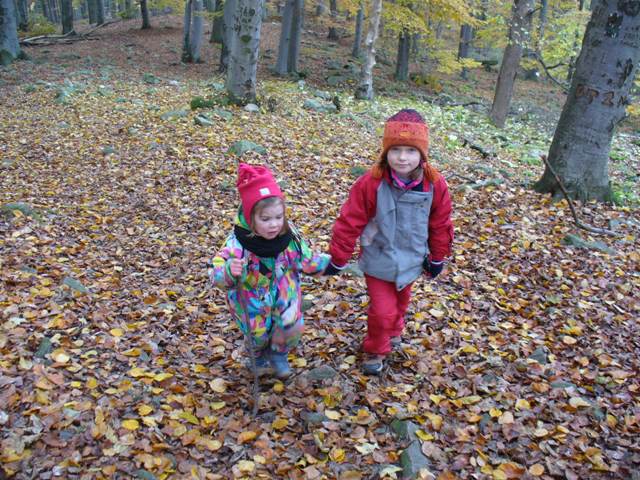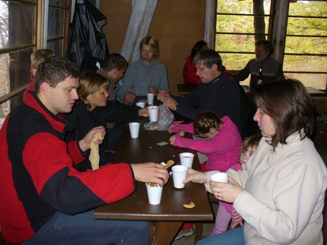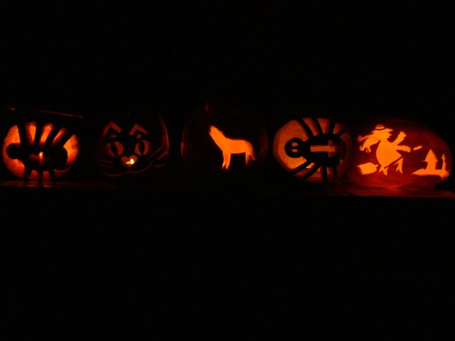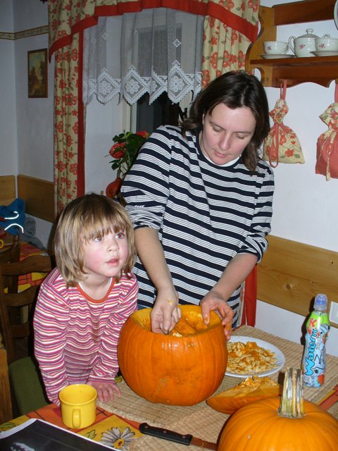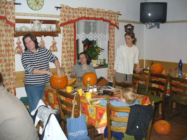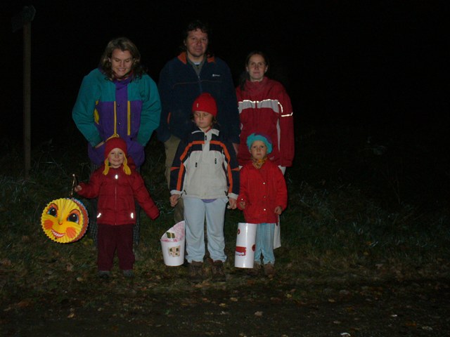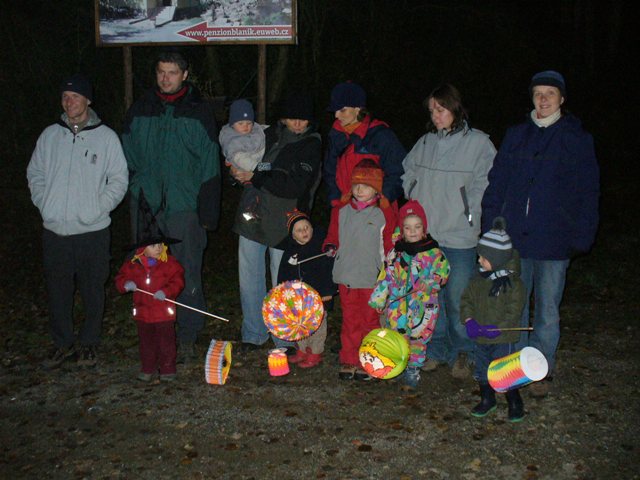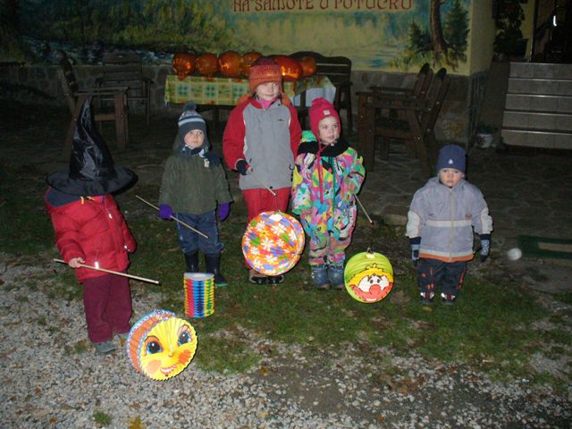 Dlabání dýní se podařilo, vyřezali jsme obličeje, čarodějnici na koštěti, pavouka… tentokrát jsme z dýní i hodně vařili. Vynikající plněné listové šátečky upekla Marcela, pak jsme měli dvě různé dýňové polévky (teda jedna z toho měla být dýňová pomazánka, ale zůstala nějak příliš řídká…) Lampiónový průvod šel v sobotu večer lesem po cestě, která byla vyznačená svíčkami ve sklenicích. Světýlka ve tmě krásně zářila, děti měly radost. Mourečkovi si vyrobili vlastní lampiónky, které vypadaly moc hezky. Byla to pro nás inspirace pro příští ročníky. Příjemná byla návštěva Lindy s Mrožem, kteří mají nedaleko vlastní chatu. Popili jsme svařáček a užili příjemné podzimní atmosféry v teple u sálajících kamen. Vychutnali jsme si dýňové pochoutky, popovídali jsme si, užili jsme si podzimní nálady i pravé sychravé počasí…