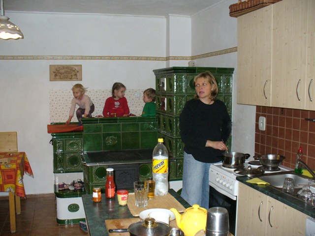 Přes počáteční problémy s účastí jsme se nakonec pod bájnou horou Blaník sešli v příjemném složení. Penzion nás velice překvapil – velmi útulný, nově zrekonstruovaný, kachlová kamna v každém pokoji. Netušila jsem, že zatopení jedním polínkem dokáže vyhřívat pokoj po celý den! Velká kachlová kamna s pecí se nacházela také ve velké kuchyni, která byla zároveň naší společenskou místností. Děti se na peci úžasně vyřádily, lezly pořád nahoru a dolů a Bělka si dokonce na peci na jednu noc ustlala!