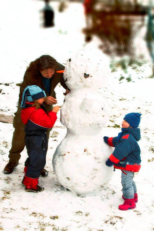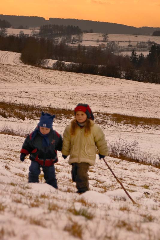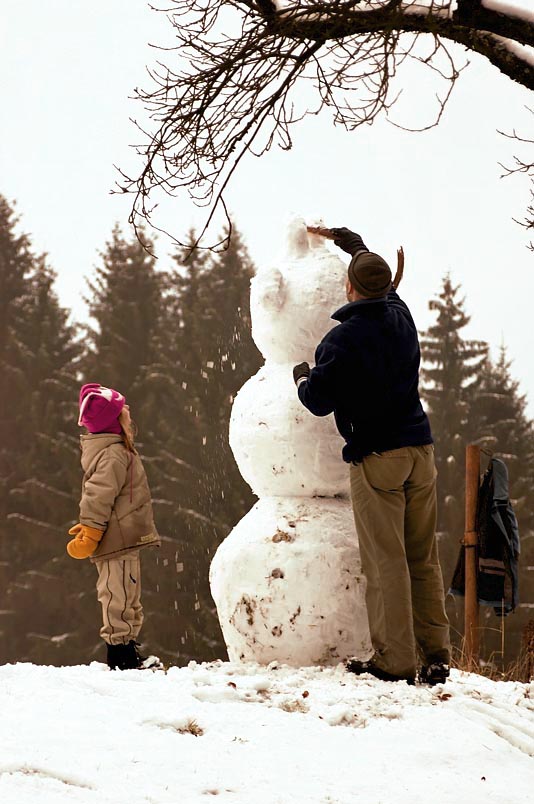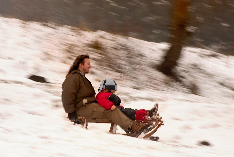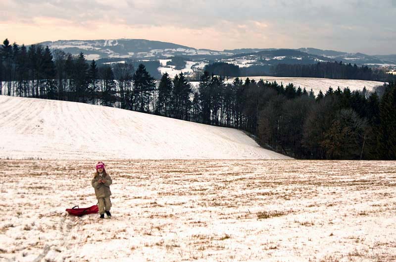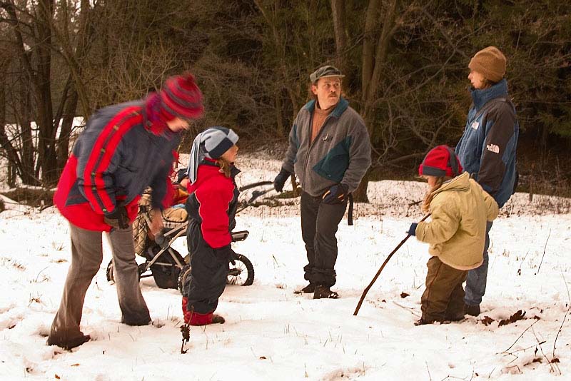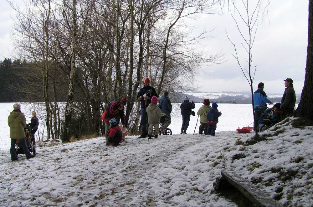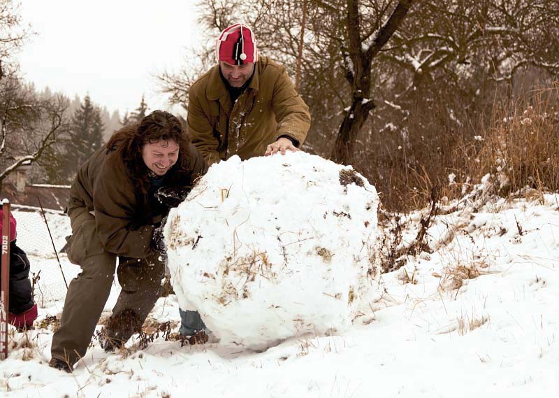 Těšili jsme se na společné blbnutí ve sněhu v podhůří Krkonoš, leč zima letos nepřicházela. Nakonec asi 5 cm sněhu napadlo večer po příjezdu na chatu. Milan ráno z půdy vytáhl sáňky a pekáče a všichni se jich s radostí chopili. Děti nadšeně jezdily z kopce a také do kopce, když sehnaly dospělý potah – např. Davida. Kdo zrovna nejezdil, stavěl sněhuláky.