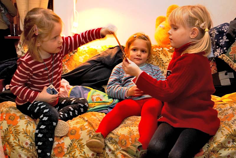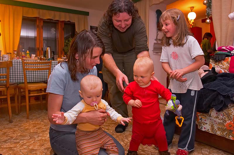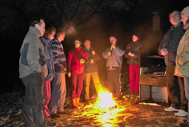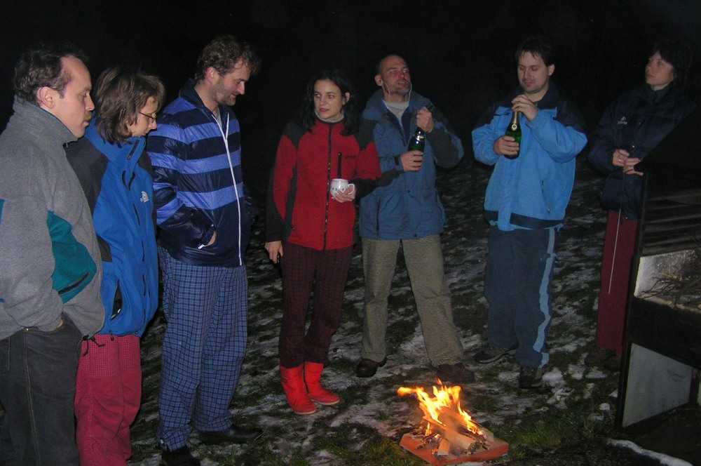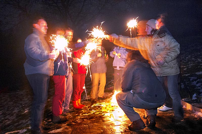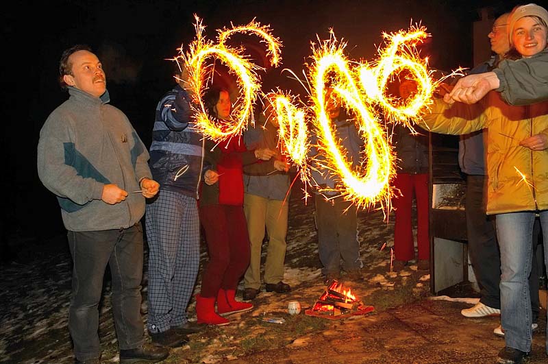 Nový rok 2007 nás našel prskající venku u ohně s plnými břichy chlebíčků, čokoládového fondue, cukroví, piva vína, čaje a dalších dobrot. Když došly prskavky, sledovali jsme ohňostroje v širém okolí. Iva vybuchla pár rachejtlí také za nás. Děti příchod nového roku naštěstí pro nás rodiče zaspaly, jen Andulka M. ho oslavila zpěvem.