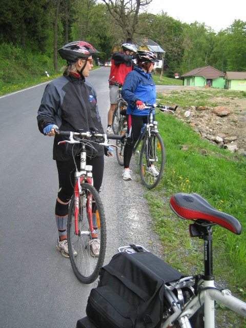 Do Javorníku to bylo ještě po rovině, takže nás trápil „jen“ ten vítr v čele a mě těšilo, kolik hraničních patníků potkáváme. V Javorníku (stále 280 m.n.m.) následoval oběd a byla před námi horská etapa Rychlebských hor se „zpevněnými“ cestami. Po důkladném prozkoumání mapy a čárkovaných či plných čar, padl návrh, na který byl Míša patřične hrdý – co kdybychom zkusili část Rychlebských hor bez brašen a tak jako tak skončíme stejně zpět v Javorníku? Jednoznačně schváleno, trochu jsme si zastoupali, okusili ty nezpevněné cestičky, projeli se v lese a mohli tak s klidnou duši říct, že jsme objeli celý výběžek a otestovali Rychlebské hory. Zítra jedeme údolím. Spali jsme v Uhelné na sále v hospodě. Nejdříve jsme si vyhlídli fotbalový stadión, pak se usadili v místní čtyřkové hospodě a při účtování jsme nechali Monče volný prostor k debatě s panem hostinským. Zařídili jsme si tak krásný večírek a nocleh na sále. Mimo jiné jsem od Misíků dostala instrukce k jízdě po nezpevněných cestách. Jedna mi říkala, že musím jezdit rychle a druhý se mě neustále snažil přesvědčit, že mé kolo je na takové cesty stavěné :-). Těžké uvěřit, ale uznávám, trochu to fungovalo.