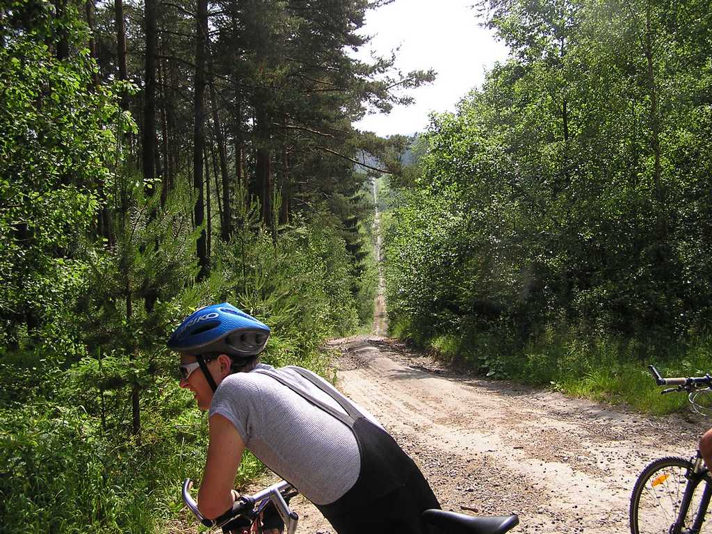 Dozvídám se leccos o bývalých sousedech a odvážím mnoho pozdravů babičce. Večer si kousek za penzionem nacházíme kus lesa, kde se ukládáme k spánku. Po předchozí noci chceme, aby to bylo někde v lese a vysoko, aby nám nebyla zima. No, zima nám rozhodně nebyla. Naše strašné trápení ukončil v půl páté ráno Vašek větou: „Nedělejte, že spíte. Balíme a jedem!“ Celou noc jsme se všichni potili do spacáků, z kterých jsme nemohli vystrčit ani kus holé kůže, na kterou se okamžitě vrhaly tiplice rodu mikrokurvy. Pro zpestření se kolem nás ještě motali divočáci. S hlavami v ručníkách jsme zabalili a za ranního kuropění jsme prchali ztichlou vesnicí štváni každý osobním hejnem tiplic. Věřím, že hmyz dokáže přivést i velký dobytek k šílenství a bídné smrti. Bohužel z mého nachystaného vyprávění o dětství na chalupě v Nových domkách nebylo nic, z pozdravů sousedům od babičky také ne. Na silnici mezi Novými domky a Rozvadovem jsme shlédli východ slunce a vyčerpáni jsme vpadli do pumpy v Rozvadově. Udivený prodavač nám prodal umělohmotné croisanty, čokoláda z automatu a ruská telenovela byla jenom vkusným doplňkem naší vkusné snídaně.Z Rozvadova uhýbáme do lesa, kde se opět necháváme žrát od další havěti a mezi orosenými loukami vjíždíme do obce Železná. Tato skýtá vietnamské tržiště, pumpu, hraniční přechod a parkoviště. Je sedm hodin ráno a my už máme v nohách 20 km. Na asfaltové parkoviště svítí slunko a hlavně tu nejsou žádně mikrokurvy ani jiný bodavý hmyz, a tak shledáváme tuto plochu vhodnou k druhé snídani a asi hodinovému odpočinku s obrubníkem pod hlavou. Mírně osvěženi pokračujeme v jízdě střídané s tlačením na vrch Pleš. Stoupání je úmorné, nahoře krásně prosvícený starý sad. Pod Pleší přepadáme hospodu v domnění, že je málem poledne. Paní je moc hodná, a tak nám otvírá už v devět a servíruje čaje na terasu. Opět nás sklátila únava, usínáme na stolech. Od Pleše se motáme už víceméně po asfaltu a přes Rybník, Hraničnou, Novosedly, přijíždíme hladoví do Nemanic. Místní hospoda dělá čest názvu vsi a Ruda nemá rád komplikace, a tak se po vlastním chlebu se sýrem přesouváme přes Nemaničky do Lískové. Tam už je hlavní silnice a hraniční přechod, takže kromě trpaslíků tam dostaneme i něco z Böhmische Küche. Ale palačinky měli dobré. Potom kousek po hlavní a záhy uhýbáme do lesa vstříc poslednímu strašnému výšvihu etapy. Horko dosahuje vrcholu, je těsně před bouřkou, šílení hmyzu kolem našich zpocených těl kulminuje. Někteří je při tlačení kol do vrchu tupě snášíme, jiní s kvílením vykopáváme své údy s cílem hmyz odehnat. Nic nepomáhá. Kolo těžkne. Krev tepe ve spáncích. Mouchy bzučí. Čí to byl proboha nápad?! Asfaltka se láme kus pod vrchem Čerchov a odtud už jenom dolů. Do České Kubice sjíždíme už za deště. Fotka před nádražím, převlíct a už nám jede vlak. Přestupujeme v Domažlicích a v Plzni, kde máme ovšem spoustu času – výluka na trati do Chebu paralyzuje celé Plzeňské nádraží i náš spoj. Večer usínám s obličejem jak po neštovicích a neustále slyším v uších temné bzučení…