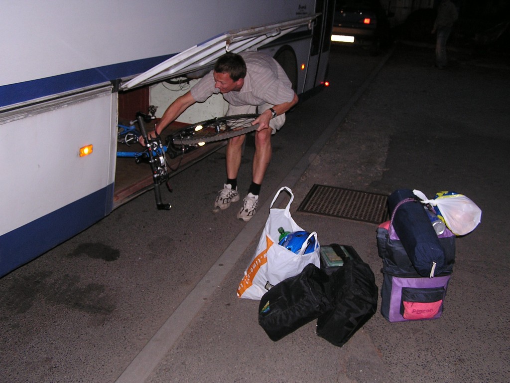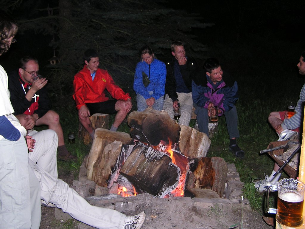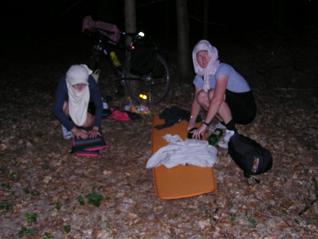 První dobrodružství nám uchystaly hned České dráhy výlukou na trati Praha – Cheb. Inu stalo se, že jsme kousek před Stříbrem přesvědčovali přistavené smluvní autobusové dopravce, že osm kol je přece nezabije. Podařilo se a my jsme mohli své miláčky naskládat do zavazadlových prostor a v Plané je zase přeložit do vlaku. Co bychom neudělali pro povyražení spolucestujících… V Chebu vystupujeme s mírným zpožděním již za tmy, fotíme se před nádražím a vyrážíme do černého Chebu. Stačí jej projet dvakrát a už víme, kudy máme jet. Ubíráme se na obec Hrozňatov, kde hodláme v blízkém lese odložit svá těla. Nicméně v Hrozňatově se nám do cesty staví otevřená hospoda. Snažím se být přísná – jedno a jedem, ale nějak se nám nedaří odolat nabízenému guláši a hořícímu ohni na zahradě. Hostinský je milý, ptá se, kde budeme spát a když tak neurčitě mlžíme, nabízí nám, jestli nechceme přespat u něj na zahradě. Stejně potřebuje někoho, kdo by mu udržoval oheň na zítřejší prase. Jo, a kola nám zamkne do hospody… No, pivo dalo pivo a nebylo, co řešit.