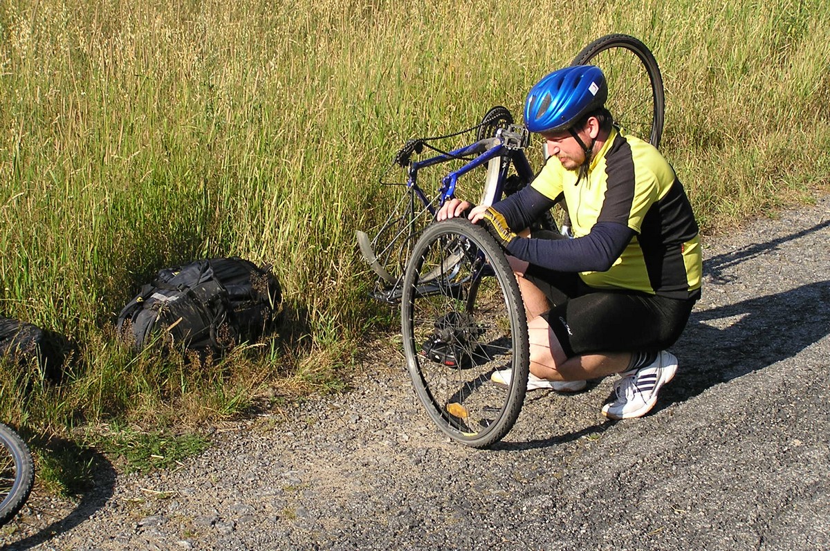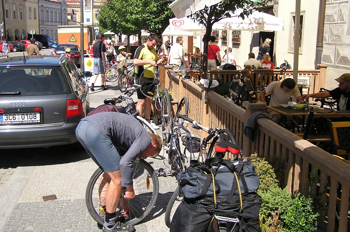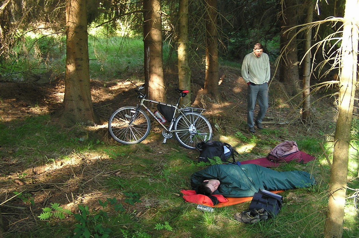 Jak rádi jsme druhý den vstali do slunečného rána a šlápli do pedálů! Podél rybníků to pěkně ubíhalo. Ve Staňkově, po obědě, se od nás bohužel musel kvůli rodinným povinnostem odpojit Tomáš Souček. Ze zbytku dne si pamatuju už jen jízdu krásným nízkým hustým lesem u Peršláku, luxusní golfové hřiště u Nové Bystřice a rozhovor s policajtem na téma „kam jedete“ s mojí odpovědí „někde v hospodě si dáme pi… ehmm.. něco k pití“. Jednoduchou večeři jsme si dali ve dvoře v hospodě ve Starém Městě a pak vydupali kopec a v nejbližším lese spočinuli na jehličí. Déšť tentokrát nehrozil.