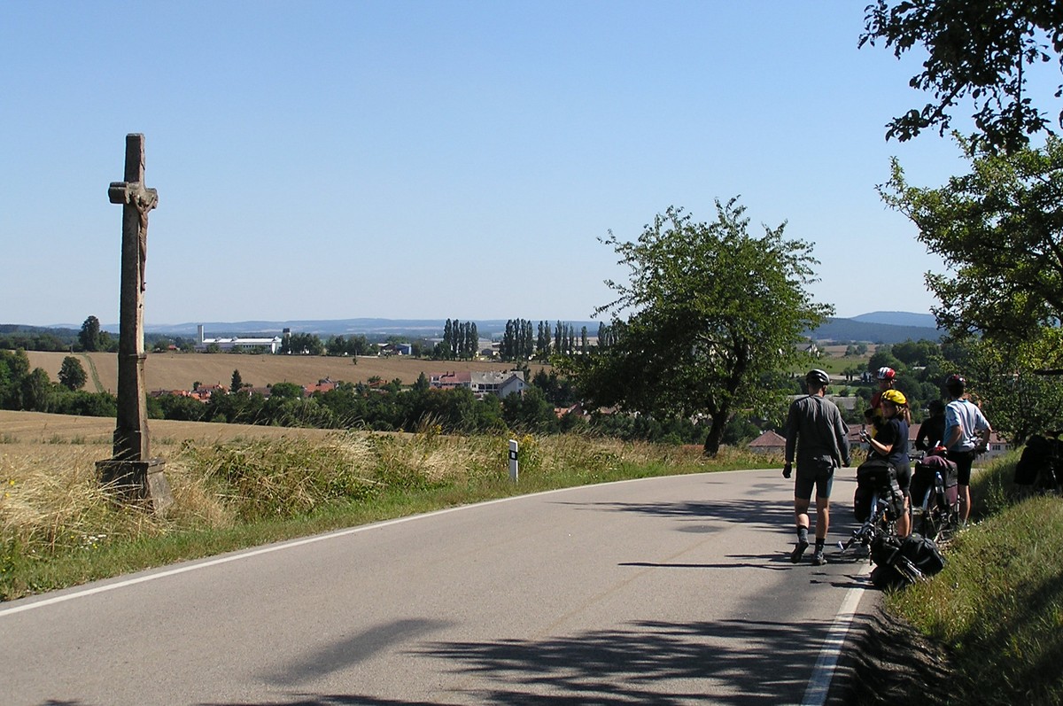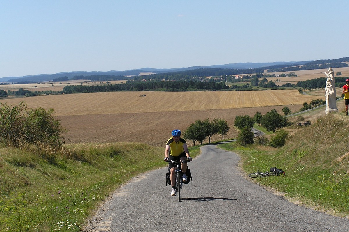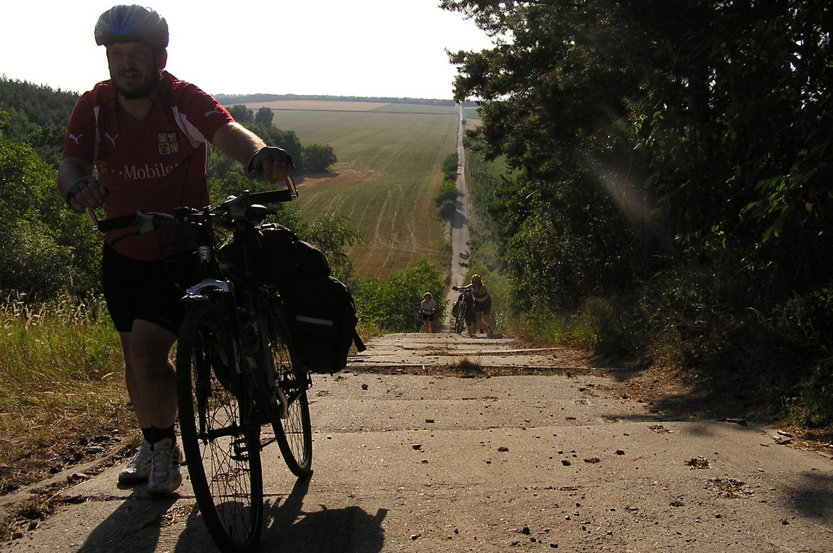Jestliže jsme první den v poledne měli našlápnutý už slušný kus cesty, o druhém dni se to rozhodně říct nedá. Po pár kilometrech nás přibrzdila Maříž a její (téměř) světoznámá keramika. A po dalších pár kilometrech Slavonice, kde se dlouho opravovaly defekty a užívala pohoda krásného náměstí. Aspoň jsem si stihnul prohlédnout katakomby a v místní dílničce vytvořit Alče dáreček ke svátku (tričko s potiskem). Je tedy po poledni, máme za sebou 12 km a bez oběda se vydáváme dál. Dobrý oběd si dáváme v nenápadné hospodě o pěkný kus jinde. Stála přesně za „finanční hranicí“, která odděluje drahá místa od levných a kterou jsme evidentně přejeli hned za Slavonicemi. Točili tam Hostan, a v těch teplotách nám náramně chutnal. Snad jedině Petrovi se stýskalo po plzničce. Večer jsme si zopakovali postup z předchozího dne: večeře ve Vranově a noční výstup nahoru do kopce, kde uléháme na prvním vhodném místě v lese.