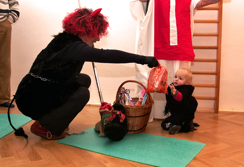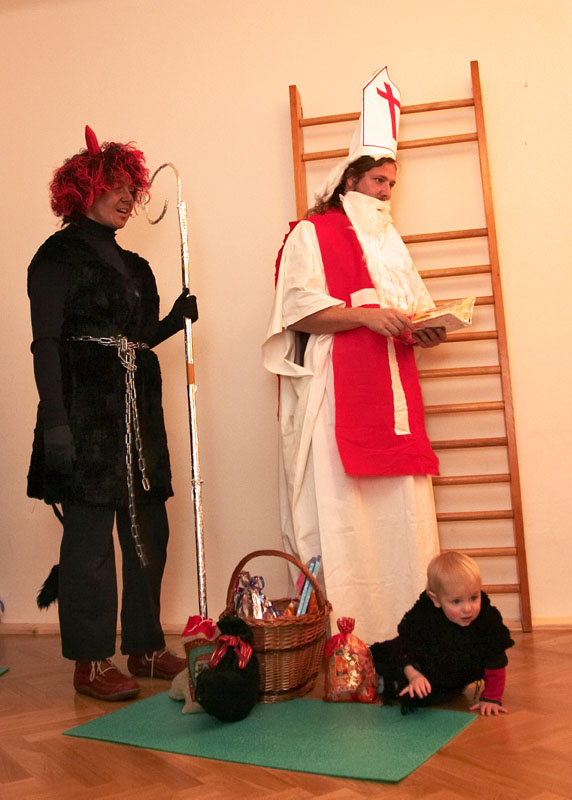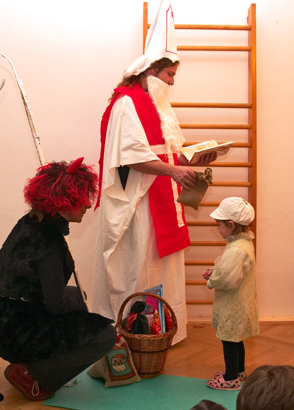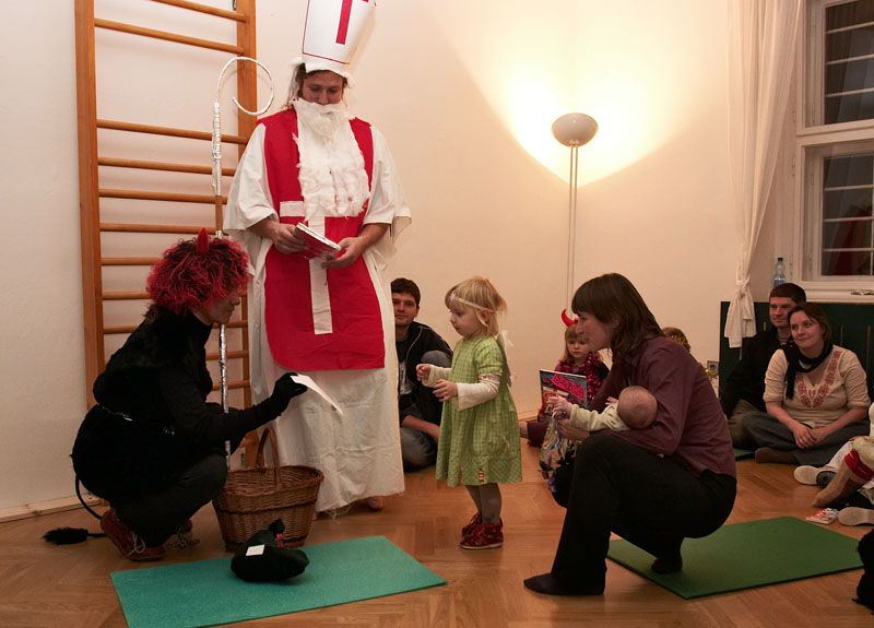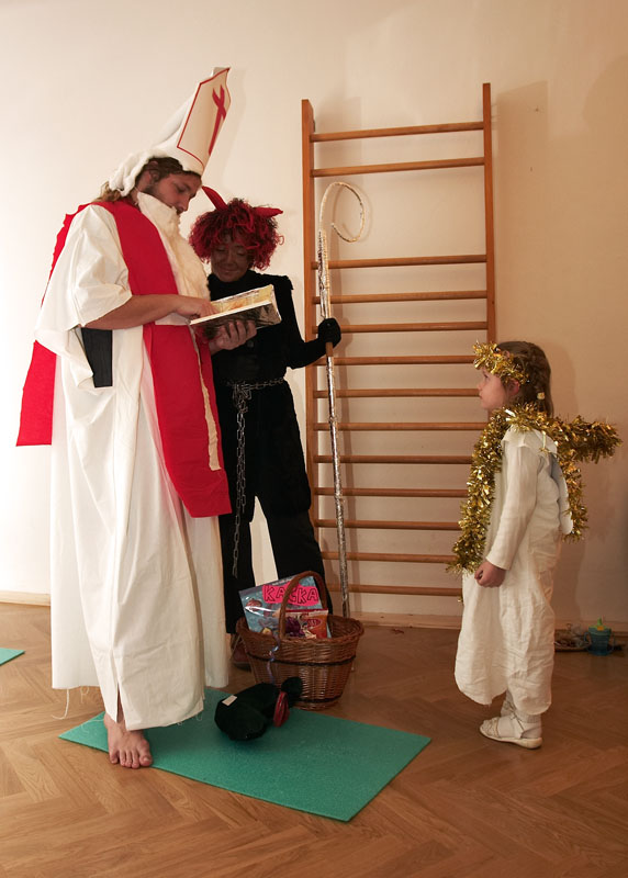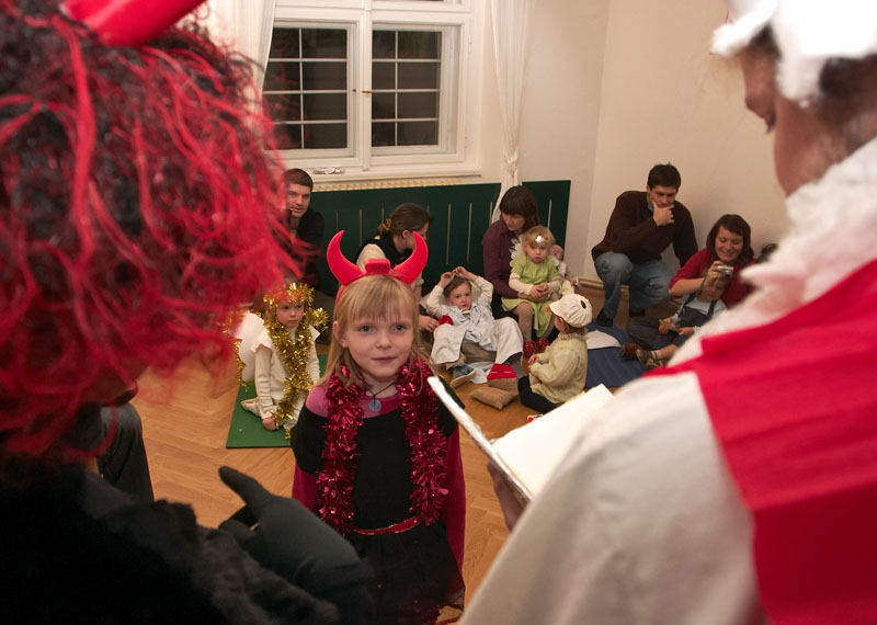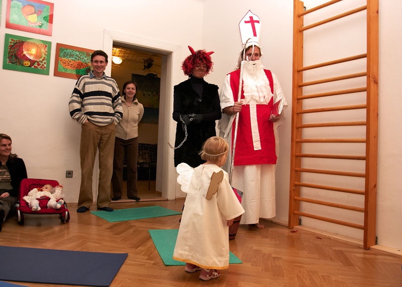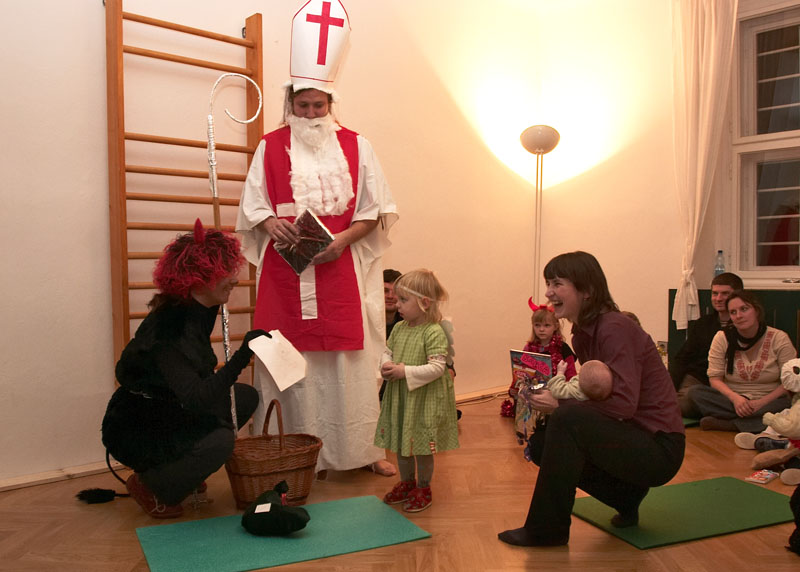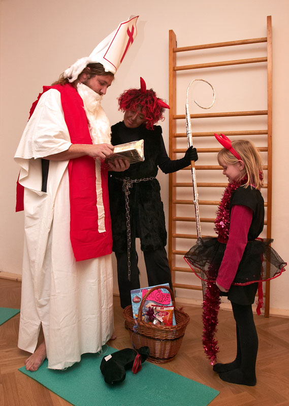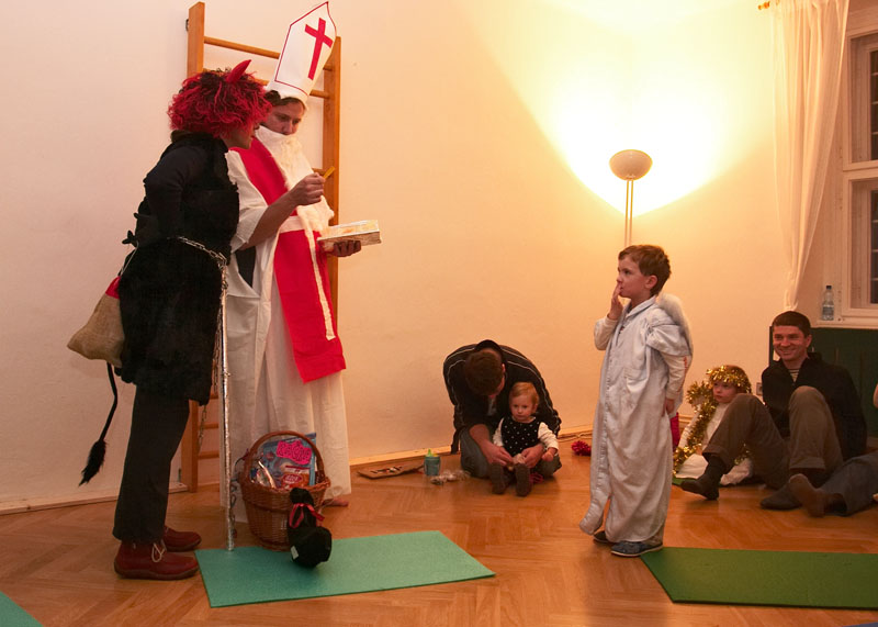 Na Mikuláše navštívil Rodinné centrum Letná (Hanko, děkujeme) Mikuláš Václav s čerticí Kamilou s košem plným dárečků. Už tam na ně čekaly některé trochu s obavami dvacítkové děti, které mezitím prozkoumaly všechny hračky, snědly nabízené sladkosti a převlékly se za malé čertíky a andílky. Rodiče jim ve všem pomáhali. Ty starší zazpívaly, všem se připomněly různé neplechy a Mikuláš s čertem rozdali dárky. Nikoho do pekla s sebou čert nevzal, a tak jsme se všichni spokojení vrátili večer po hezkém odpoledni domů.