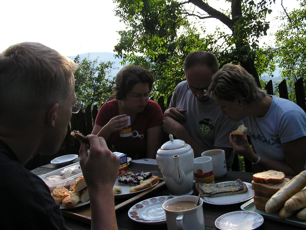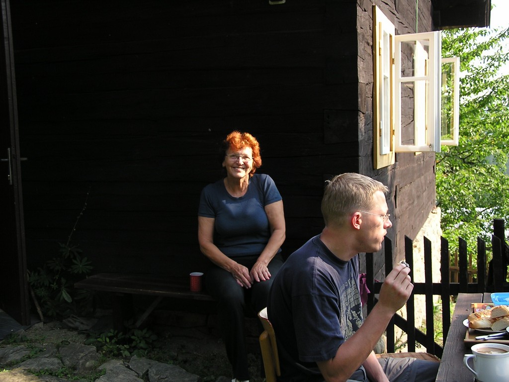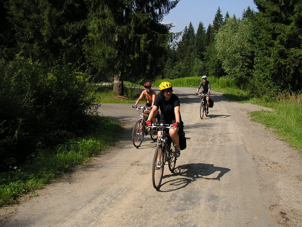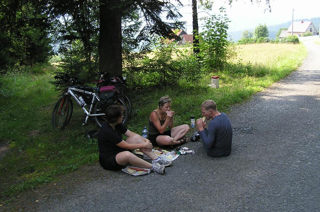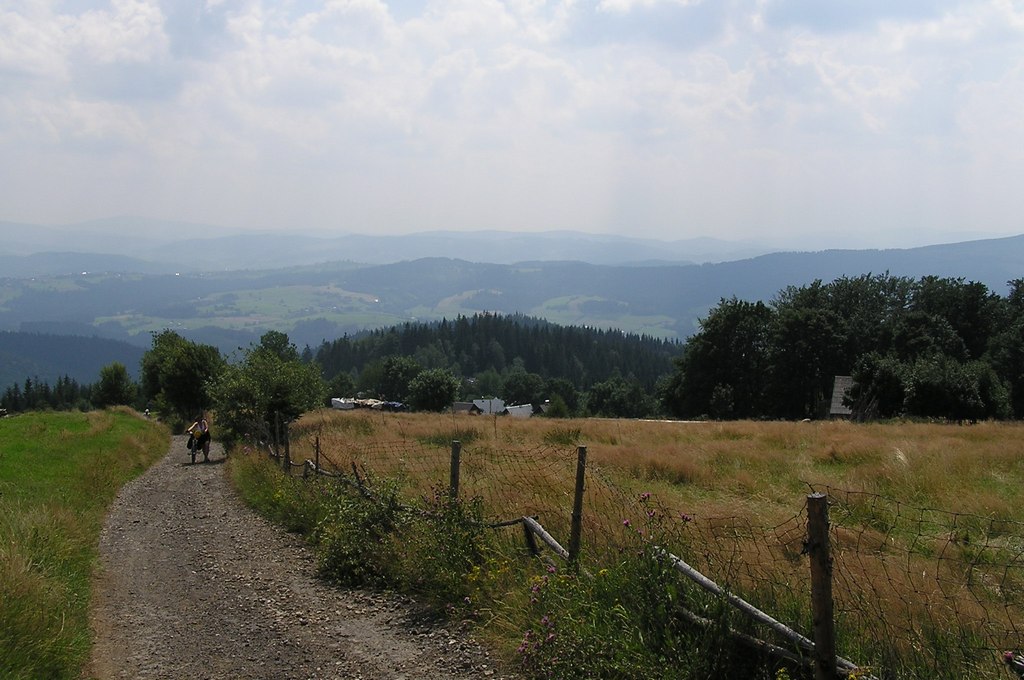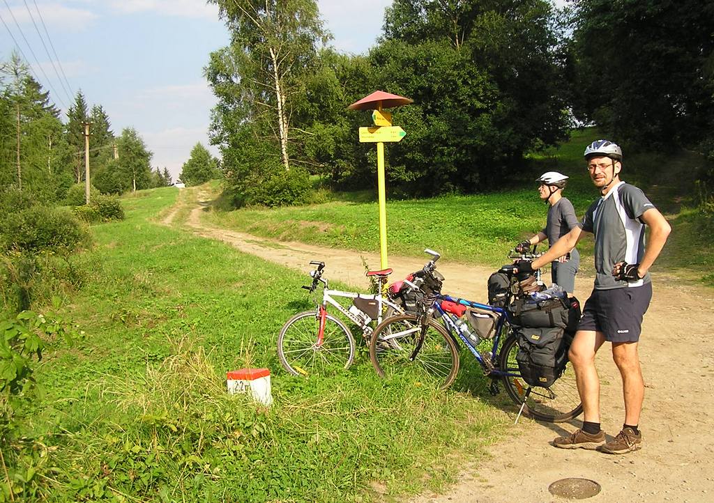 Tady už na nás čekala i mamka s gulášem, teplou sprchou a borůvkovým koláčem. Po večeři jsme načali lahev vynikajícího calvados z místních jablek, kterou jsme statečně dopili u ohně. Kolem půlnoci jsme se uklidili do peřin. Ráno opět pražilo slunce, posnídali jsme venku, naplánovali trasu a velmi zvolna vyrazili. Autem jsme byli odvezeni na Konečnou, vyzvedli si kola a nezbylo nám než vyrazit. Z Konečné jsme spadli do údolí Černé, kde jsme se napojili na zelenou, po které jsme vystoupali na Bílý kříž. Tady jsme obdivovali výhledy, ale i neuvěřitelný totáčský hotel. Z Bílého kříže ovšem nevede žádná silnice naším směrem, nechceme-li jet vnitrozemím až do Frýdku, nezbývá nám tedy než to střihnout opět po hřebenovce. Kola z části tlačíme a s obavami pozorujeme houstnoucí mraky. Míša s Petrem se vzájemně zkouší z meteorologie, kdy Petr tvrdí, že bouřka nás nemine a Míša naopak. Přesto ale podléháme Petrovi a v panice opouštíme hřeben zpět do sedla. Po dvaceti minutách je jasné, že bouřka nebude, Petr se omluvil za přehřátý panikátor a pokračujeme dále. Místy i nasedneme na kolo. Za Polomkou jsme spadli na asfaltku a soustředíme se, abychom neminuli kritické místo – odbočku na červenou. Nepodařilo se. Sjíždíme po krásné asfaltce lemované maliním, ale je nám jasné, že je to až příliš velká idyla - asfaltka míří do jiného údolí, než potřebujeme. Nakonec jsme našli rozcestník, odkud nás opět štěrková cesta dovedla na správnou asfaltku, po které jsme spadli přes Horní Lomnou do Dolní Lomné. Začíná krápat a pořádně se rozprší ve chvíli, kdy dosáhneme doporučené restaurace U Mánesa. Jsou čtyři hodiny, čas oběda. Sedíme na zahrádce, cpeme se krajovými specialitami (např. placky se slaninou a kyselou smetanou, halušky, houbová polévka apod.) a čekáme, až to přejde. Za dvě hodiny jsme se rozhodli, že pokud tu nechceme nocovat, musíme vyrazit.