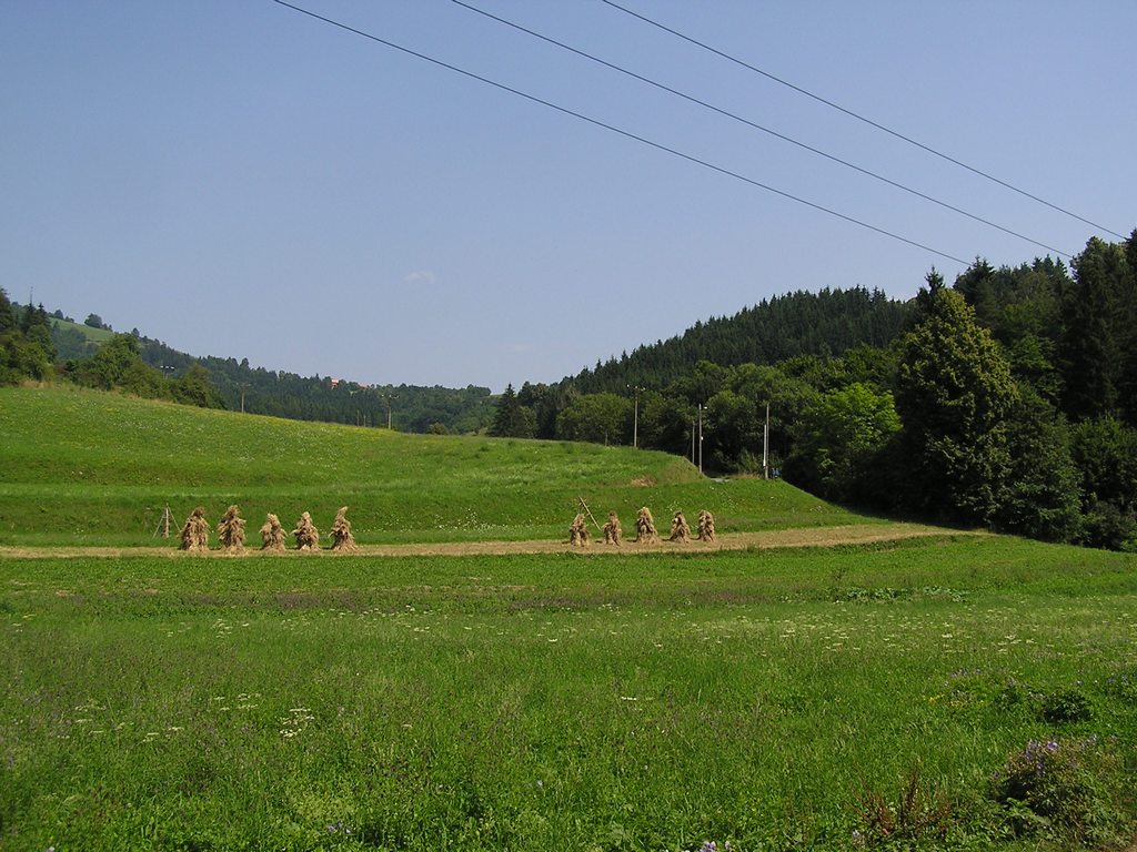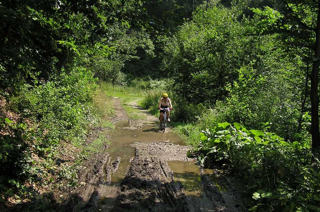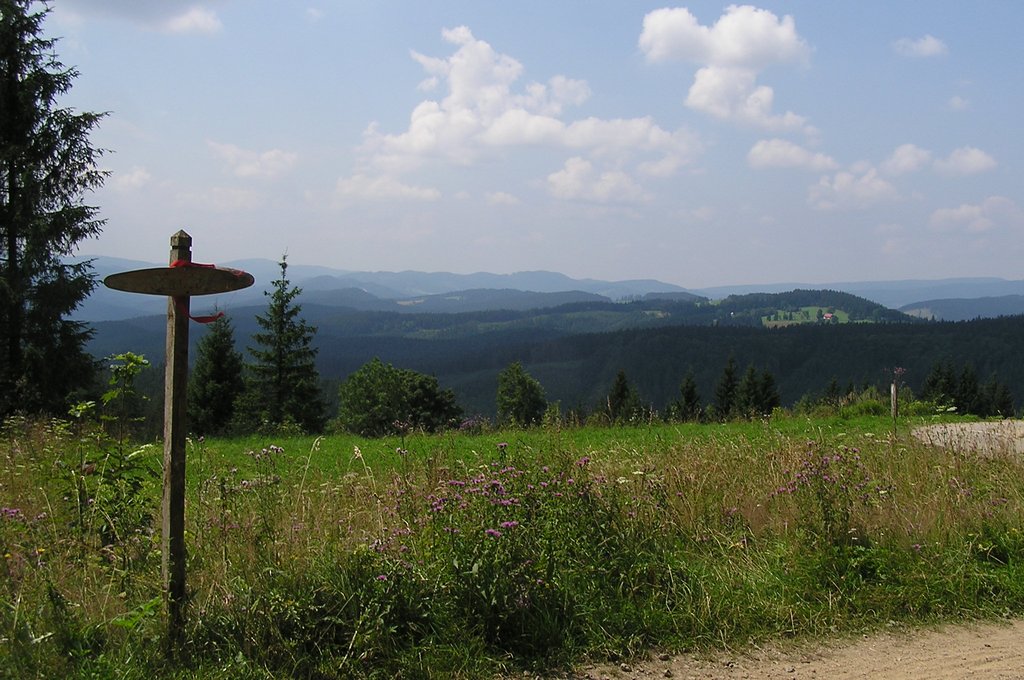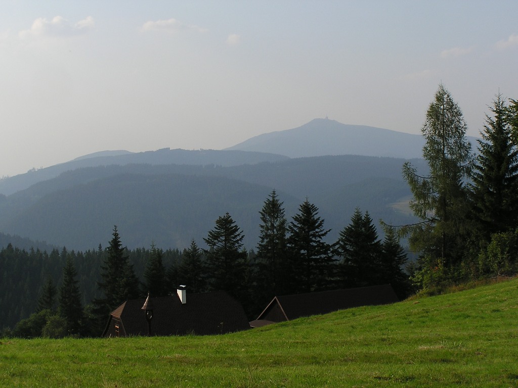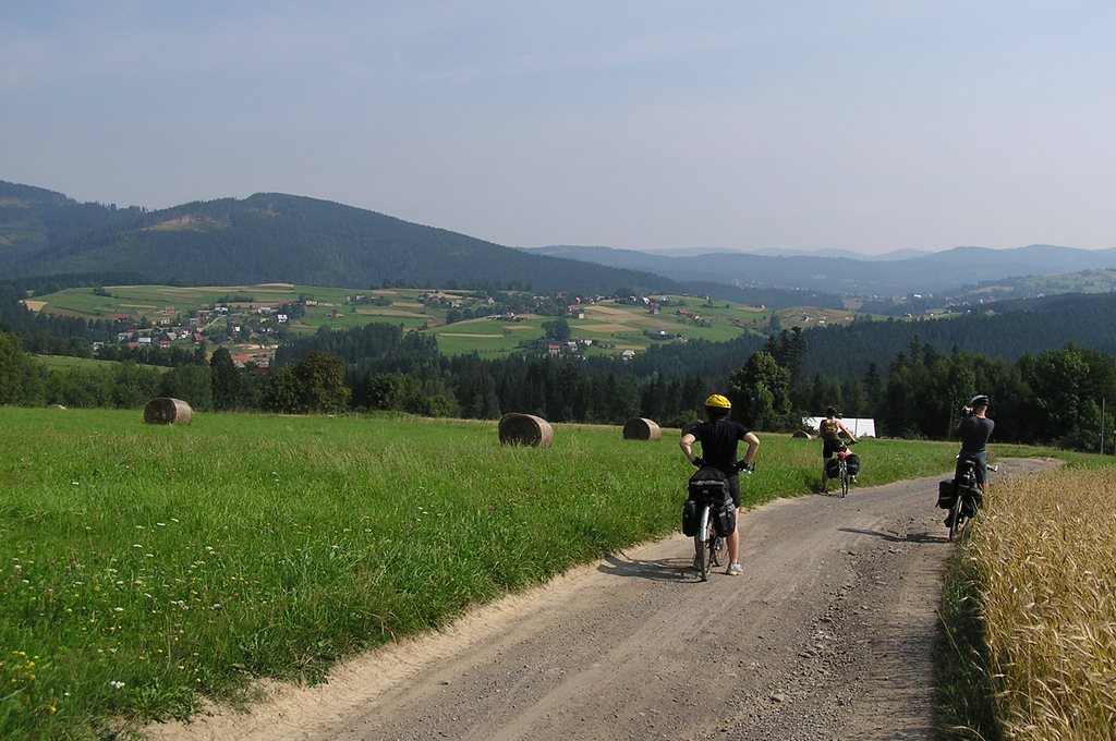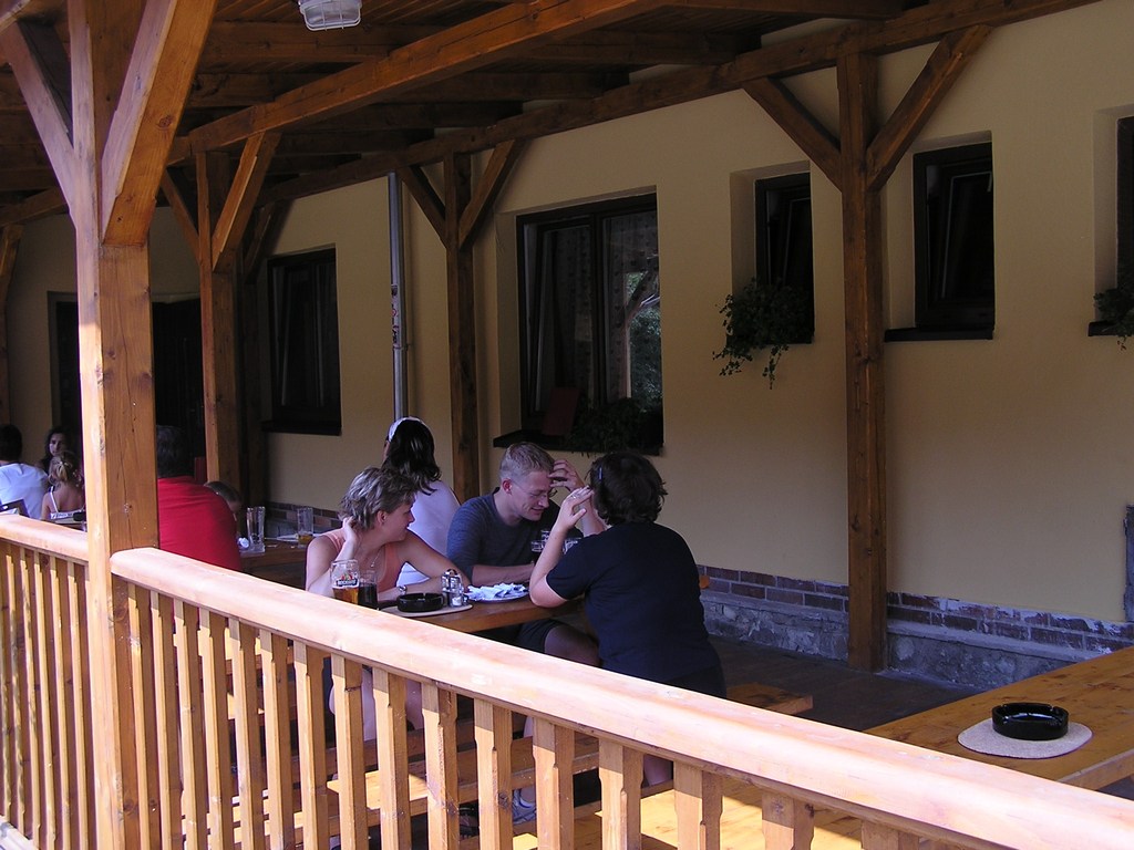 Tady už na nás čekala i mamka s gulášem, teplou sprchou a borůvkovým koláčem. Po večeři jsme načali lahev vynikajícího calvados z místních jablek, kterou jsme statečně dopili u ohně. Kolem půlnoci jsme se uklidili do peřin. Ráno opět pražilo slunce, posnídali jsme venku, naplánovali trasu a velmi zvolna vyrazili. Autem jsme byli odvezeni na Konečnou, vyzvedli si kola a nezbylo nám než vyrazit. Z Konečné jsme spadli do údolí Černé, kde jsme se napojili na zelenou, po které jsme vystoupali na Bílý kříž. Tady jsme obdivovali výhledy, ale i neuvěřitelný totáčský hotel. Z Bílého kříže ovšem nevede žádná silnice naším směrem, nechceme-li jet vnitrozemím až do Frýdku, nezbývá nám tedy než to střihnout opět po hřebenovce. Kola z části tlačíme a s obavami pozorujeme houstnoucí mraky. Míša s Petrem se vzájemně zkouší z meteorologie, kdy Petr tvrdí, že bouřka nás nemine a Míša naopak. Přesto ale podléháme Petrovi a v panice opouštíme hřeben zpět do sedla. Po dvaceti minutách je jasné, že bouřka nebude, Petr se omluvil za přehřátý panikátor a pokračujeme dále. Místy i nasedneme na kolo. Za Polomkou jsme spadli na asfaltku a soustředíme se, abychom neminuli kritické místo – odbočku na červenou. Nepodařilo se. Sjíždíme po krásné asfaltce lemované maliním, ale je nám jasné, že je to až příliš velká idyla - asfaltka míří do jiného údolí, než potřebujeme. Nakonec jsme našli rozcestník, odkud nás opět štěrková cesta dovedla na správnou asfaltku, po které jsme spadli přes Horní Lomnou do Dolní Lomné. Začíná krápat a pořádně se rozprší ve chvíli, kdy dosáhneme doporučené restaurace U Mánesa. Jsou čtyři hodiny, čas oběda. Sedíme na zahrádce, cpeme se krajovými specialitami (např. placky se slaninou a kyselou smetanou, halušky, houbová polévka apod.) a čekáme, až to přejde. Za dvě hodiny jsme se rozhodli, že pokud tu nechceme nocovat, musíme vyrazit.