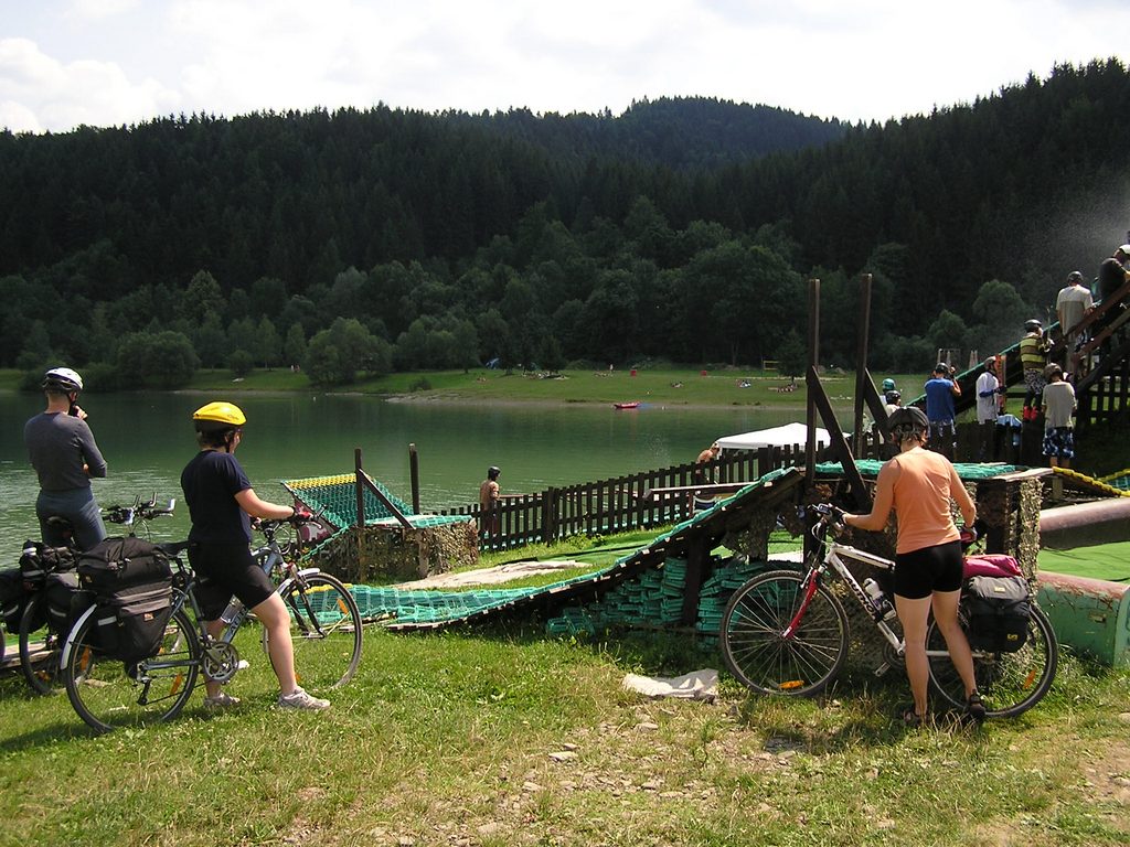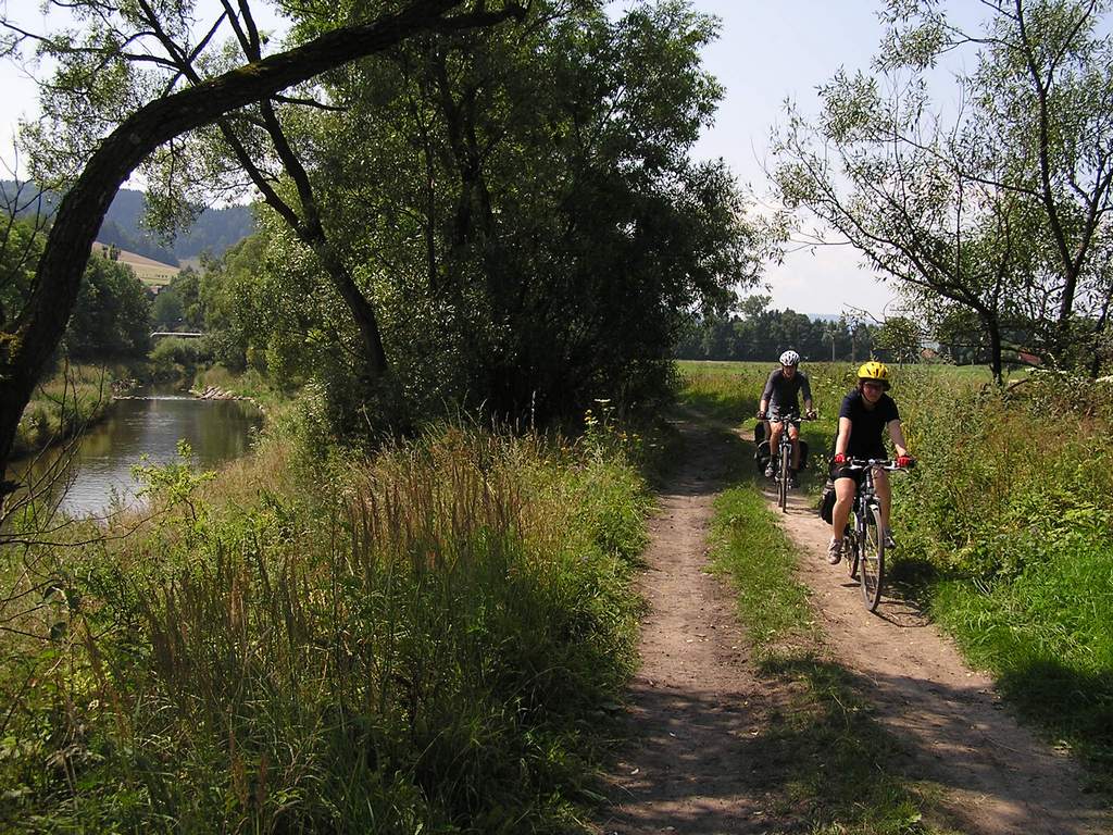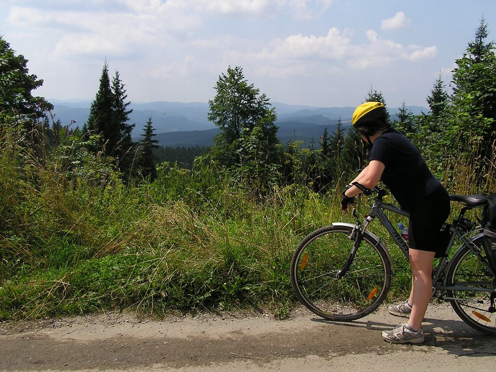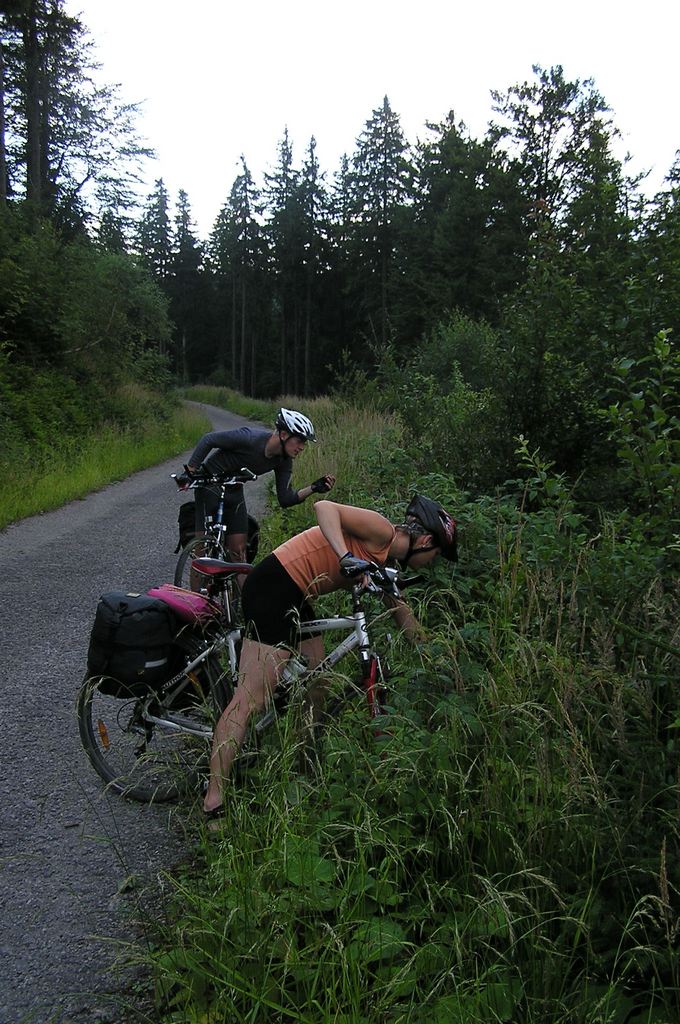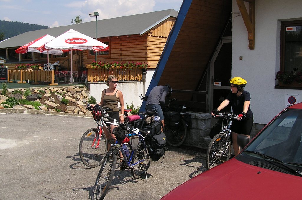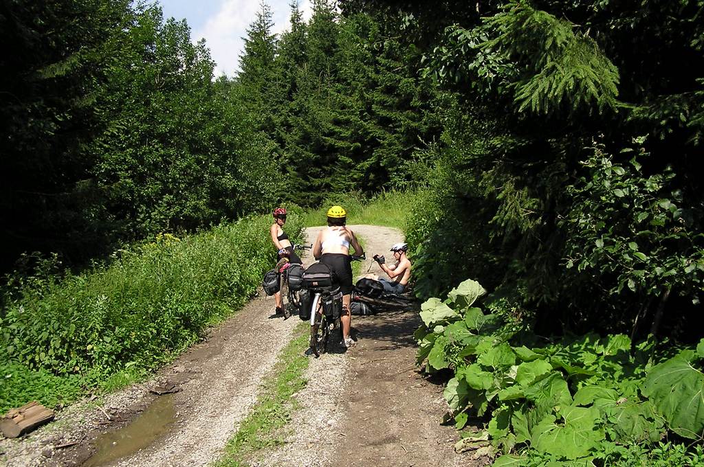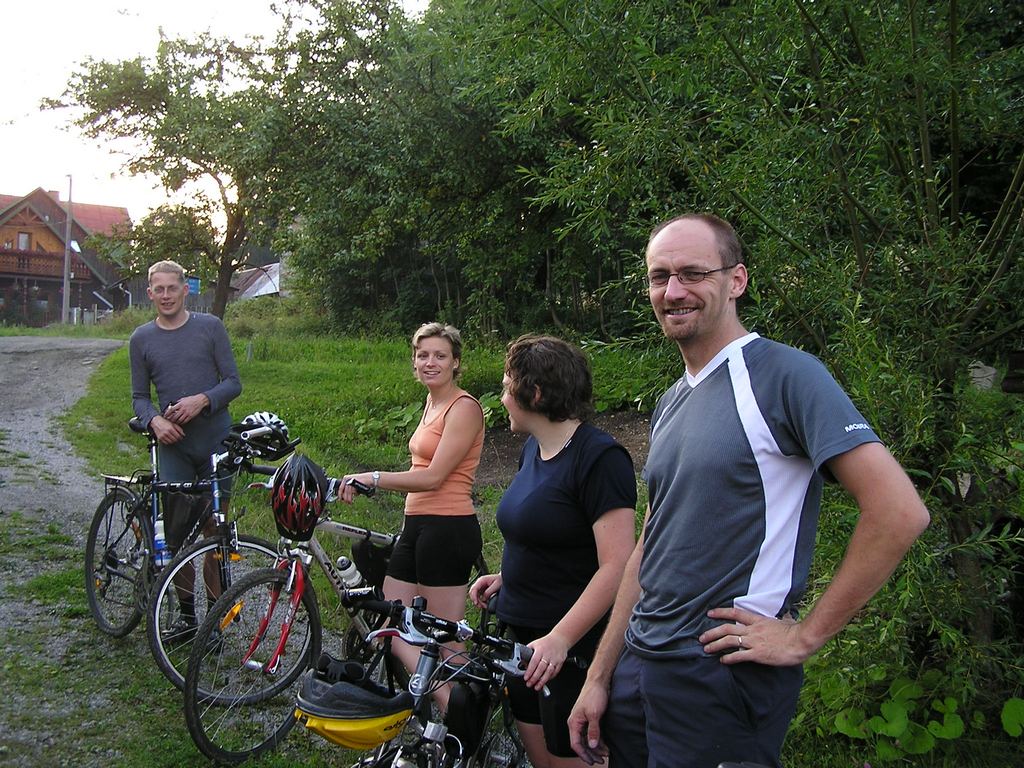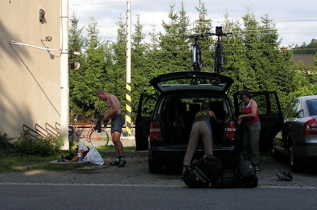 Cestou do Hranic nám ještě Míša stihl zajistit dva noclehy s polopenzí zdarma a před devátou už jsme vystupovali v Hranicích na nádraží. Zkompletovali jsme Misíkovic kola, zabezpečili vůz a zakoupili jízdenky na zpožděný osobní vlak do Vsetína. Ve Vsetíně jsme Němčákovým narušili romantický večer bez dětí, dostali jsme skvělou večeři, popili něco valašského mojita (se slivovicí), popovídali a kolem jedné jsme se ukládali. Ráno jsme vyrazili po cyklostezce směrem do Huslenek, kde oficiálně začínala naše etapa. Vyfotili jsme se před nádražím, doplnili zásoby a vyrazili jsme pohodlnou stezkou proti proudu Vsetínské Bečvy. Přes Halenkov, Nový Hrozenkov jsme dorazili do Karolinky, kde jsme na koupališti chvíli zevlili na místní atrakci – skoky do vody na lyžích či snowboardu. V Karolince jsme našli báječnou hospodu se zahrádkou a neuvěřitelnými cenami – byl právě čas oběda a také čas vyměnit píchlou duši na mém kole. Po obědě putujeme do Velkých Karlovic, kde zakupujeme frgále a odtud už se cesta prudce zvedá na Třeštík. Ze začátku celkem pohodová asfaltka ke konci lesní úvozová cesta, kde se kolo vzpínalo na zadní. Po cca čtyřech kilometrech (z toho dva pěšky) jsme dobyli sedlo Třeštík. V hospodě nemají kofolu, takže chvíli pozorujeme, jak se všude před námi blýská a po krátkém odpočinku pokračujeme dál na Bumbálku. Odtud se prudce spouštíme po žluté značce přes Salajku a uhýbáme údolím Smradlavy vzhůru a přes krásné louky se sápeme na vrch Bobek. V sedle pod Bobkem propadáme malinovému šílenství a po půl hodině pastvy pokračujeme štěrkem skrz chatovou osadu, až jsme se tlačíce kola vyhoupli na vrch Bobek. Usedáme na louku s krásným výhledem na Lysou, Bílý kříž a celé Beskydy. Bohužel ve vzduchu stále visí bouřka, není tedy moc vidět. Míša odtud potvrzuje druhý nocleh u Režných na chalupě. Zavrhli jsme asfaltku do údolí přes Bílou a vyrazili jsme po červené hřebenovce. Ta je více či méně sjízdná, největší past jsou růžovky, které by se daly brát kosou. Když s Monikou už deset minut výskajíce skáčeme od jednoho hejna k druhému, sdělí nám kluci, že dál je to pořád po červené a zmizí. Stejně jsme je zanedlouho našly sedět v borůvčí… Kolem sedmé hodiny jsme se opět po dramatickém klesání vyloupli na Konečné, kde už na nás čekal Míšův tatínek s autem. Ustájení kol nám dojednal u místní paní v garáži a autem si nás odvezl na chalupu.