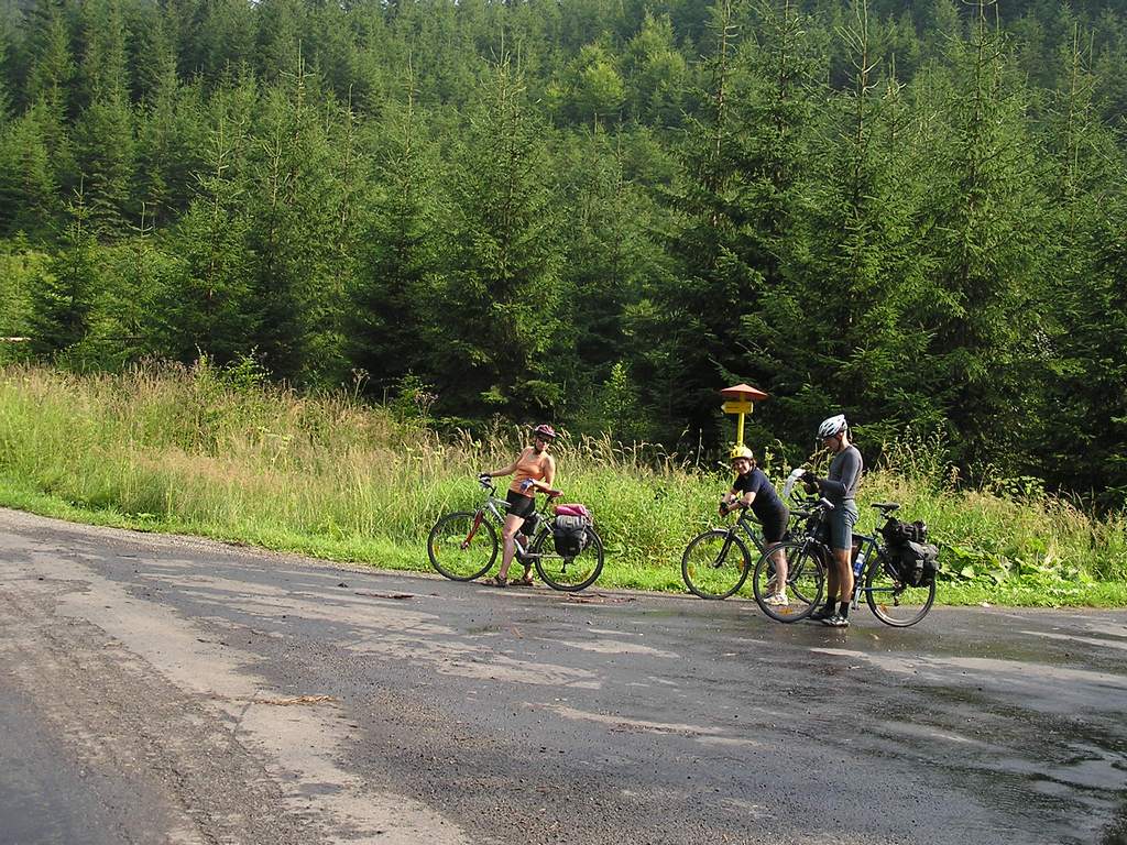 Ráno jsme měli v úmyslu dojet přes hřeben do obce Bukovec a nasnídat se tam, ale mé již podruhé píchlé zadní kolo velí jinak. S Monikou tedy jedeme do krámu pro snídani a Míša s Petrem dělají mechaniky. Po romantické snídani na asfaltu jsme vyrazili po panelce na hřeben a odtud jsme přes louky s nádherným výhledem spadli do Bukovce. V Bukovci jsme ostře uhnuli doprava a po asfaltce jsme stoupali na Bahenec. Stoupání poměrně ostré, ale dalo se to vyjet. Nahoře jsme usedli do typicky totáčského „lepšího hotelu“ – terasa bez obsluhy, parkoviště pouze pro personál hotelu, na záchodě zavlhlý smradlavý ručník apod. Dali jsme si kofolu a pivo a po polní cestě vyrazili dál. Dalších cca 6 km na Filipku jsme občas mohli i nasednout na kolo, ale pořád jsme měli cesty sušší než naši předjezdci (většina bahnitých louží se dala projet, aniž bychom si nabrali do bot). Z Filipky prudce padáme po štěrkové cestě a poté už po asfaltu sjíždíme do Nýdku. Jsou tři hodiny, čas oběda. Místní pajzl vypadá, že jediná nabídka je vepřo-knedlo, ale dostane se nám obsáhlého jídelního lístku. Sedíme na terase na vrzajících židlích a je nám báječně. Jako již tradičně, dává se do deště. Chvíli vyčkáváme, ale dnes to vypadá, že to jen tak neustane. Nezbývá nám tedy než vyrazit. Během chvilky jsme totálně promočení, takže nějaké okliky směrem k hranici zavrhujeme a míříme rovnou do Třince a Těšína. Třinecké železárny za hustého deště a těžkých mraků jsou opravdu impozantní podívaná. Nám ale crčí voda z helem a do brašen teče, takže pokračujeme dál. V Těšíně jsme provedli průzkum, našli jsme si základnu v příjemné kavárně a snažíme se po telefonu sehnat nocleh. S postupujícím časem se zvyšuje částka, kterou jsme za suchý nocleh a sprchu ochotni dát, ale nepomáhá to. Všechno je beznadějně plné. Nakonec jsme uspěli v „ubytovacím zařízení Kosmos“ v Karviné.