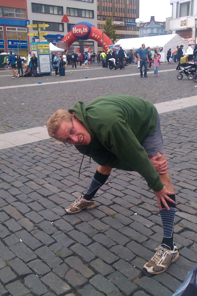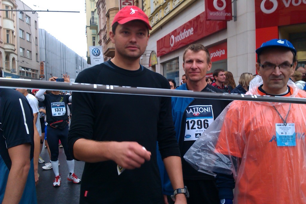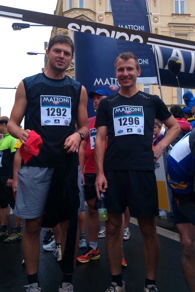 Neděle už od rána nabízela pošmourné počasí s občasným mrholením a teplotou kolem 17°C. Na běh to ale prý nebylo špatné. Město žilo půlmaratonem. Všude se rojili sportovci různých barev i velikostí a napětí se tetelilo vzduchem. Kluci po ránu vypadali docela dobře, ale stejně jsem s nimi soucítila. Jak by asi bylo dneska mě po včerejším plavču a 90 km v nohách…. Lehce po poledni bylo Mírové náměstí plné nejen různých stánků, podií, halasu a hudby, ale také spoustou závodníků a ještě větším počtem nás – čumilů. Cca 4000 závodníků se rozběhlo za zvuku Smetanovy Vltavy a než proběhli všichni startovní čarou, uplynuly asi 4 minuty. Díky Lindě jsme měli jasný plán, na jakou část tratě se vždy jít podívat, abychom tam kluky mohli sledovat. Tak se stalo, že jsme je viděli cca 5x za závod a mohli sledovat výraz jejich tváří. Kromě oněch 4 půlželezňáků jsme sledovali ještě Žahyho a Enrica, kteří přijeli jen na běh.