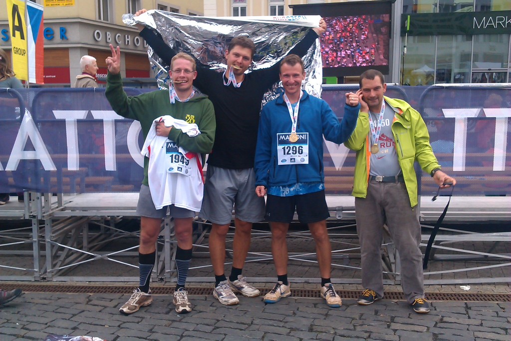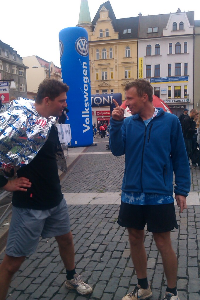 Až mě překvapilo, jak mě to sledování závodu bavilo a navíc ty necelé 2 hodiny strašně rychle utekly. Keňští běžci byli v cíli už za hodinu po startu – hrůza. Nicméně i naše „ovečky“ byly úžasné. Přiznávám se k slzavému dojetí, když jsem je jednoho po druhém viděla dobíhat do cíle. Postupně jsme se všichni sešli na náměstí. Kluci pod hliníkovými fóliemi. Dojmů bylo spoustu, ale naštěstí převažovala radost a úleva nad únavou a bolestmi. Z náměstí jsme se záhy přesunuli do penzionu a následně do restaurace, v průběhu přes internet zjistili přesné výsledky běhu. A jak to tedy dopadlo?