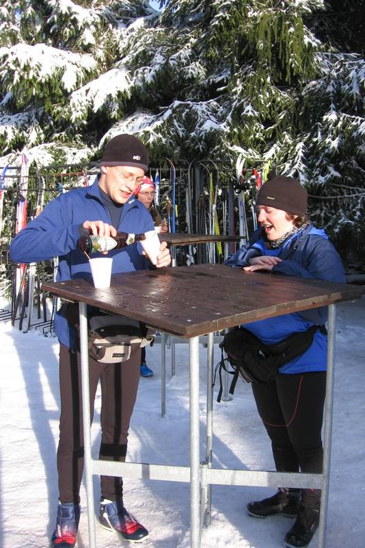 Vyrazili jsme do stopy s tím, že času není příliš nazbyt, protože nás večer čeká další program a že se tudíž musíme nejpozději do půl čtvrté vrátit na chatu. Přes Vládní jsme nastoupali na Olivetskou horu a přes Bílou Kuchyni jsme dorazili ke kiosku na Hřebínku. Tam po povinném svařáku a sušenkách jsme dohodli, že dojedeme na Krásnou Máří, tam otočíme a pak po panelce sjedeme na Kristiánov a Novou Louku, kde se všichni i se sedmnáctkařema sejdeme. S Káčou překvapivě zjišťujeme, že bruslit se dá i bez toho, aby člověk vyplivl plíce, a zbytek dne i celého Silvestrovského volna trénujeme hlavně tento styl. Kvůli nehezkému počasí je výlet zcela bez výhledů, a když jsme pak dorazili na Šámalku bylo tam zcela nepřekvapivě plno. Na stojáka jsme si dali po pivu a vyrazili vstříc dalšímu programu do Bedřichova.