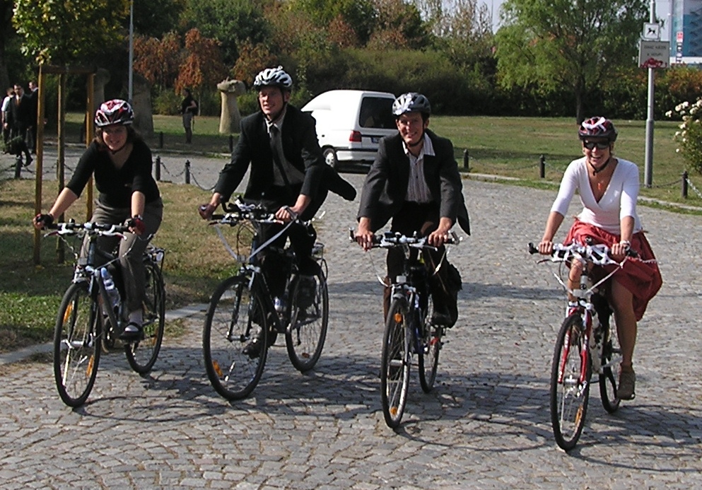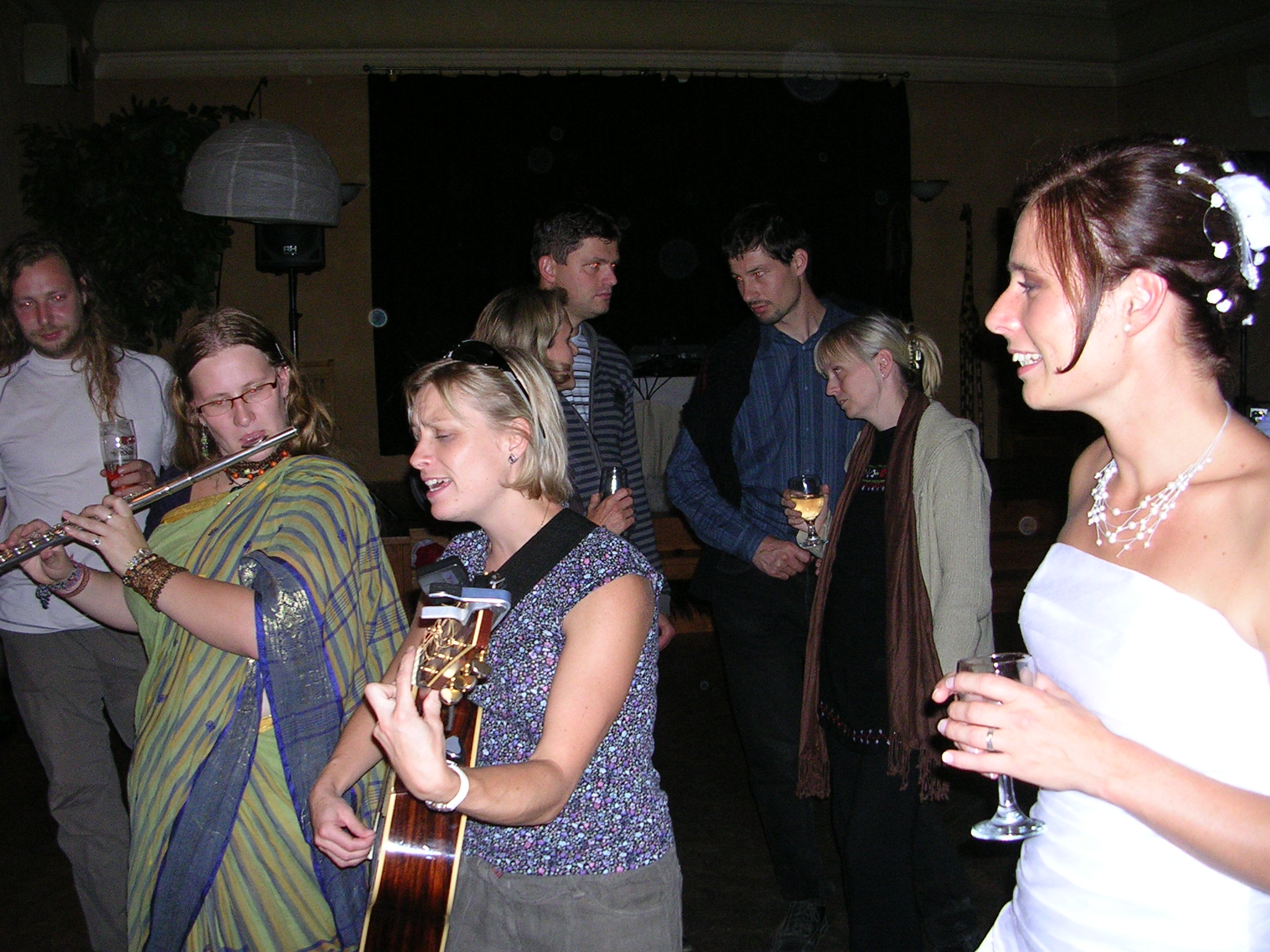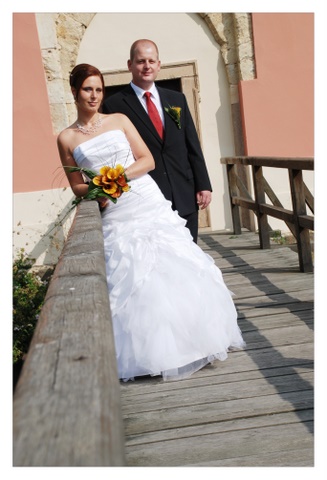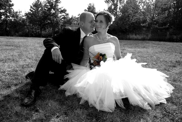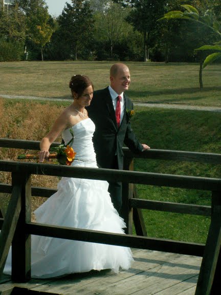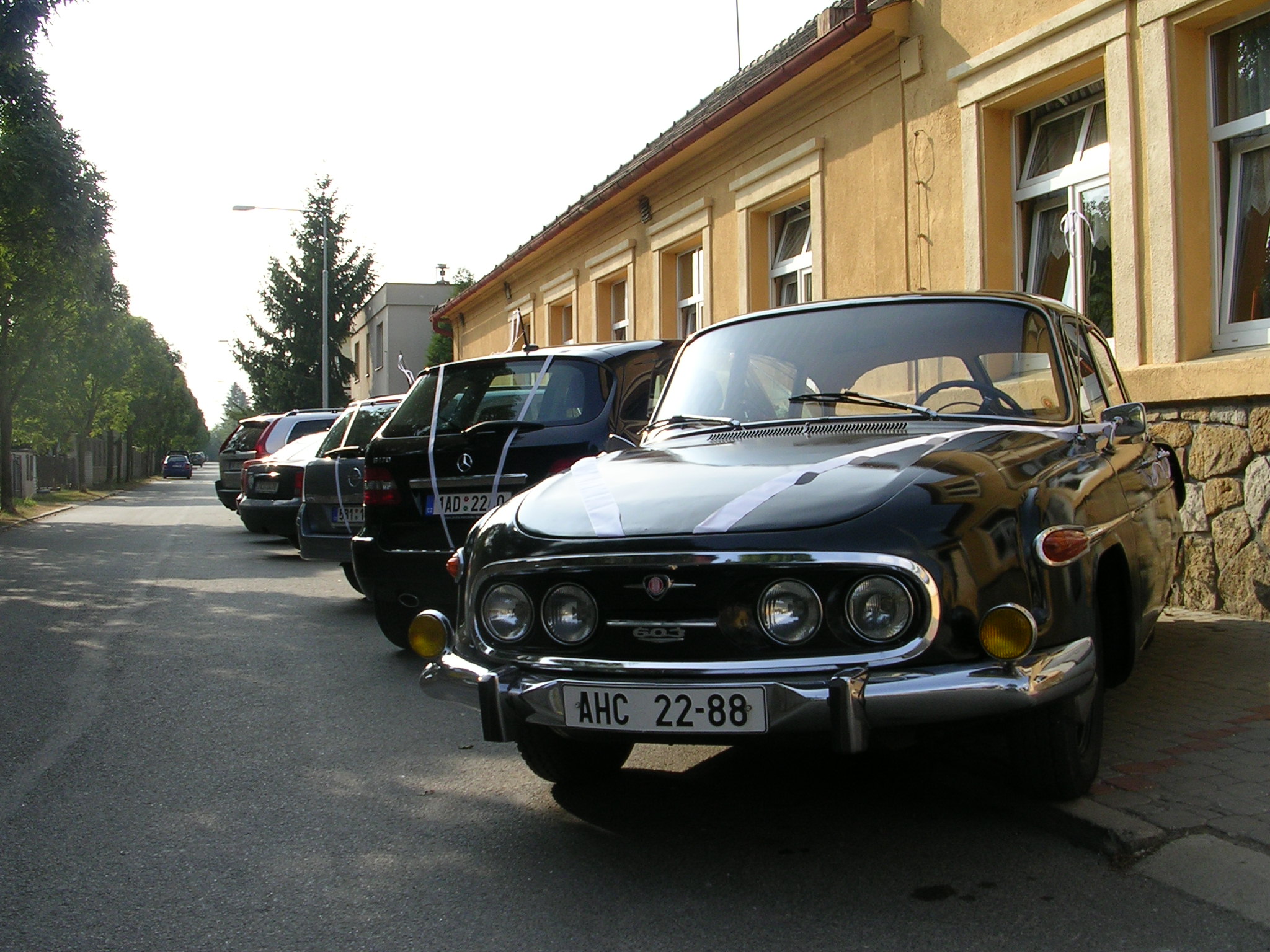 Celých pět měsíců jsme se snažili připravit a zorganizovat náš velký den a pak ten JEDEN den utekl tak rychle… :-). Vesměs všechno proběhlo podle našich představ, až na to, že ještě půl hodiny před obřadem jsem neměla ženicha, který někde na Jižní spojce hledal autobus se svou ztracenou rodinou z Krkonoš. Takže plánovaný sraz v kavárně hodinu a půl před obřadem se ukázal jako velmi vhodná rezerva, i když se tam sešlo asi 15 lidí z celkového počtu 50. Nakonec jsme dorazili i s autobusem Beneckých. U Chodovské tvrze na nás již čekala 20ka s vyzdobenými koly, 23ka a Apači.
