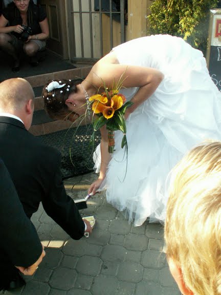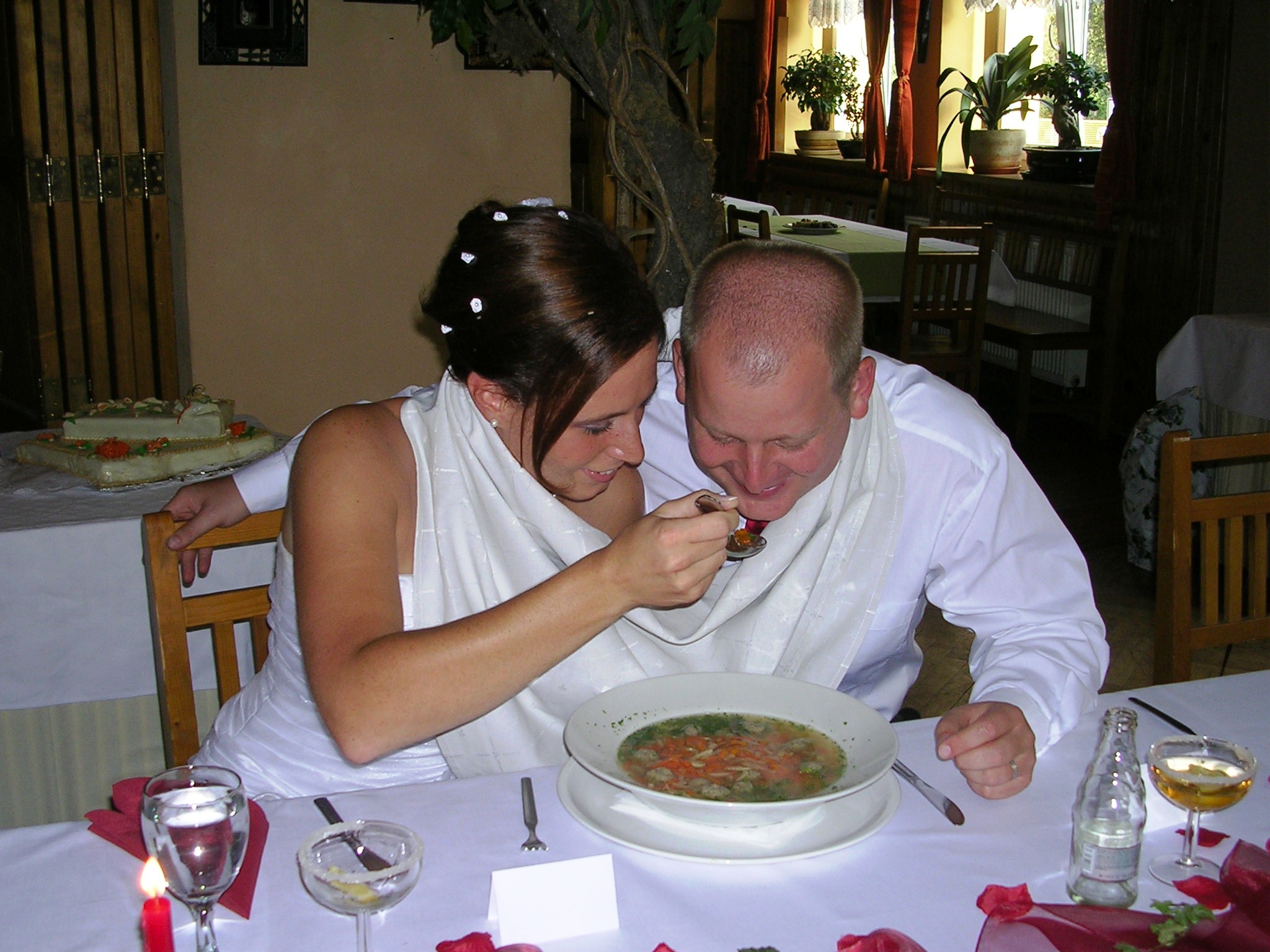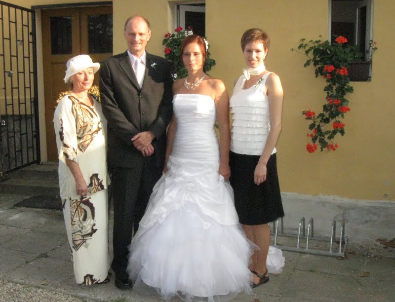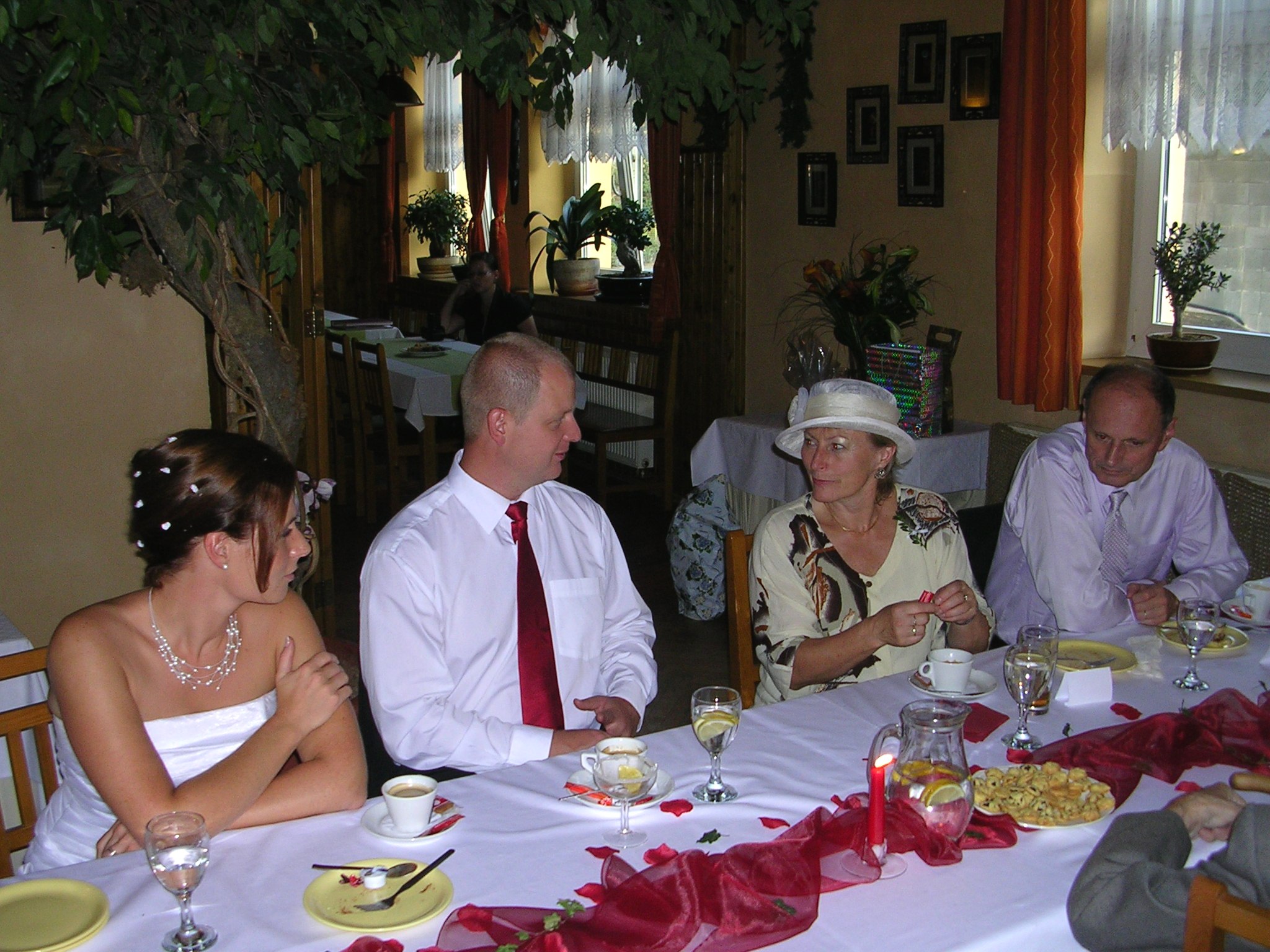 Díky Petrofovi a všem, kteří na nás vytasili menší či větší pravdy, se mi podařilo během proslovu neuronit ani slzu. Jen obřadní síní se čas od času ozývaly decentní výbuchy smíchu. Při gratulacích jsem si dojetí už plně „užívala“. Před tvrzí jsem se pak musela s úsměvem pokusit o přeřezání klády, odemčení koule, která nějak Romčovi přirostla k noze a pak v opravdu širokých krásných bílých šatech zvládnout několik desítek metrů na trakaři. Uff, ach ty krkonošské zvyklosti :-). Na oběd do Zelenče jsme se již všichni až překvapivě dostali v pátek odpoledne bez potíží, ztrát a docela i rychle. Přípitek proběhl, oběd proběhl, krájení dortu proběhlo a pak už se konečně krkonošská rodina posilněna dlouhou ranní cestou do Prahy, kterou si patřičně užívala, mohla roztáhnout na zahrádce restaurace v Zelenči. Má rodinka si spořádaně povídala u stolu.