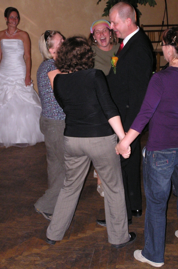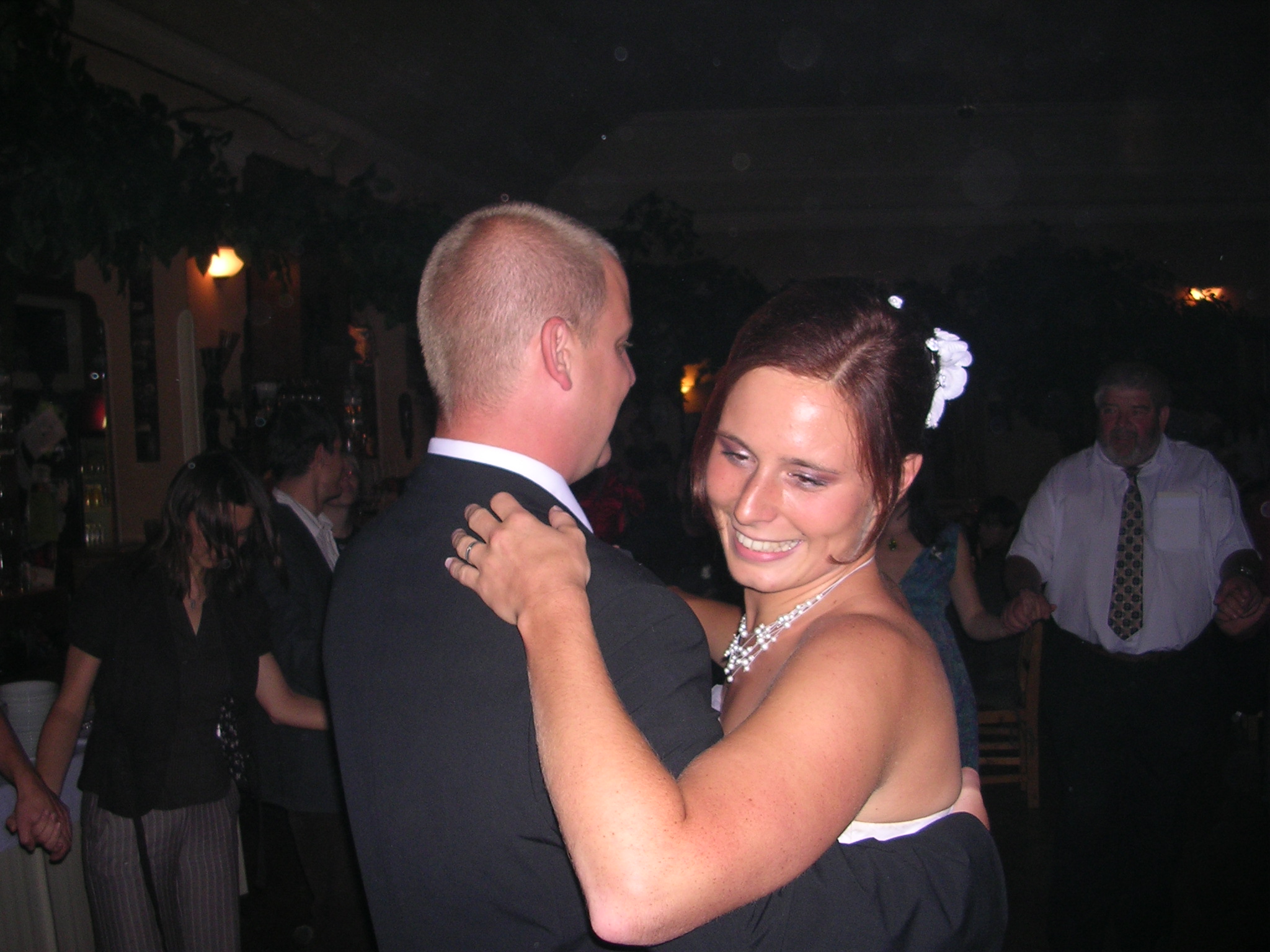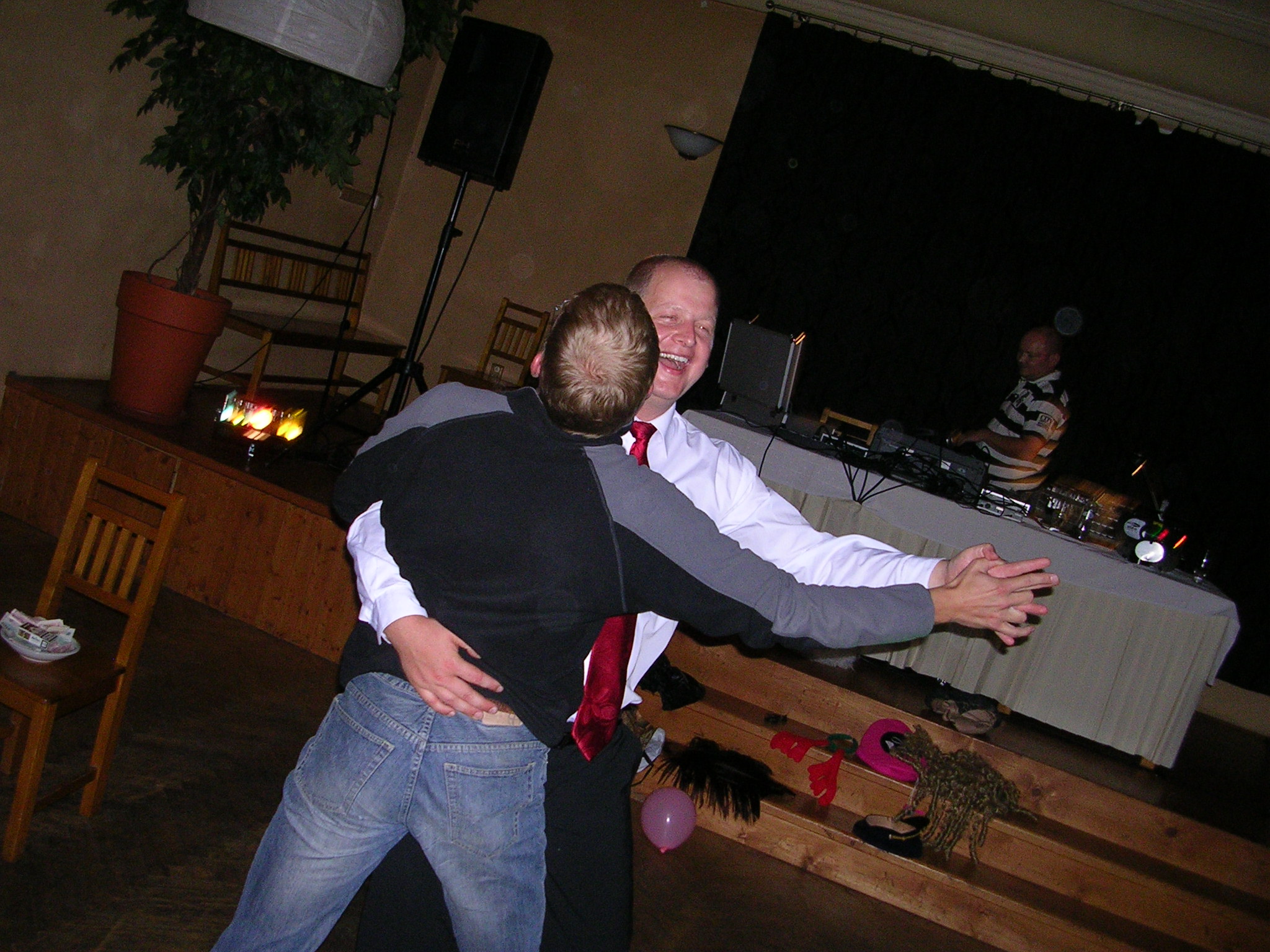 A za nedlouho už odbíjela 18. hodina a všichni pozvaní na večer se začínali trousit krásně včas. Zvládli jsme společně s Romčou taneček pro novomanželský pár. Původně jsem si chtěla zatančit waltz, nicméně když jsme to společně zkoušeli, dospěla jsem k názoru, že neutrální pomalý ploužáček bude před zraky 100 lidí zcela jistě bezpečnější varianta. V podobném duchu se nesly i tance pro nevěstu a pak ženicha. A pak přišla ta diskotéka :-). Děkuji mnohokrát ženichově rodině, že parket nenechali ani minutku prázdný a to už samého začátku. Díky členitosti restaurace a její zahrádce si ostatní mohli vybudovat vlastní menší či větší debatní kroužky a doufám, že se i dobře najedli. Já osobně jsem se na ten připravený raut ani pořádně nezvládla podívat a jak mi potvrdili již ženatí a vdané, na vlastní svatbě se člověk nepřejí. Věřím tedy hospodě, že vás nenechala hladovět a žíznit. Alespoň to tak bylo předem domluvené.