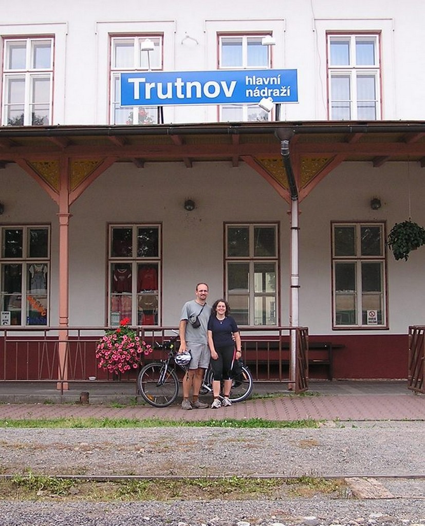 Z Prahy jsme vyrazili v 16.10 rychlíkem Krakonoš a před půl osmou jsme vystoupili v Trutnově. Cestou jsme ještě obvolali několik možností ubytování a dohodli se na noclehu v penzionu Pod Liščími kameny v Křenově. Ubytování cenově trochu výš, než jsme zvyklí (460 os), ale rozhodli jsme se, že si z toho uděláme takové trochu upocené výročí svatby, takže nám luxus nevadí. Po nezbytné nádražní fotce v Trutnově jsme vyrazili směrem na Poříčí. Vzhledem k padající tmě a nízkým mrakům jsme zbaběle ignorovali Debrnskou cyklostezku, která mířila přes kopec a zanedlouho se vracela na tu samou silnici, a vyrazili jsme rovnou po silnici přes Zlatou Olešnici do Bernatic, kde jsme uhnuli směrem na Křenov. Kolem deváté jsme dorazili do penzionu, kde jsme dostali pokoj se sprchou a televizí, k večeři bohužel už jen tatranky a kofolu (celkem jsme totiž byli v penzionu ubytovaní čtyři). No, nevadí, snídani už jsme dostali.