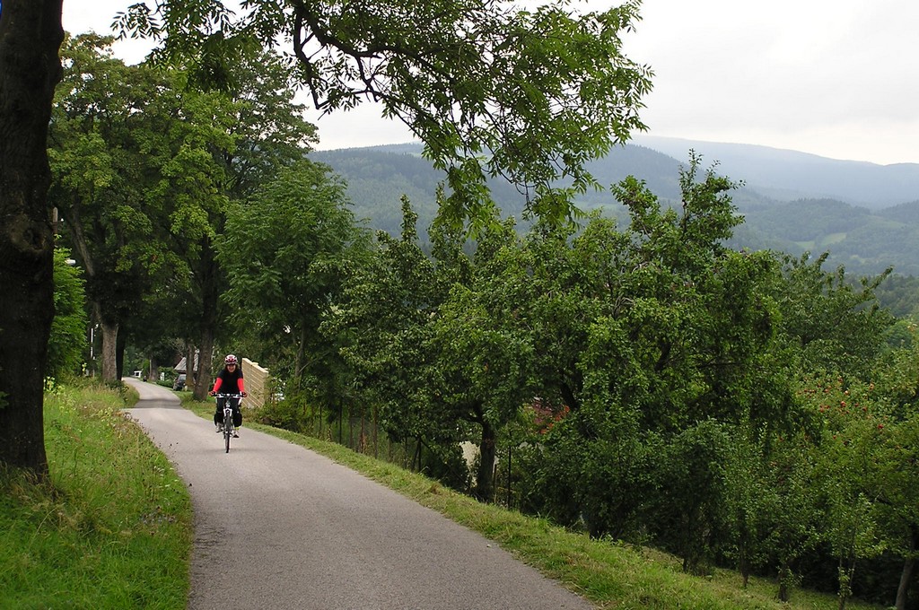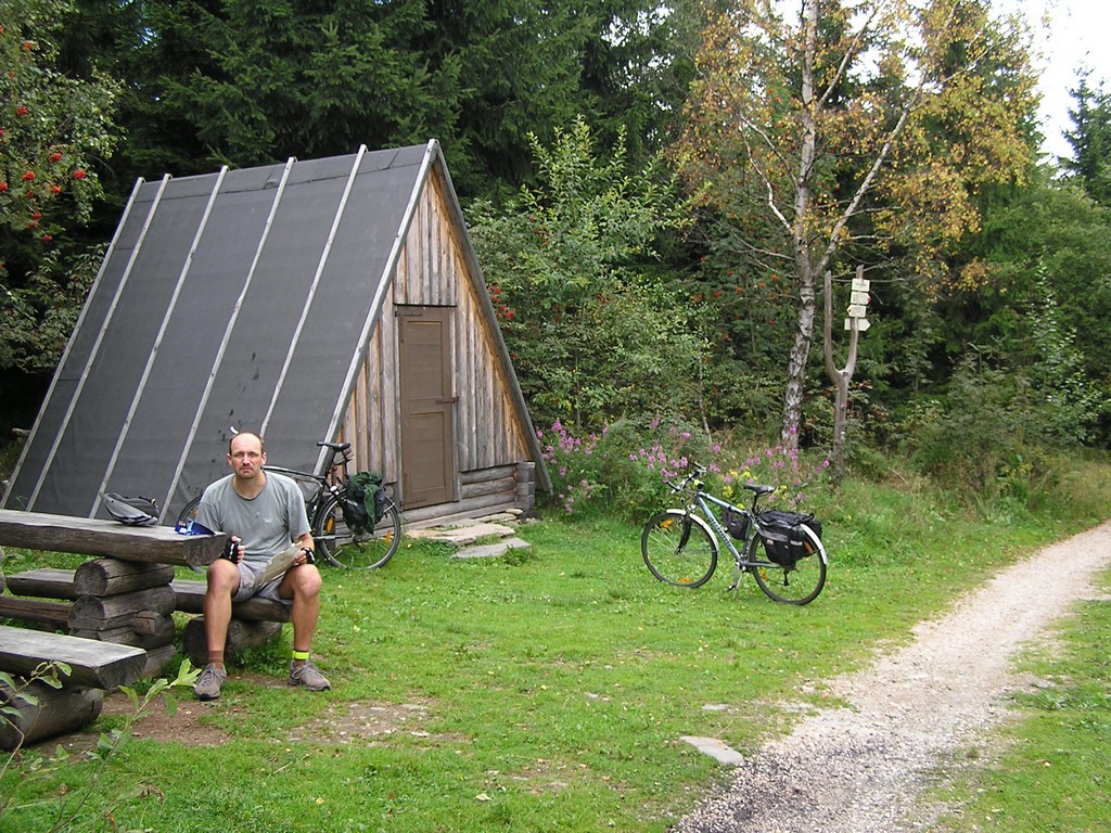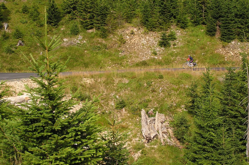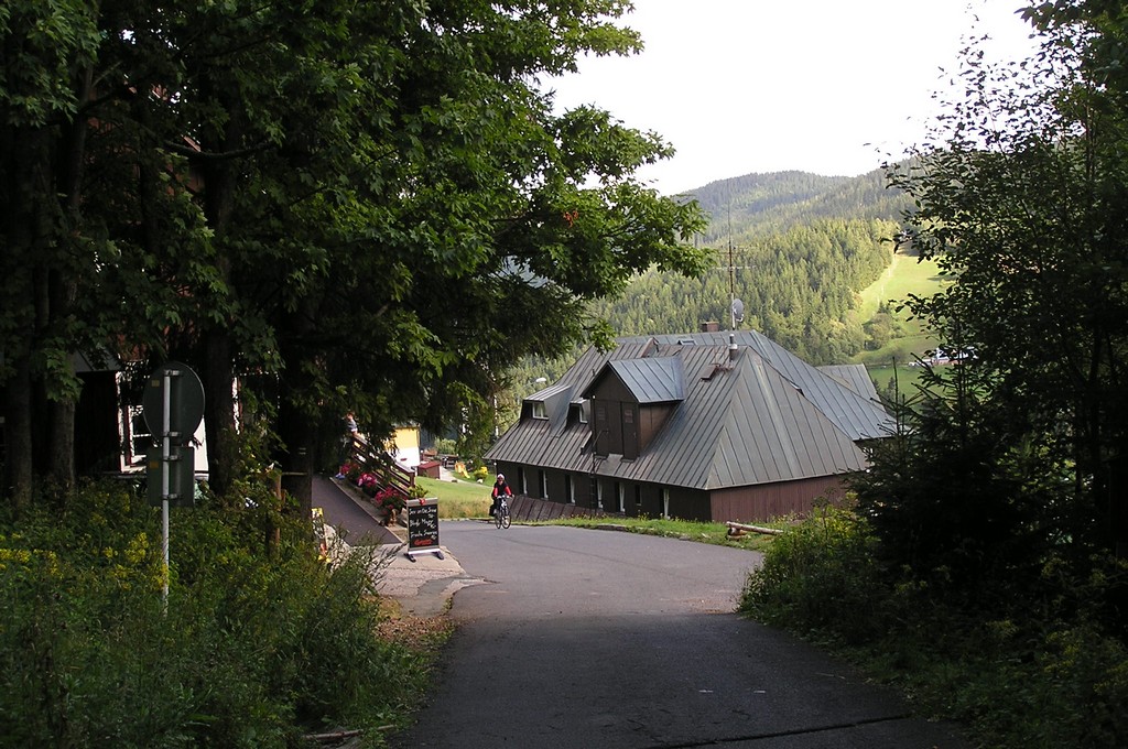 Odtud padáme po silnici do Malé Úpy a u Spáleného mlýna uhýbáme po cyklo na Janovy boudy, která nás dovede do Pece pod Sněžkou. V Peci nás nic pěkného nečekalo, a tak nám nezbylo než se zakousnout do krkonošského hřebene. Po asfaltu s mezipřistáním na Richterovkách (doporučujeme – to nejhorší máte za sebou a pivo bodne) jsme se vyškrábali na Výrovku - 1340 m.n.m. (výlet z Pece na Výrovku na kole by mi ještě nedávno připadal jako naprosto absurdní nápad). Vzhledem k pokročilé hodině jsme se již mohli kochat naprosto klidným a liduprázdným hřebenem – úžasný zážitek. Zasloužená vrcholová prémie na nejvyšším bodě objezdu a hurá k bufáči Na Rozcestí a přes Zadní a Přední Rennerovky dolů na Hříběcí boudy. Pozor – za Předními Rennerovkami nesjíždějte dál po červené přes Lahrovky (Lahrbušem), ale vemte to okolo po lyžařské magistrále – neuvaříte si brzdy a pojedete velmi příjemným sjezdem. Za Hříběcími boudami také doporučuji na silnici sjíždět po cyklo a zelené vpravo okolo; přímo po červené (kolem transformátoru) je to zbytečný držkopád. Na křižovatce doprava do kopce do Strážného, u hospody na parkovišti doprava. My jsme ještě večer pokračovali na Šestidomí, kde jsme měli domluvené ubytování (tuším, že za cca 300 Kč/os se snídaní).